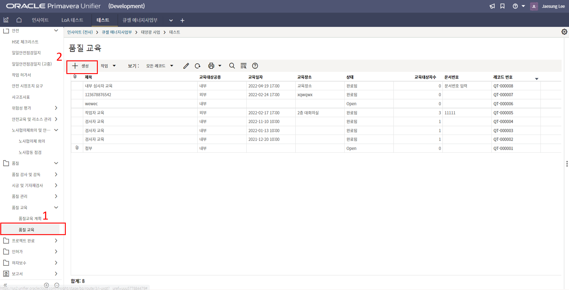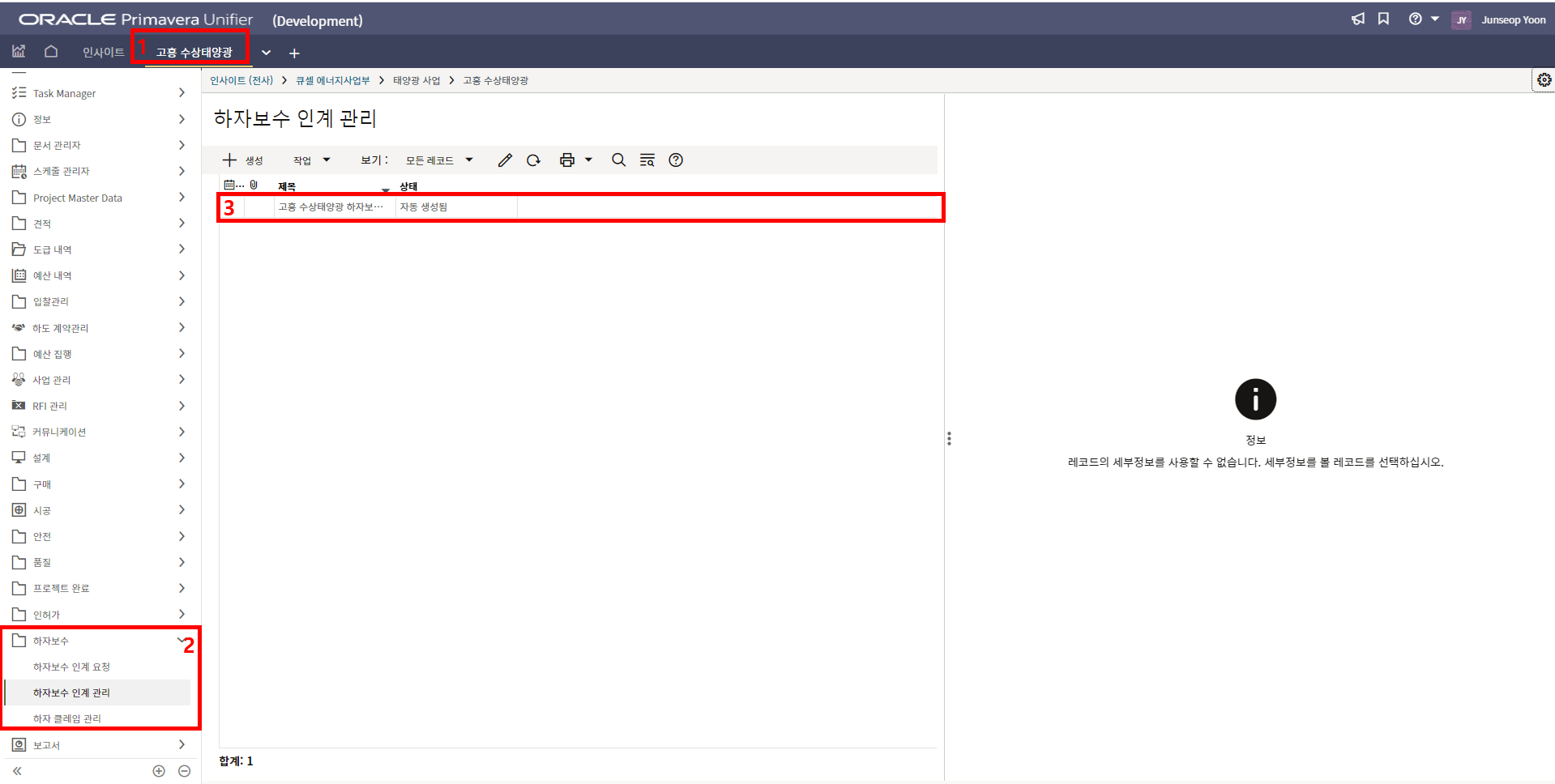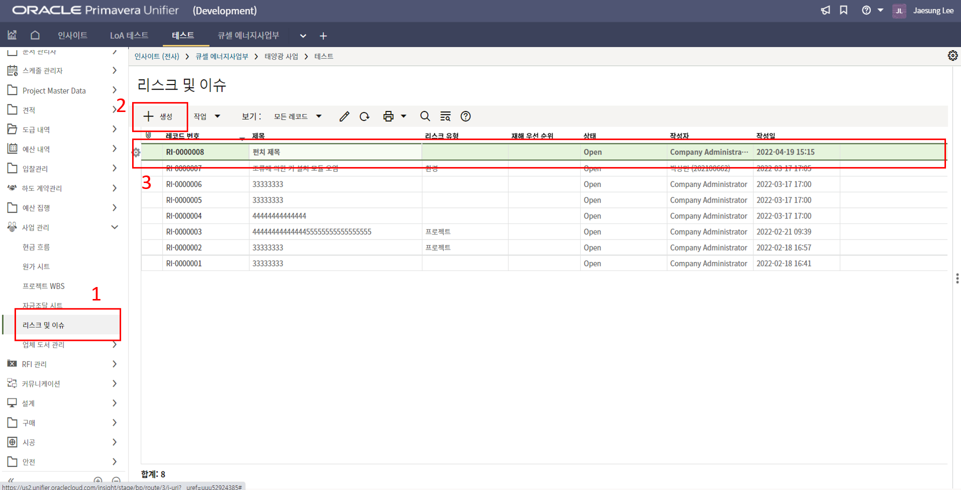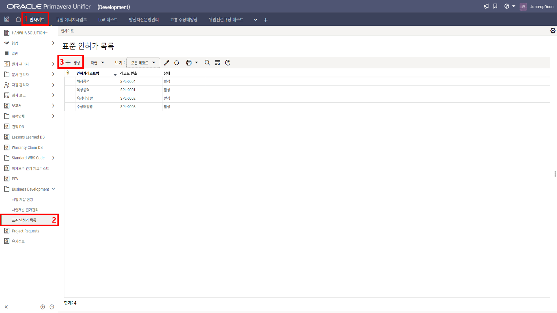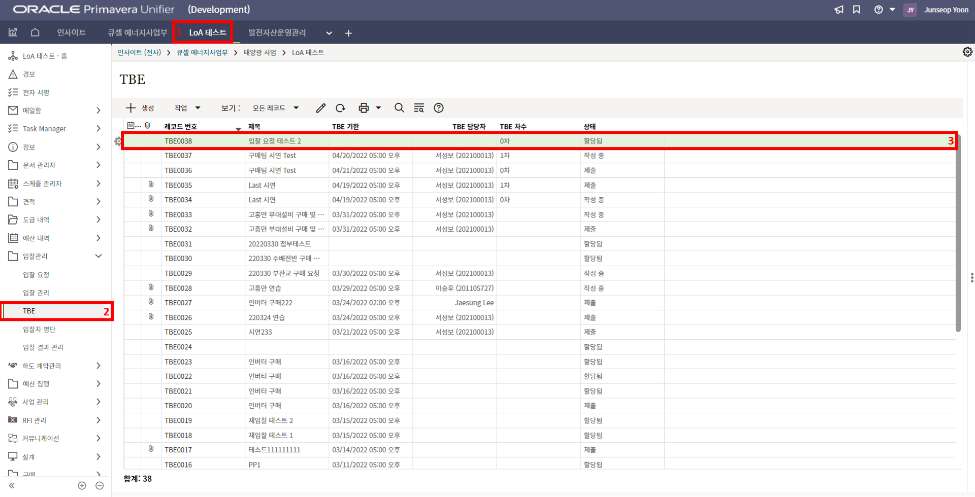 2. '1)해당 프로젝트 > 2)TBE > 3)생성된 레코드'을 클릭합니다.