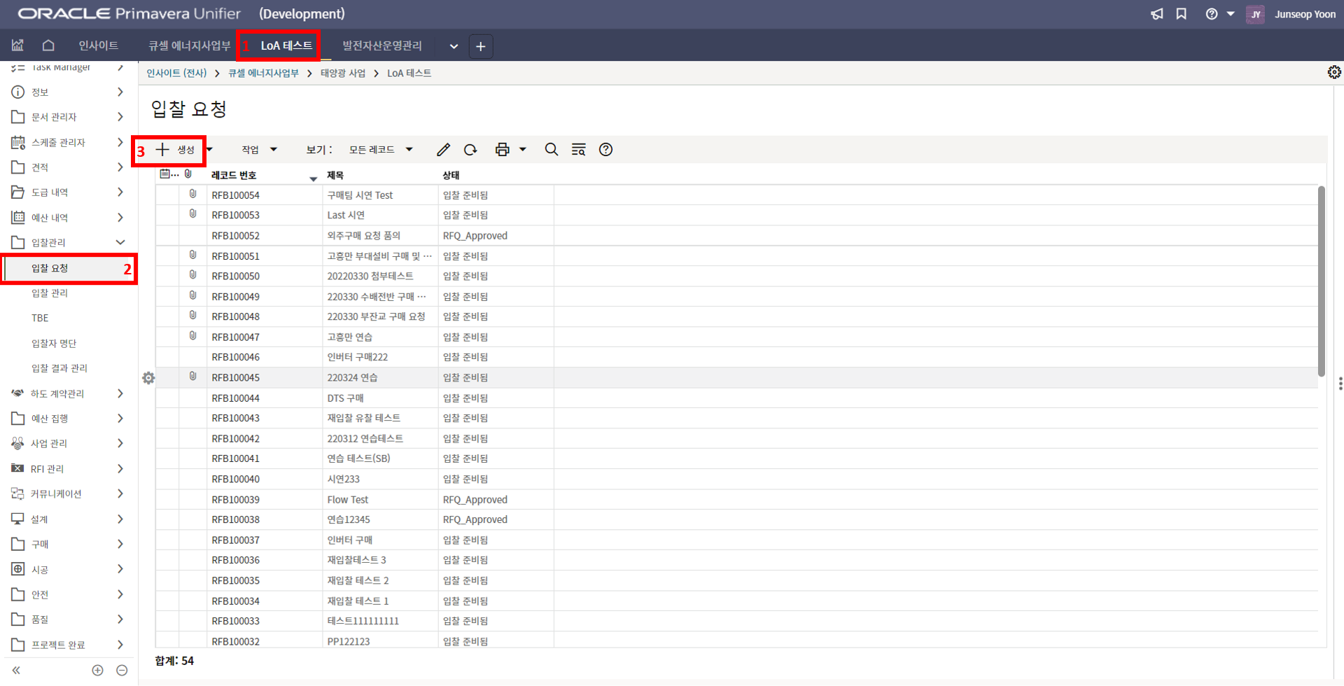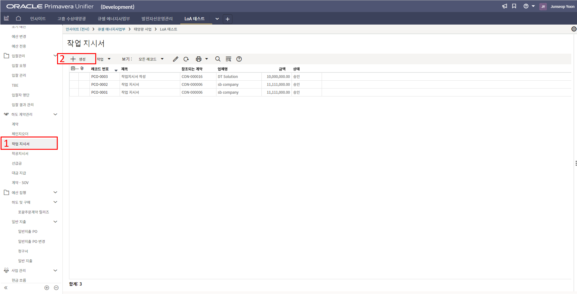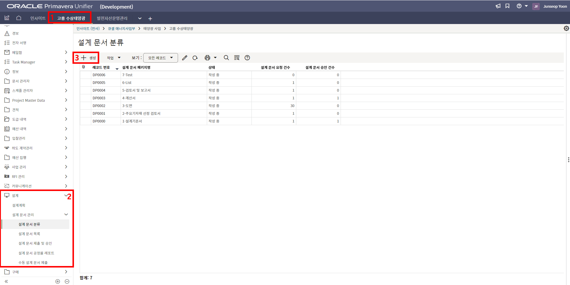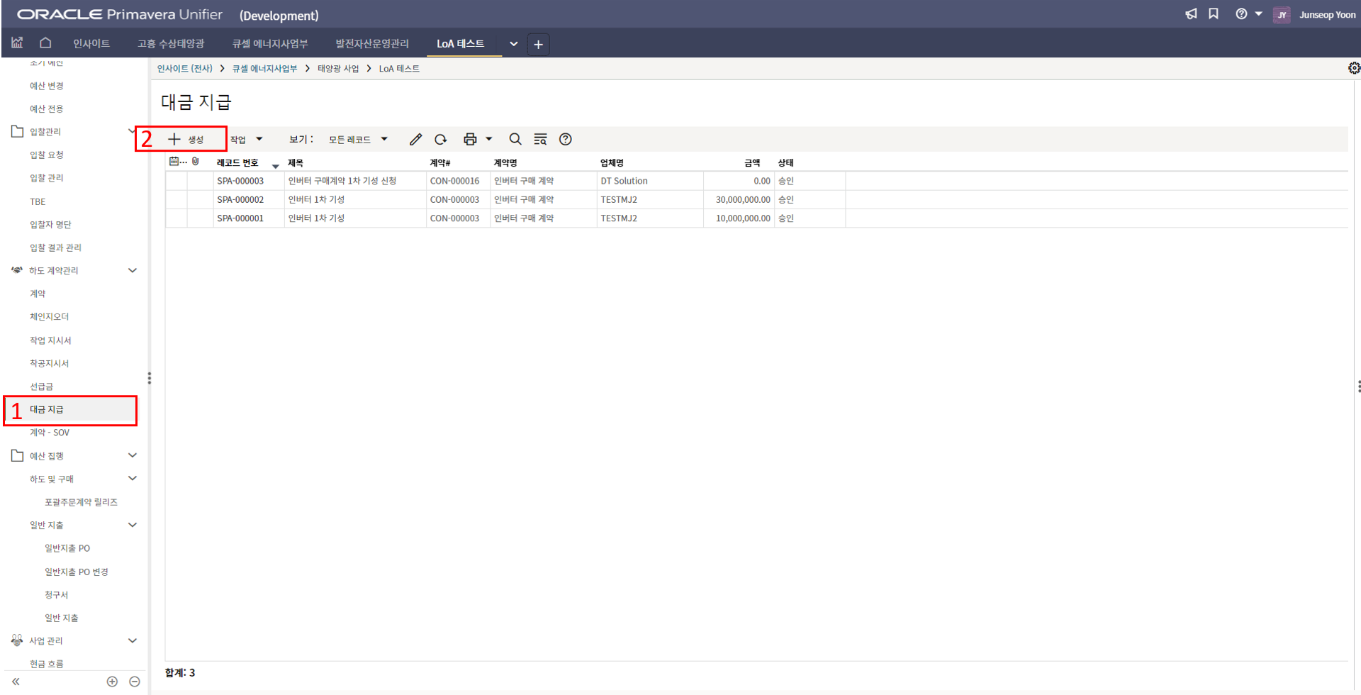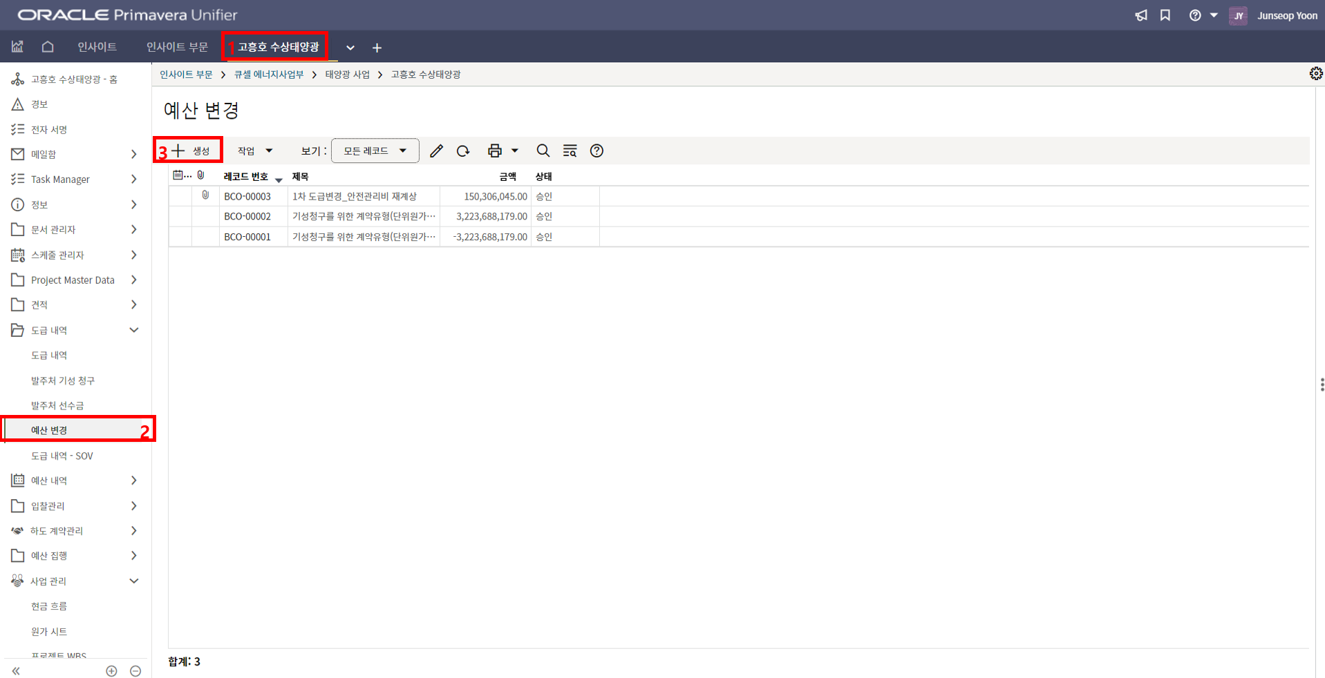 2. '1)해당 프로젝트 > 2)TBE > 3)생성된 레코드'을 클릭합니다.