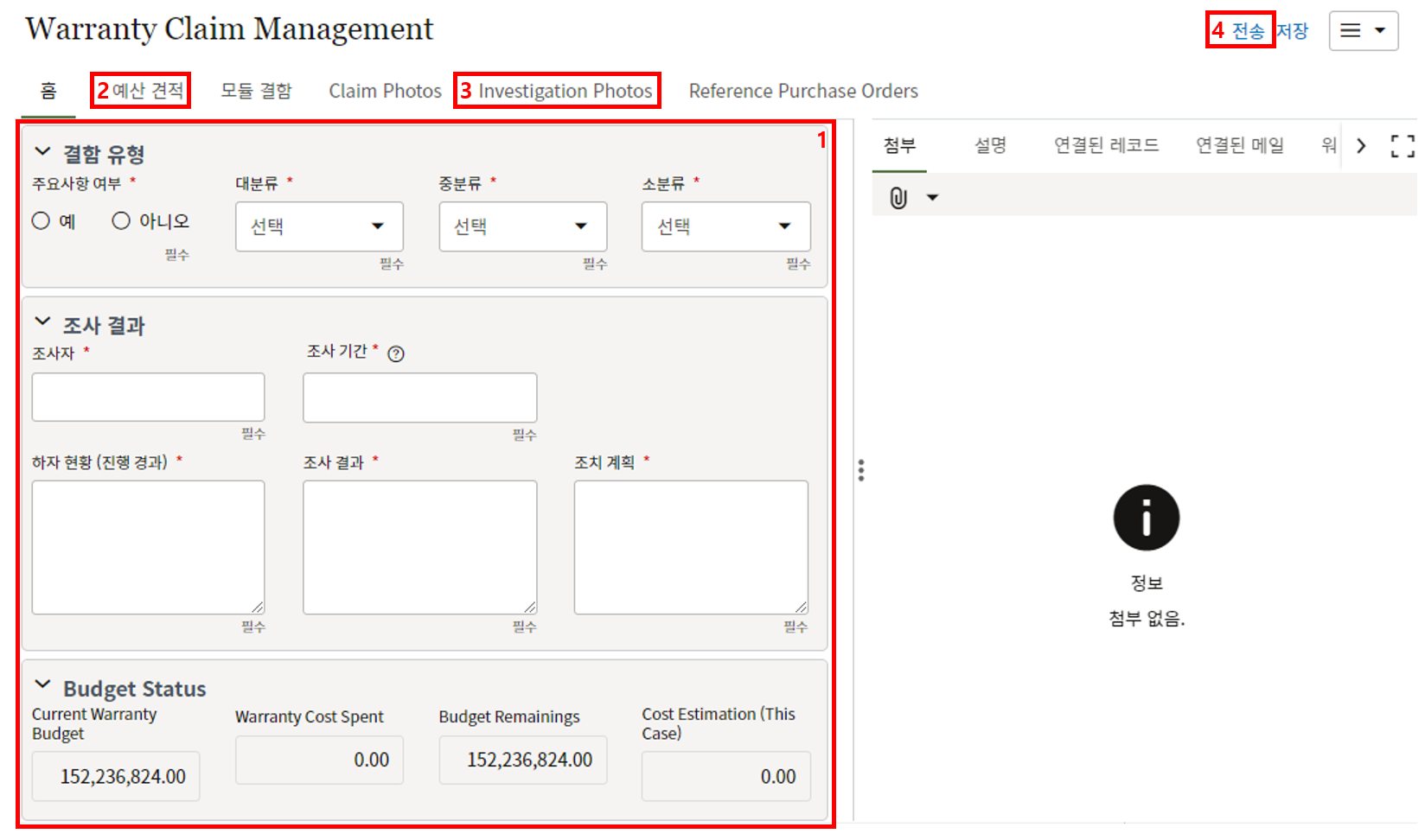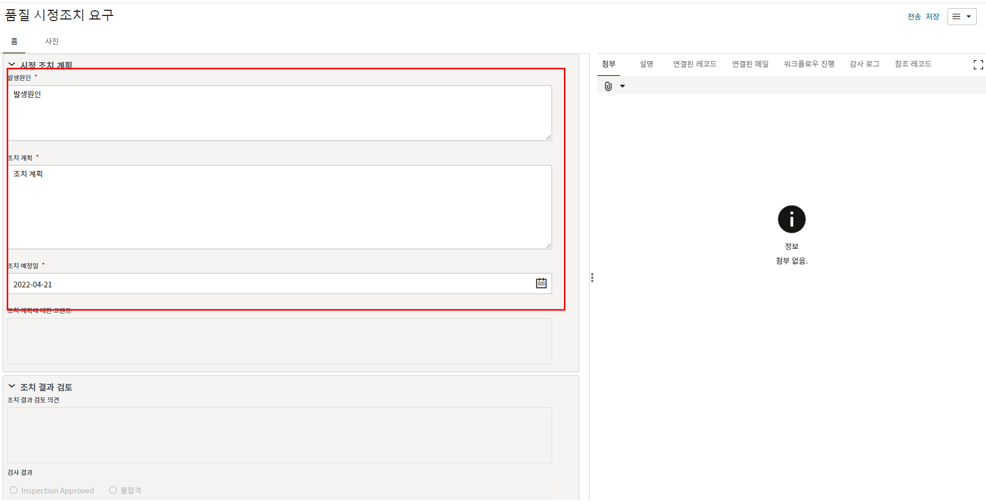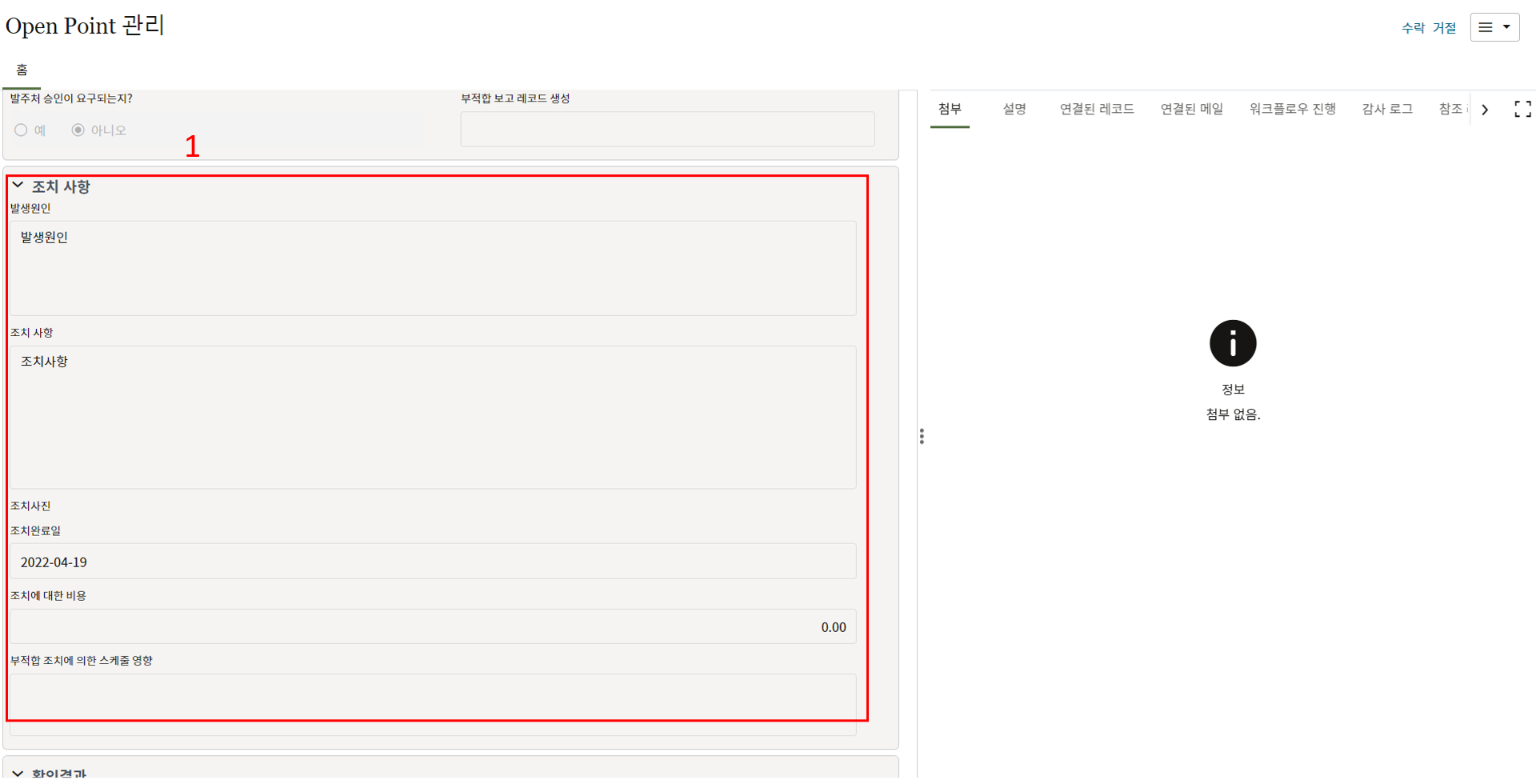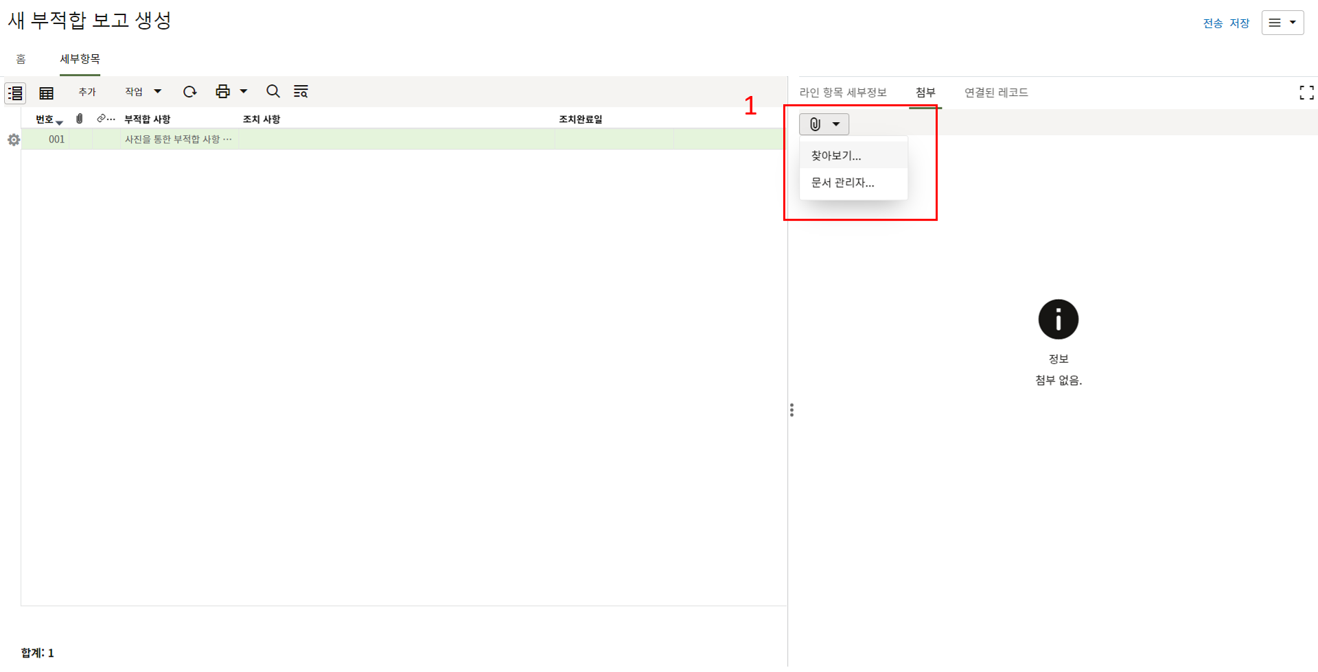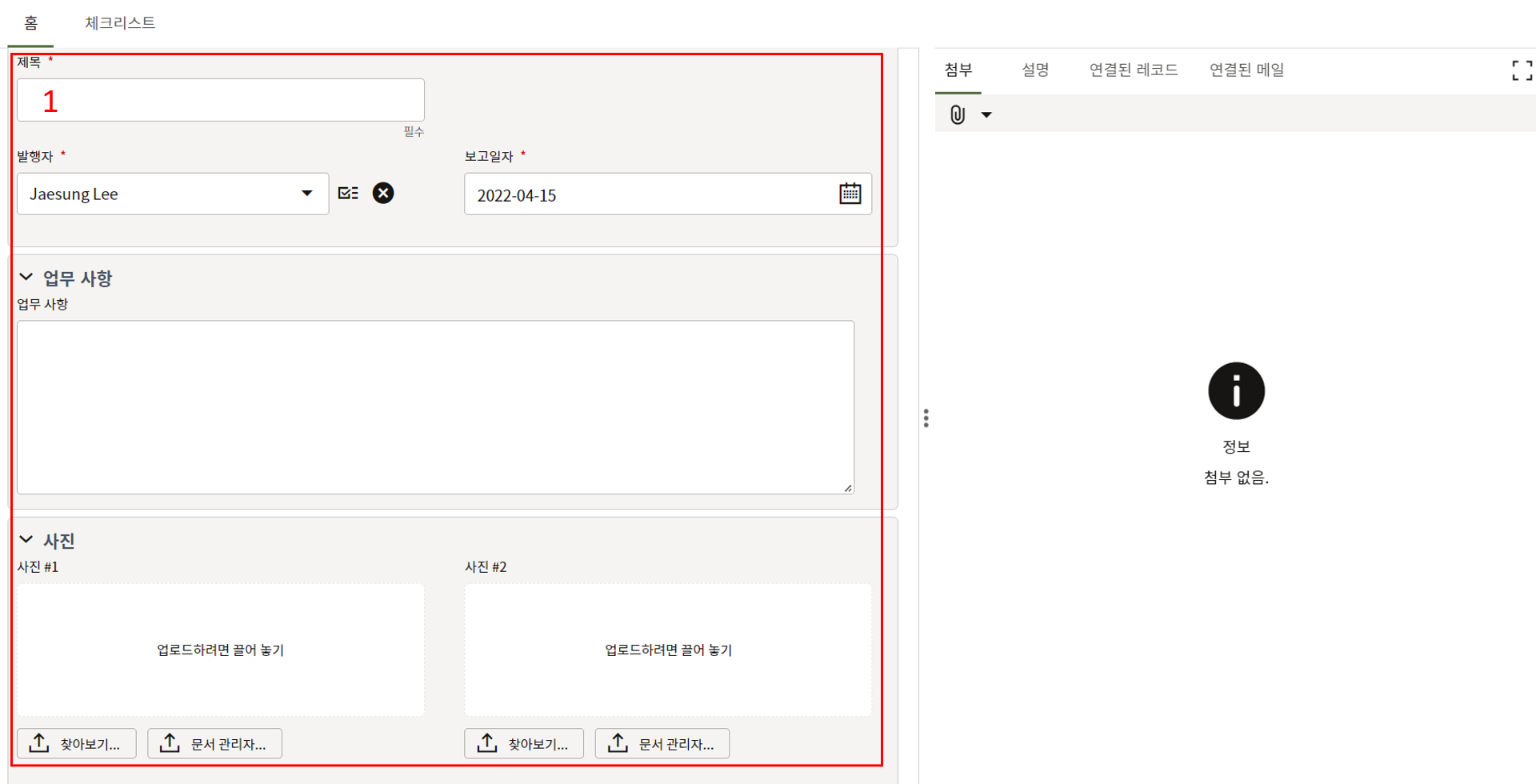 3. 첨부를 통한 추가설명이 필요한 경우 사진을 생성 후 첨부 탭에서 첨부파일을 등록합니다.