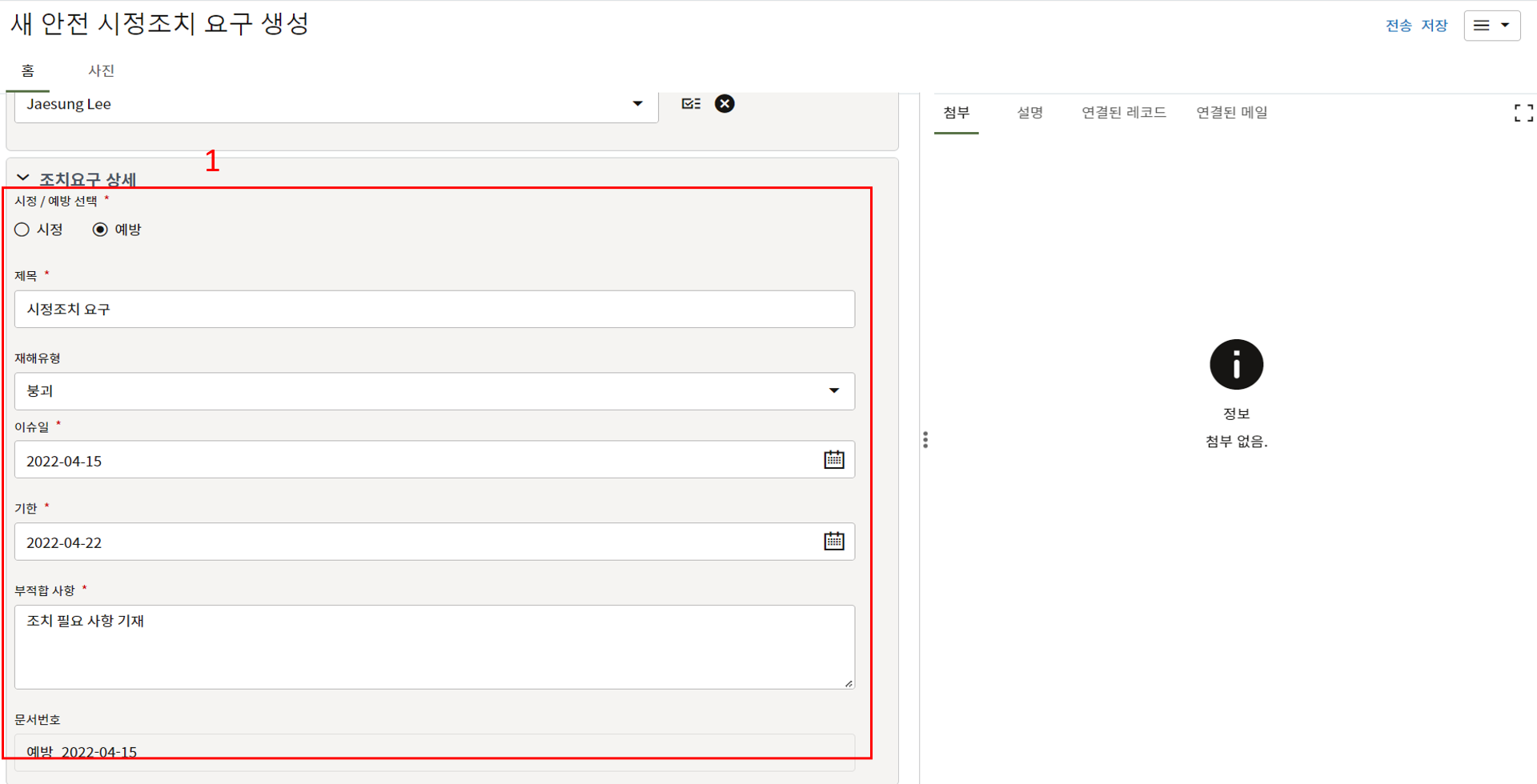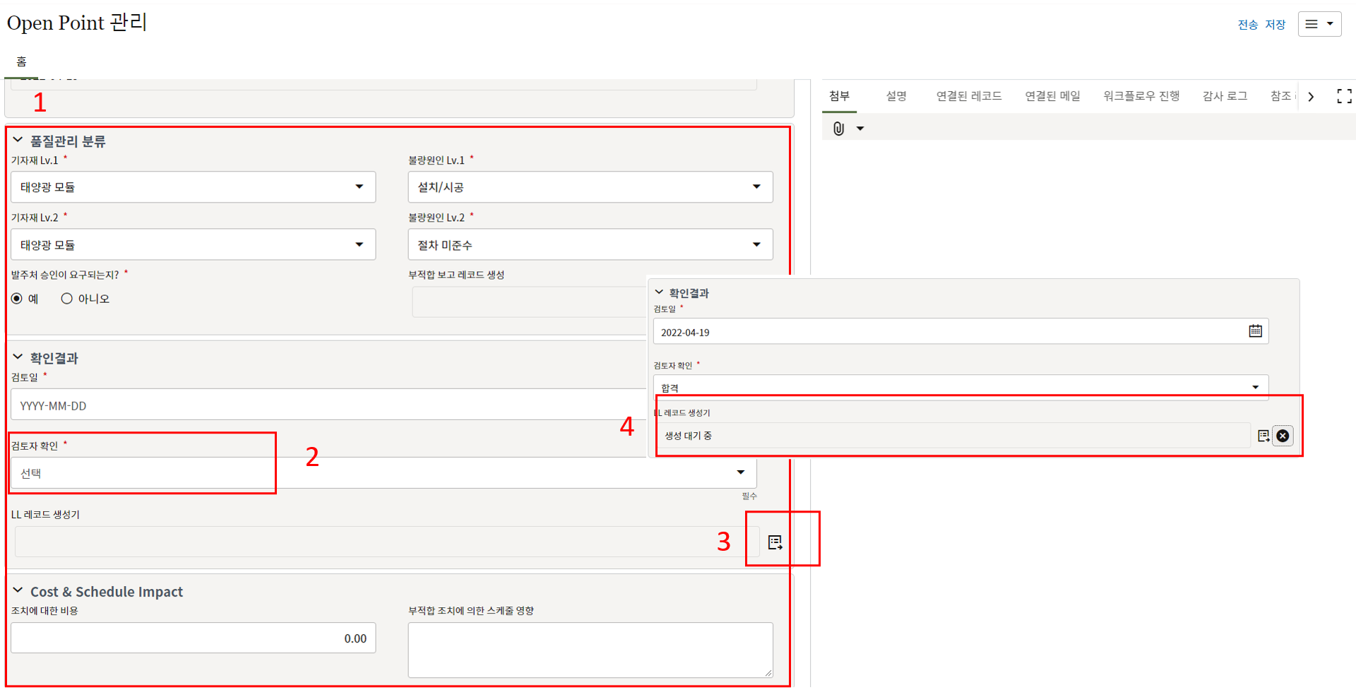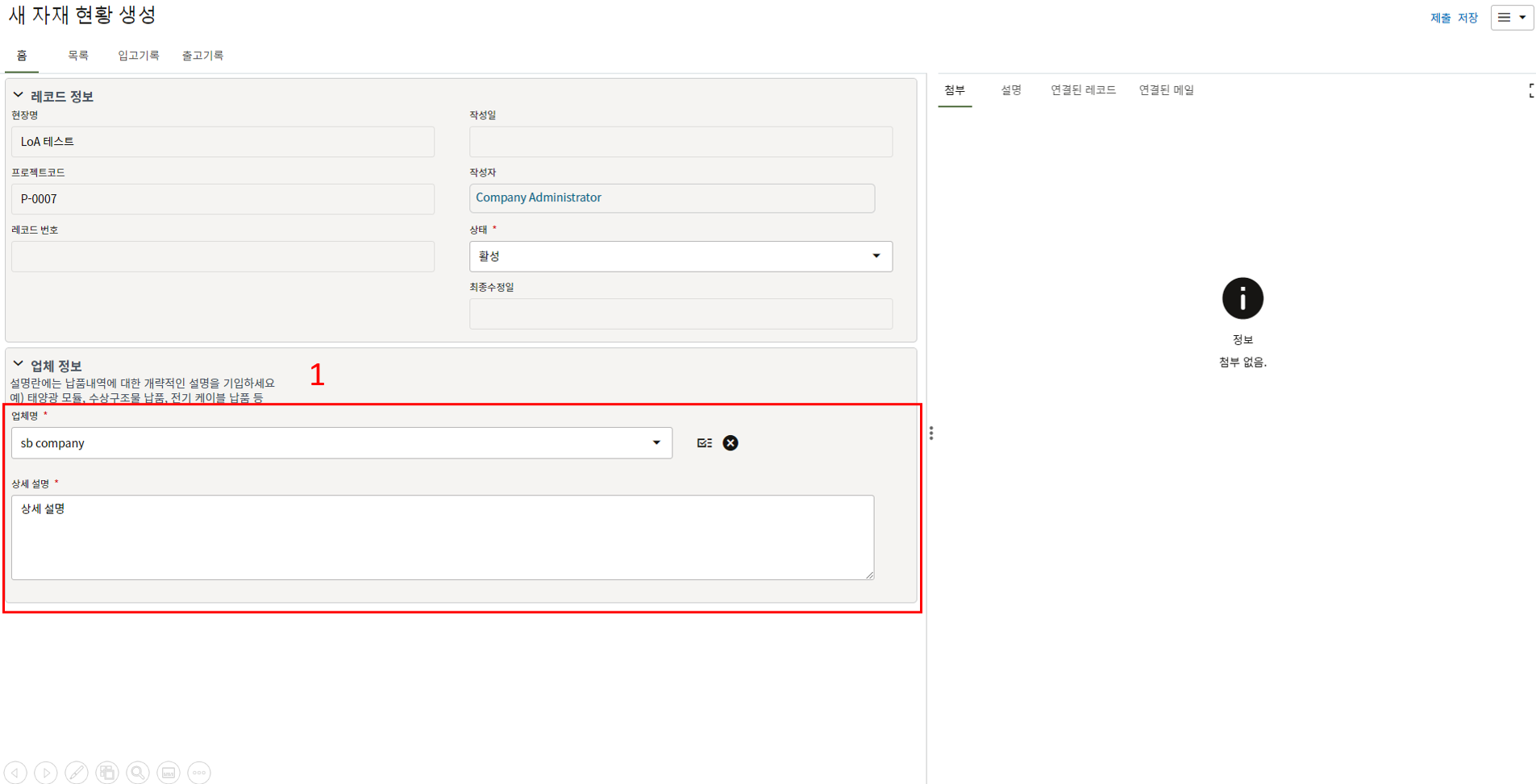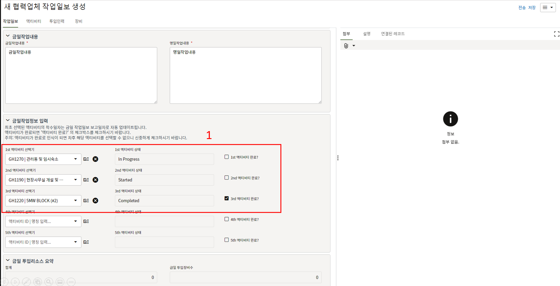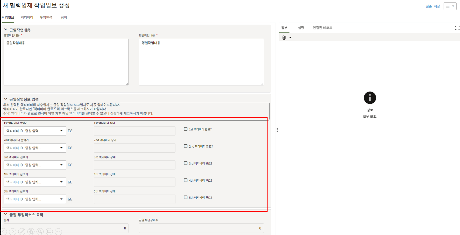 3. 첨부를 통한 추가설명이 필요한 경우 사진을 생성 후 첨부 탭에서 첨부파일을 등록합니다.
