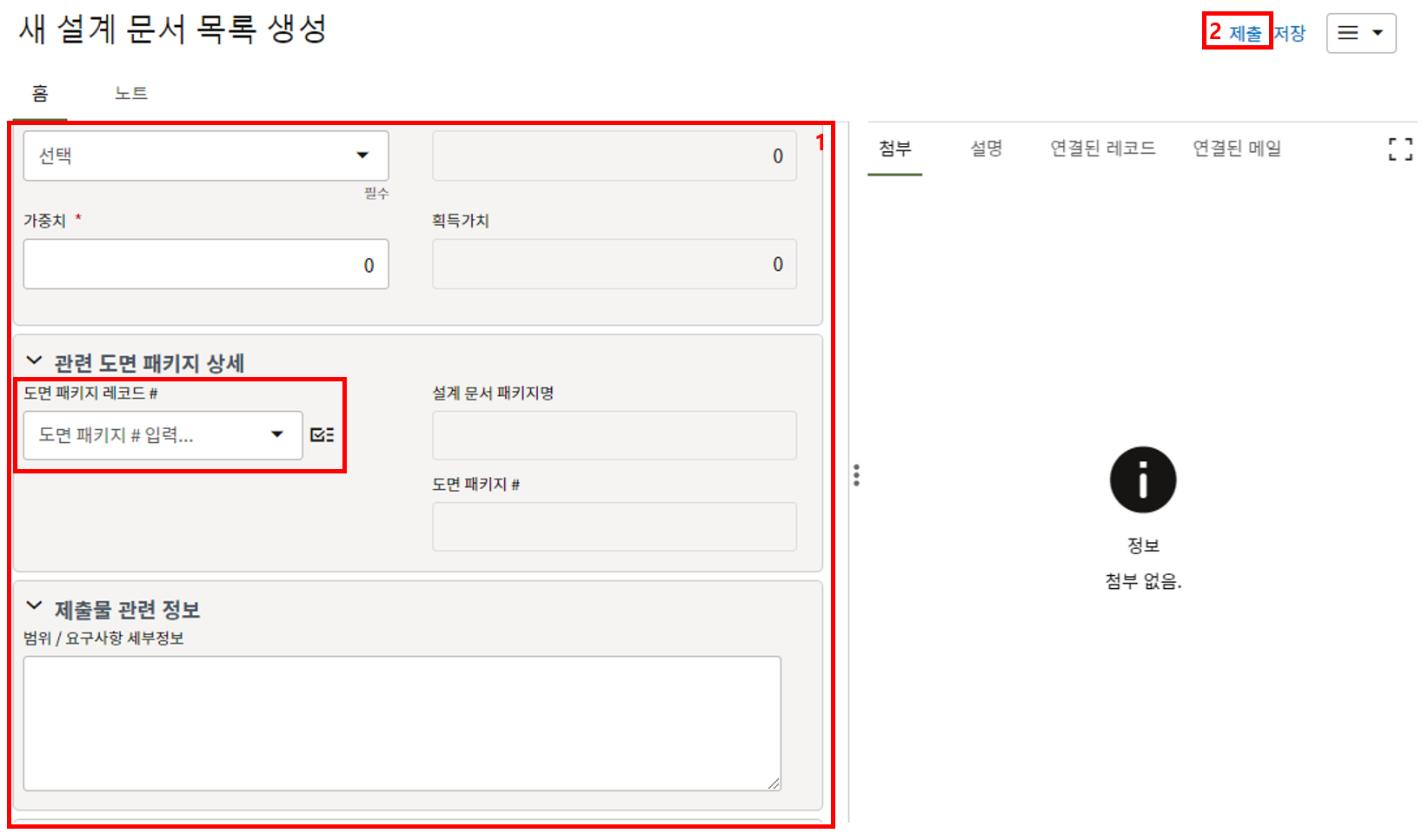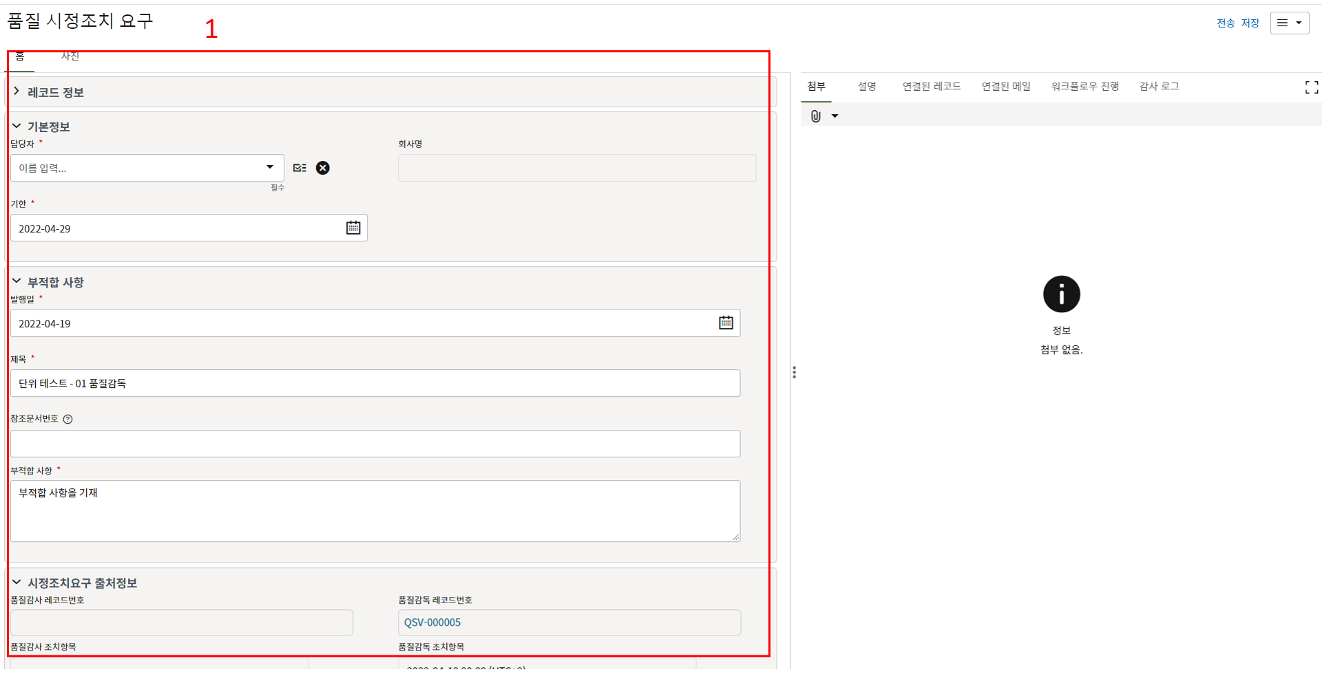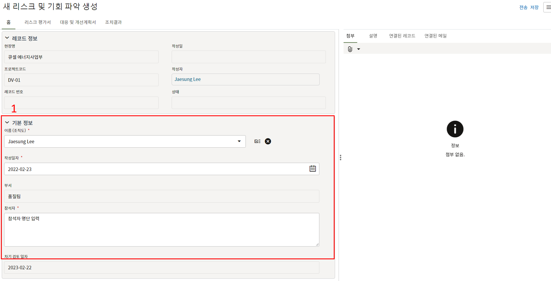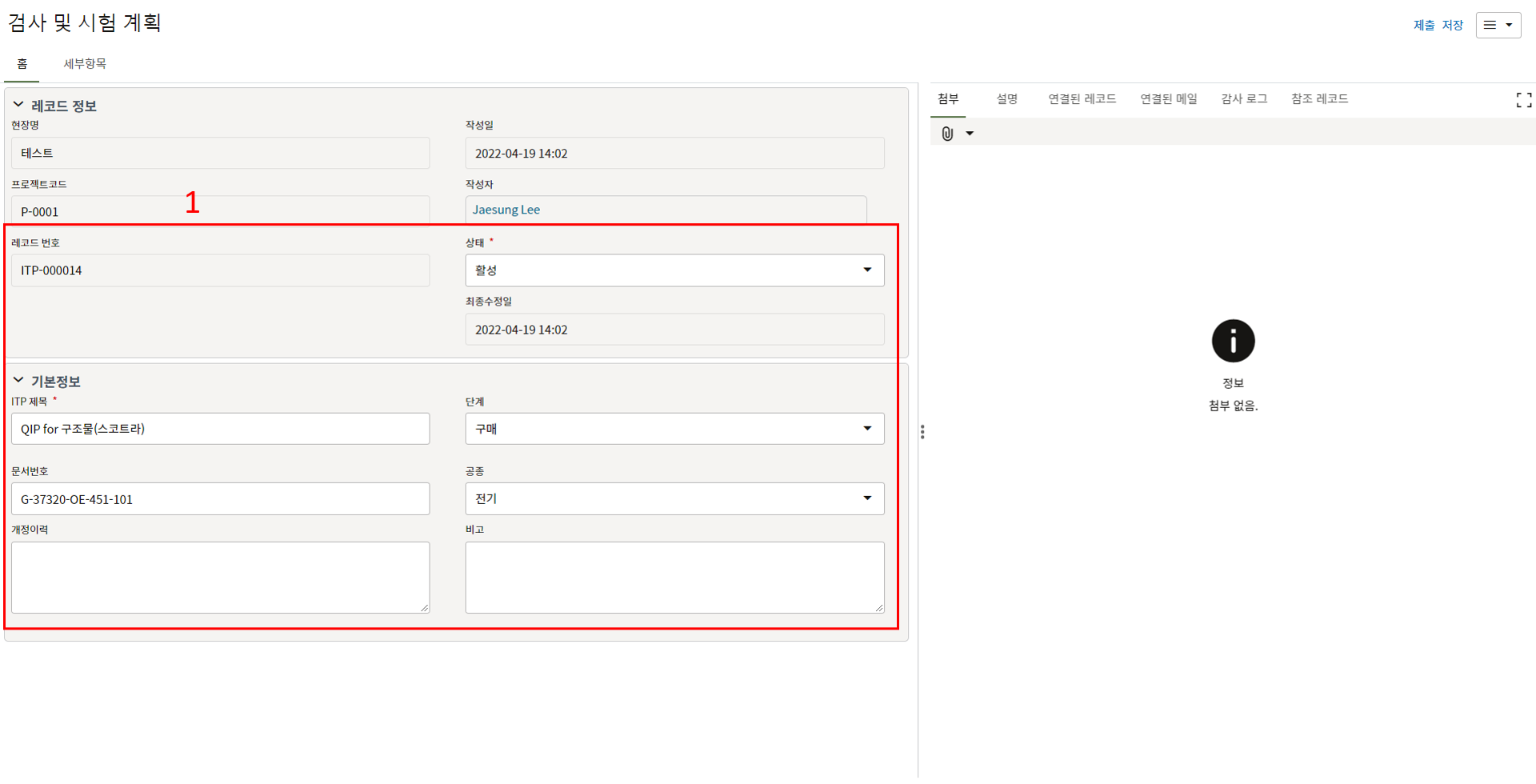 3. 첨부를 통한 추가설명이 필요한 경우 사진을 생성 후 첨부 탭에서 첨부파일을 등록합니다.