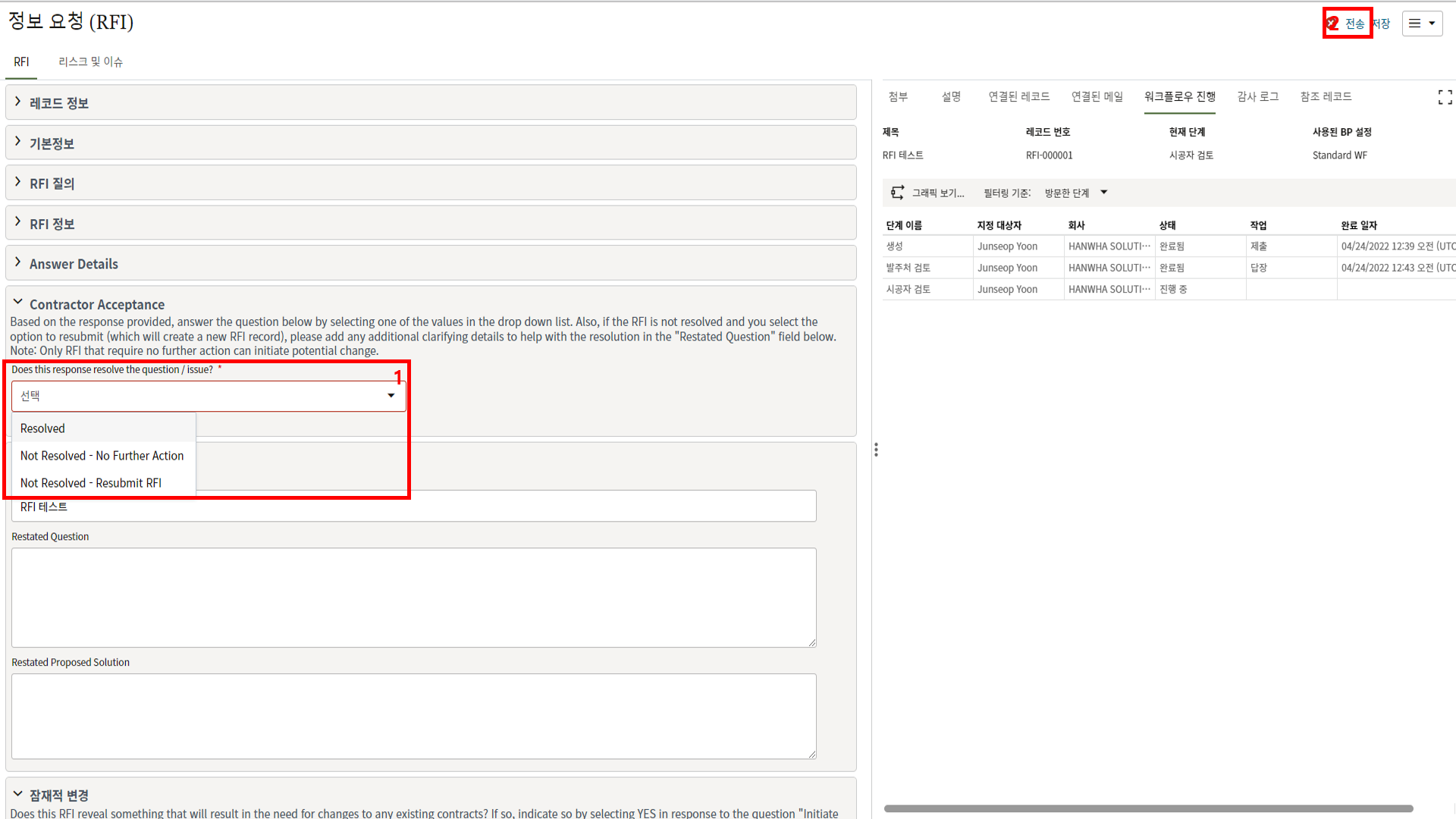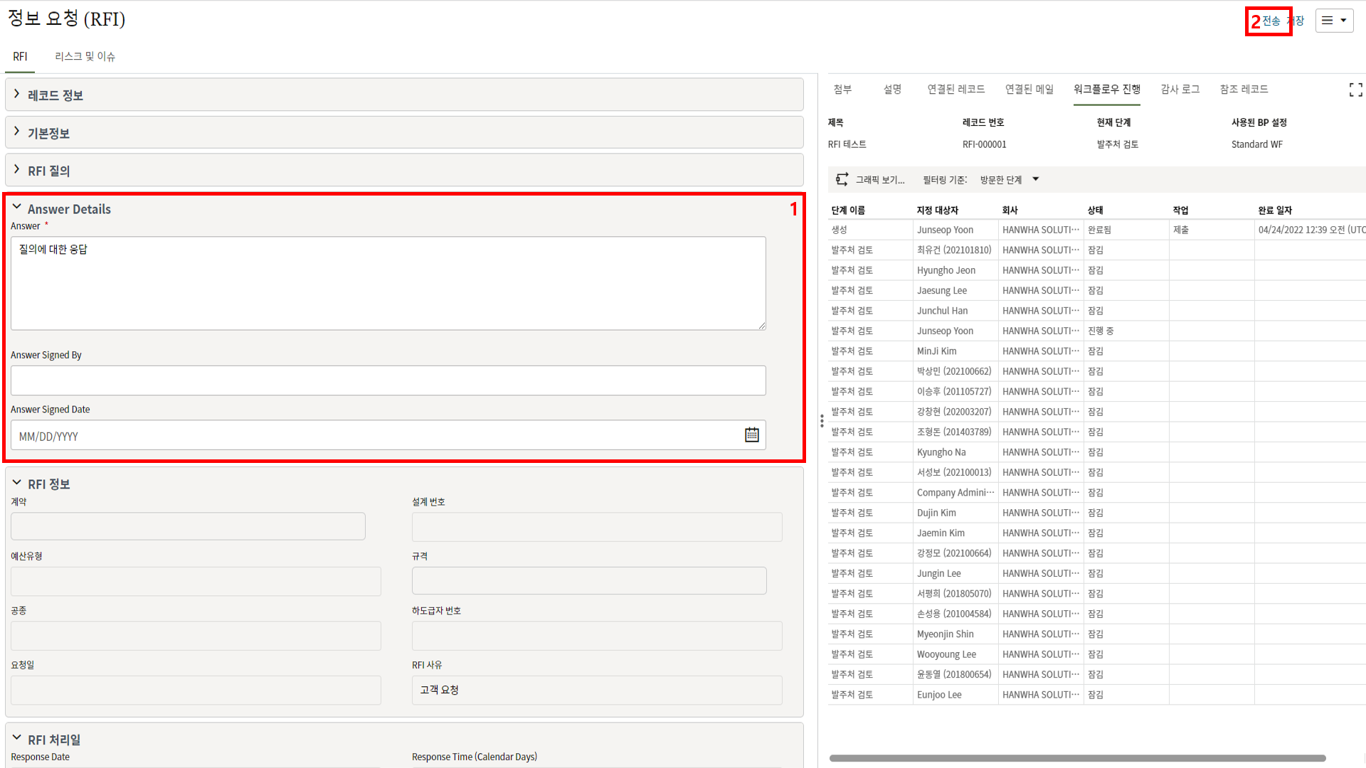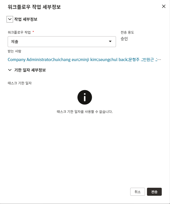4. 한화솔루션에서 제출문서를 검토하고, 승인여부를 결정 후 "전송" 버튼을 누릅니다.