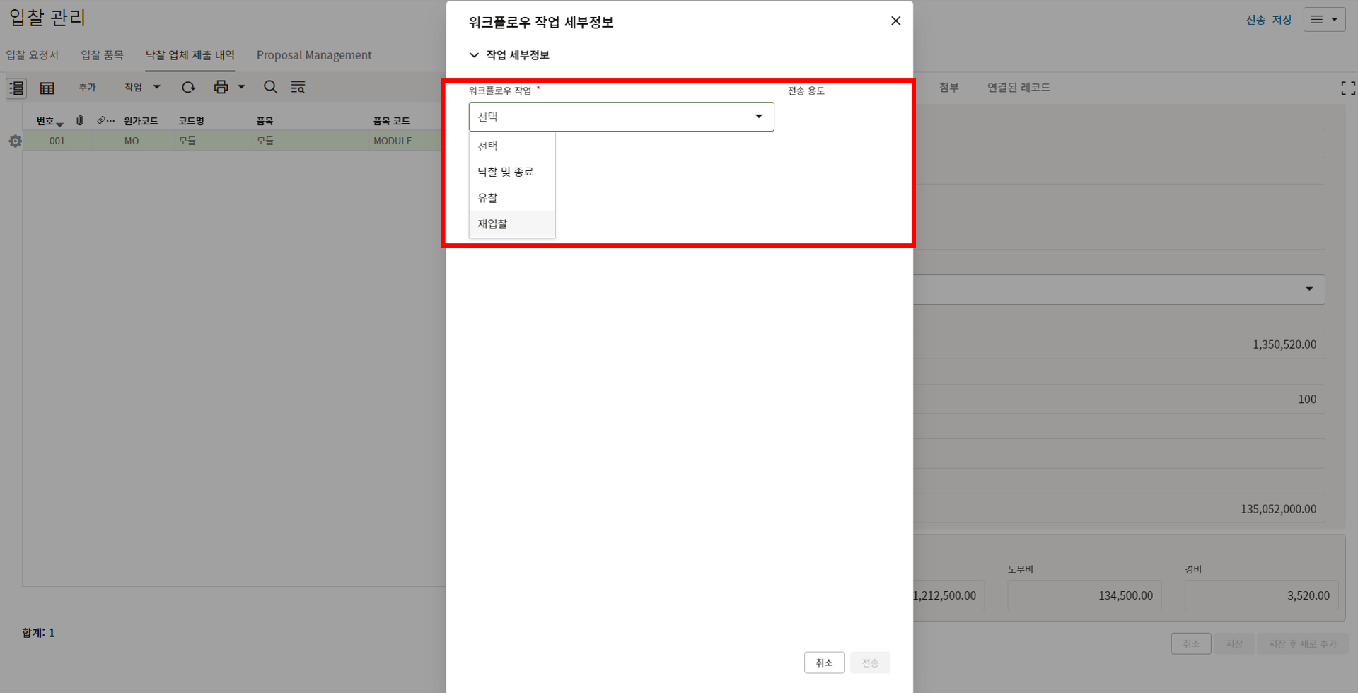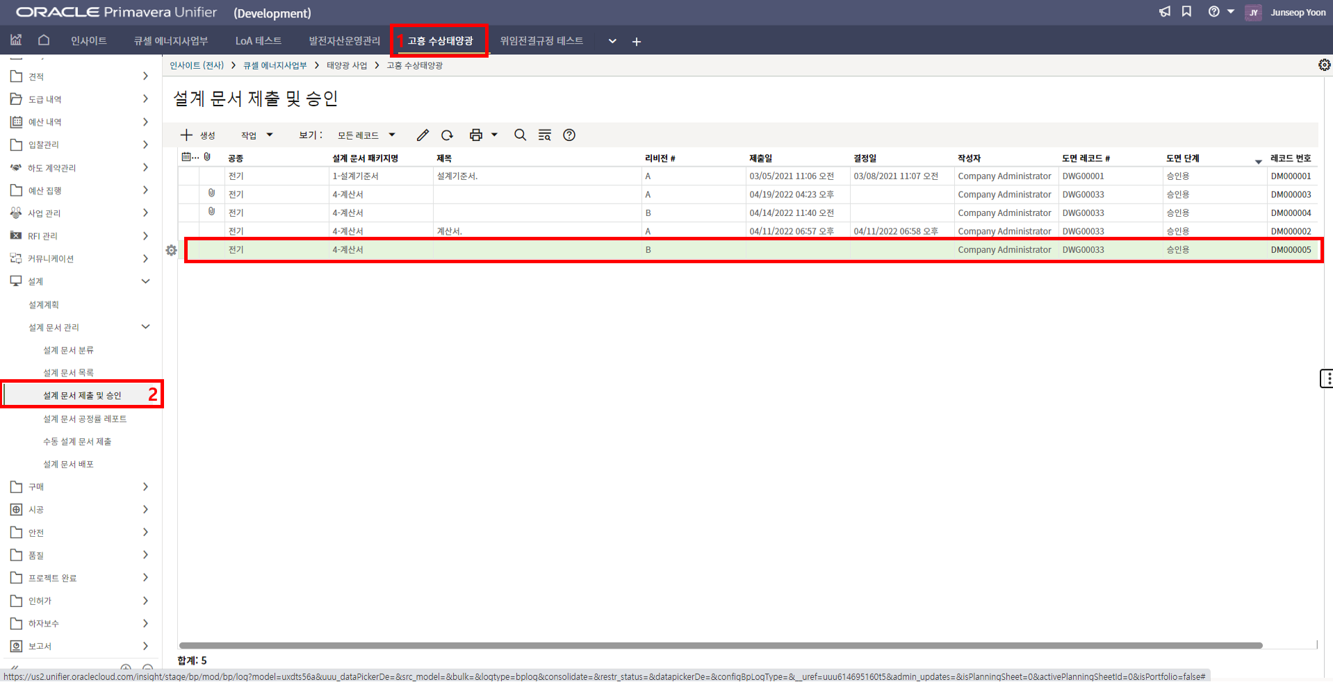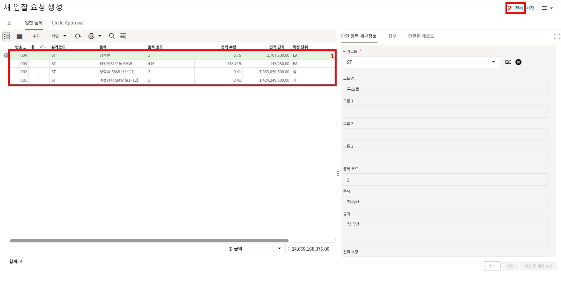 4. 한화솔루션에서 제출문서를 검토하고, 승인여부를 결정 후 "전송" 버튼을 누릅니다.