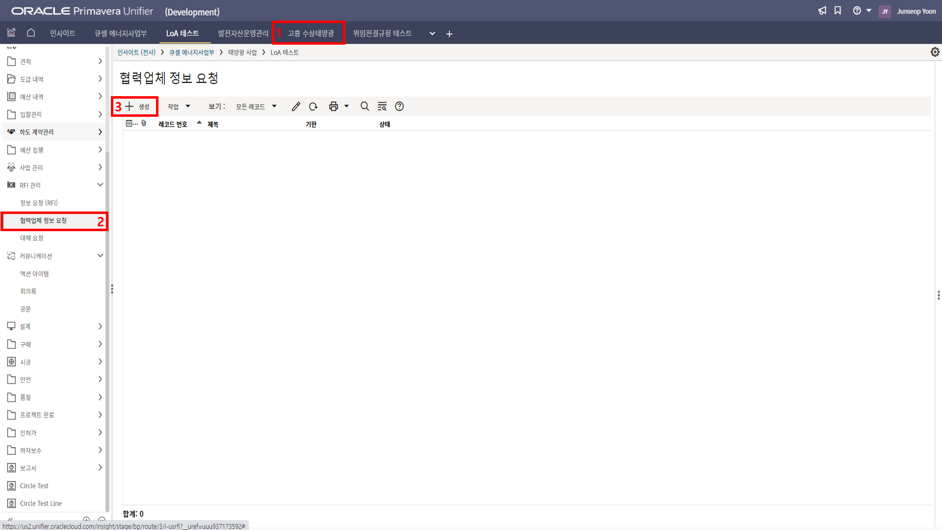 2. '1)해당 프로젝트 > 2)협력업체 정보 요청 > 3) 생성'을 클릭합니다.