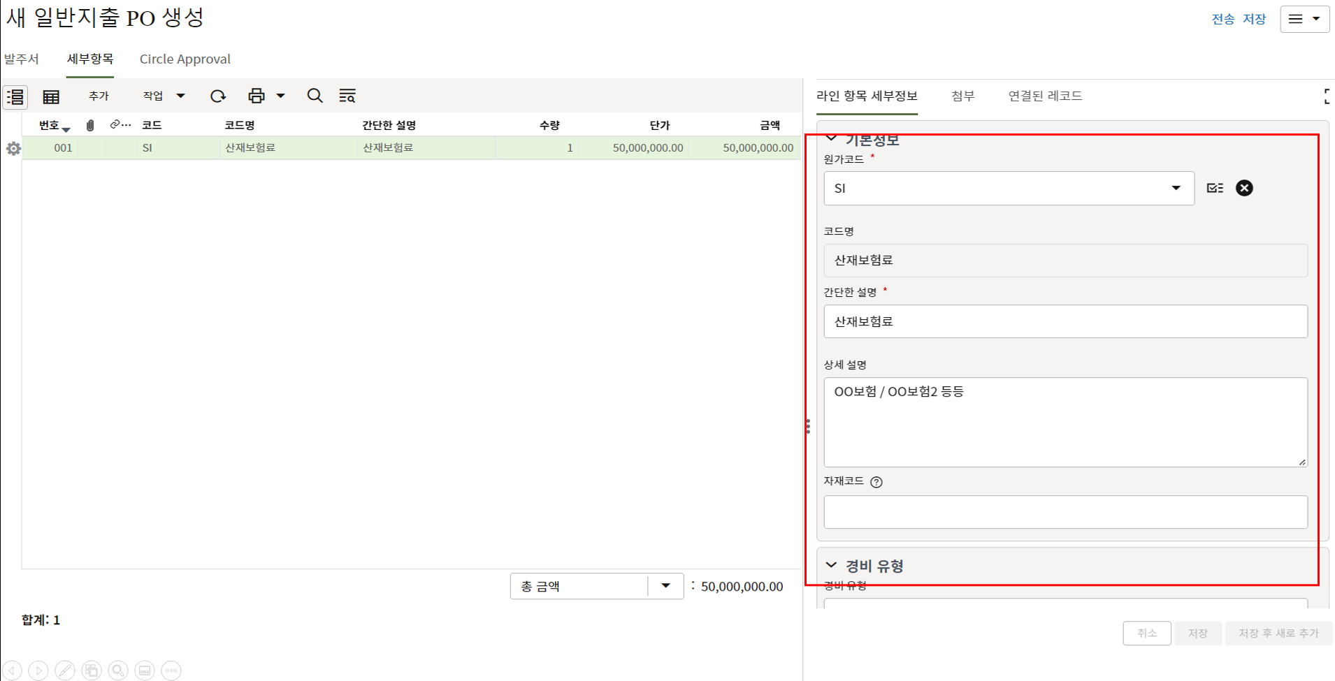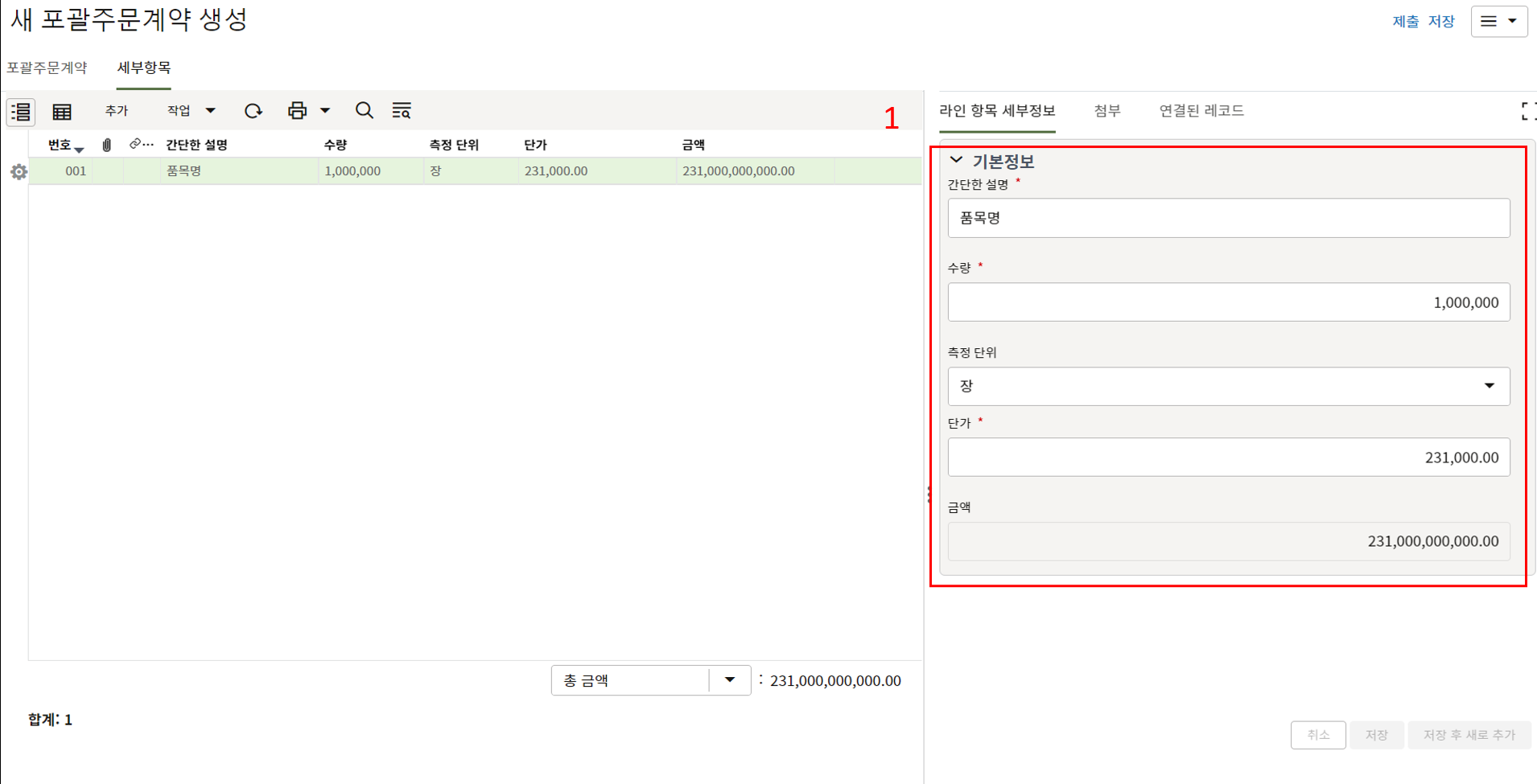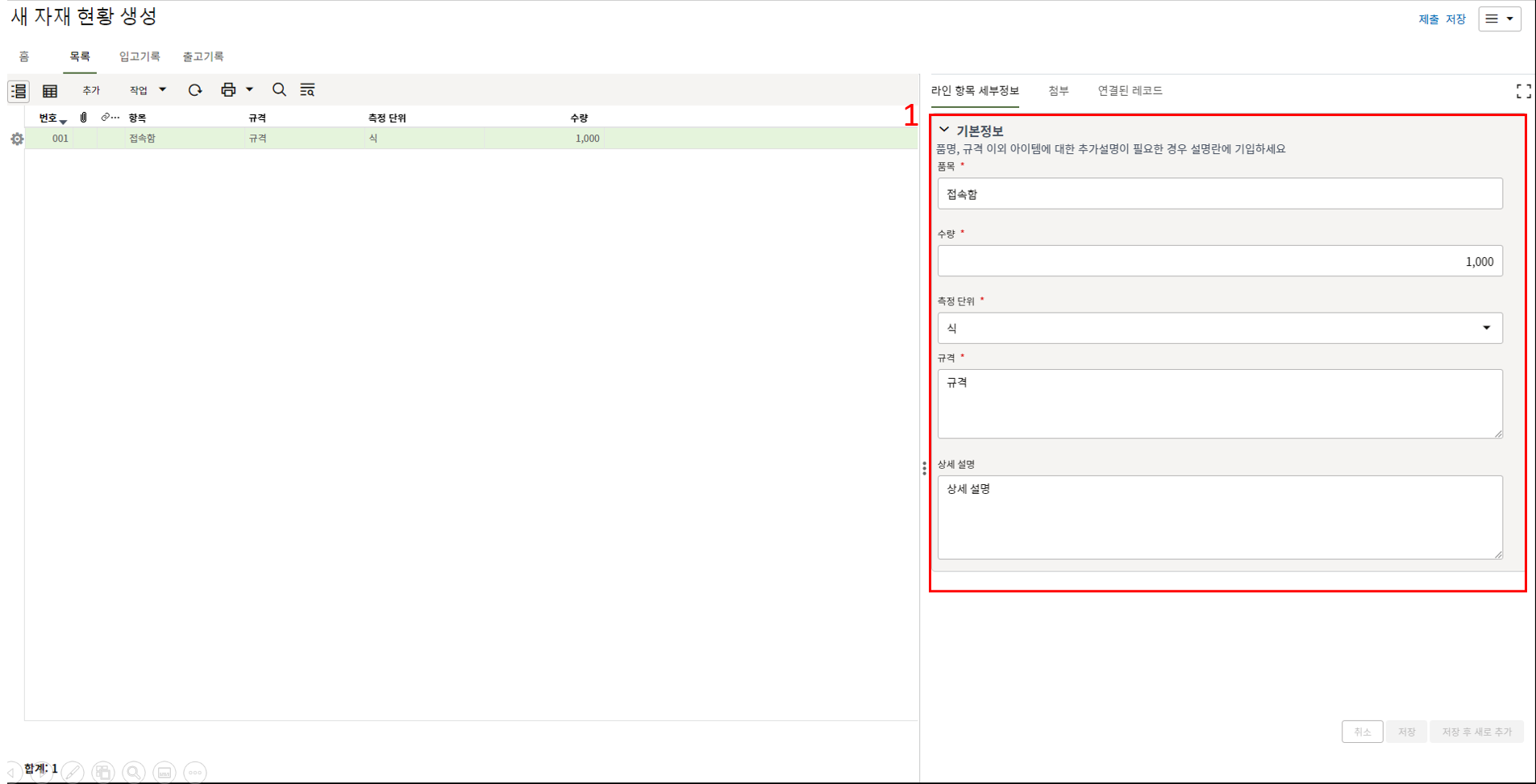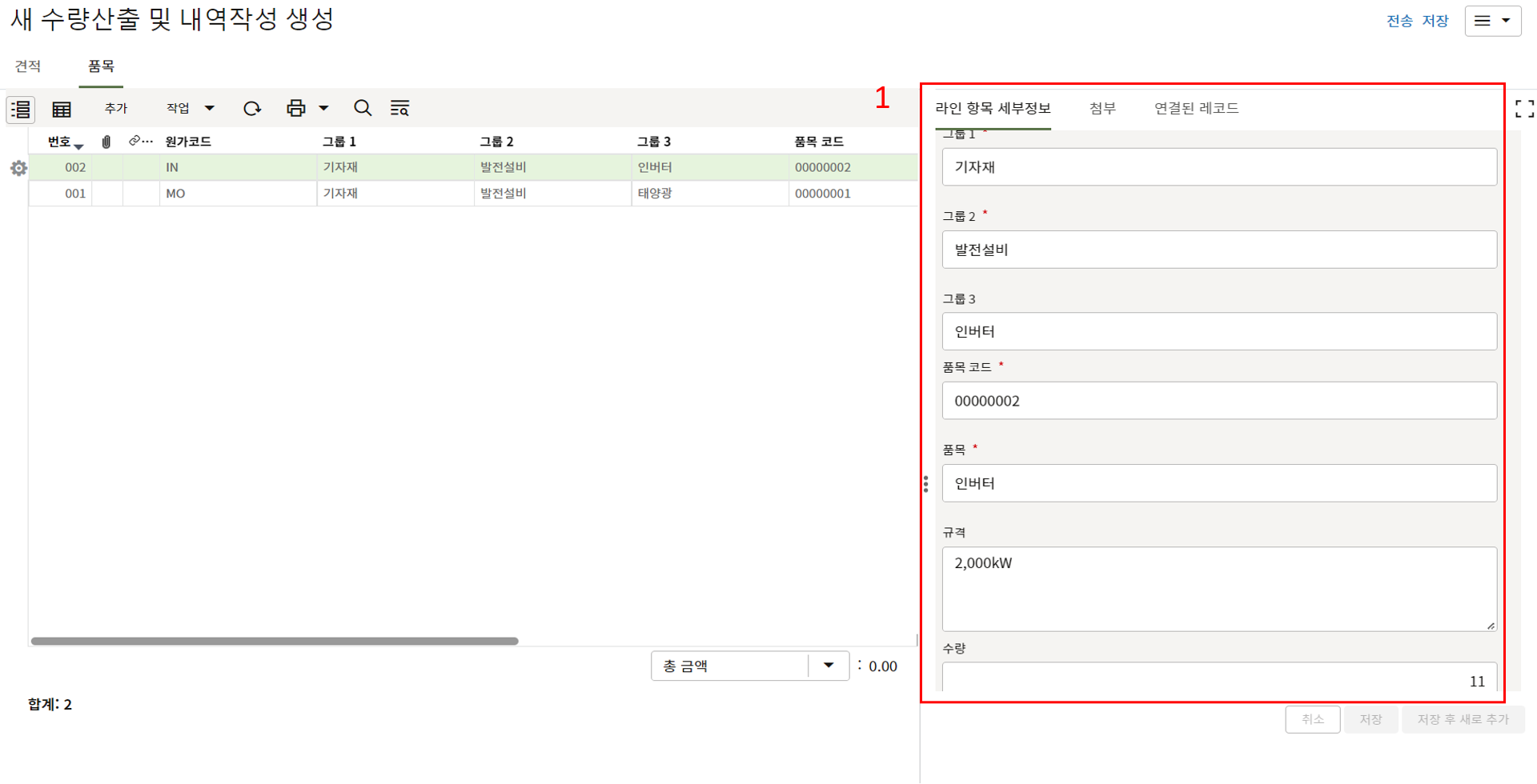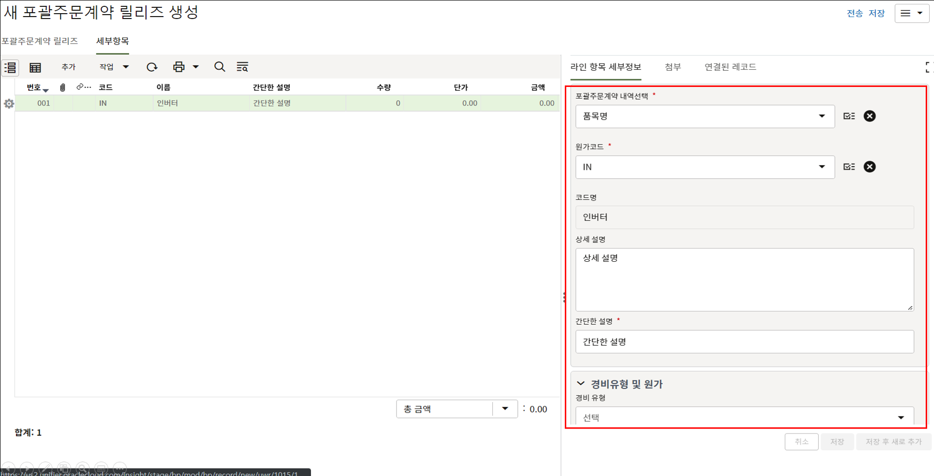 하나의 레코드에 포함되는 내역,품목등 세부사항의 내용을 입력할 수 있습니다.