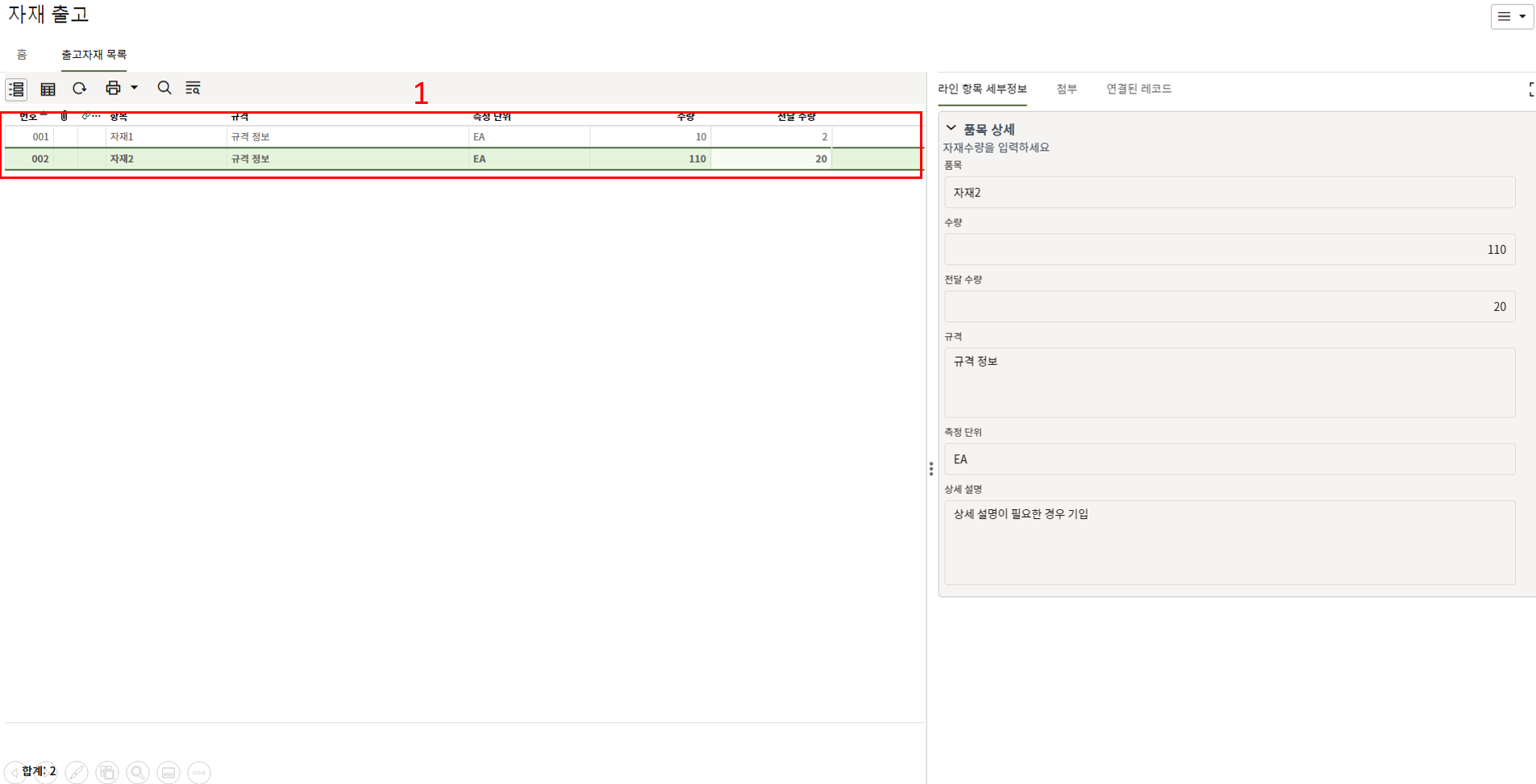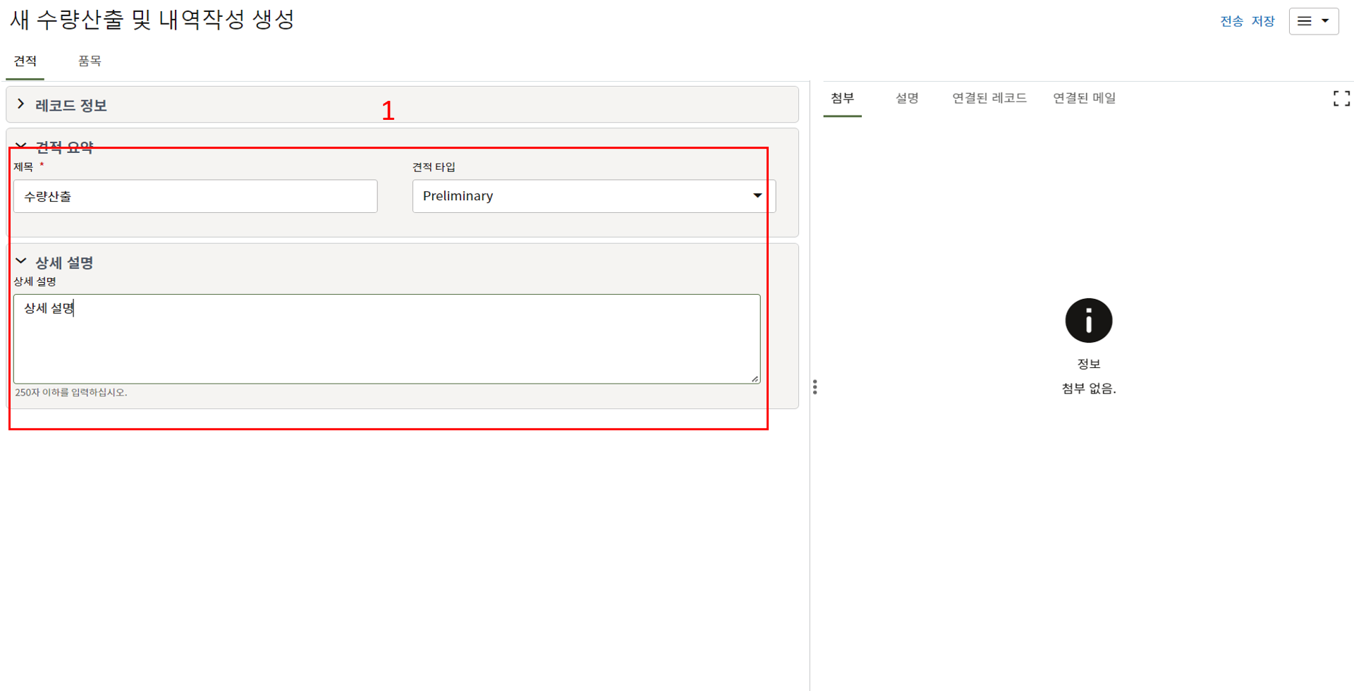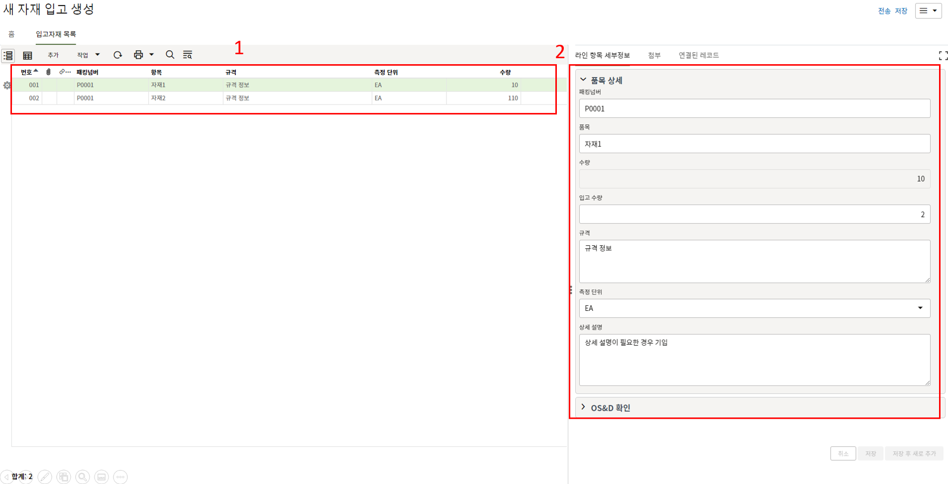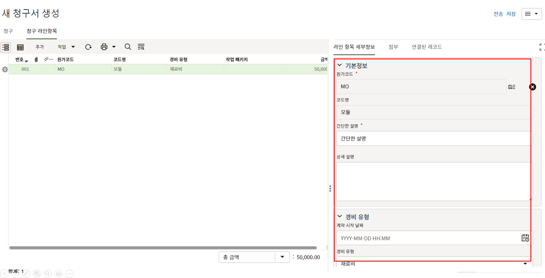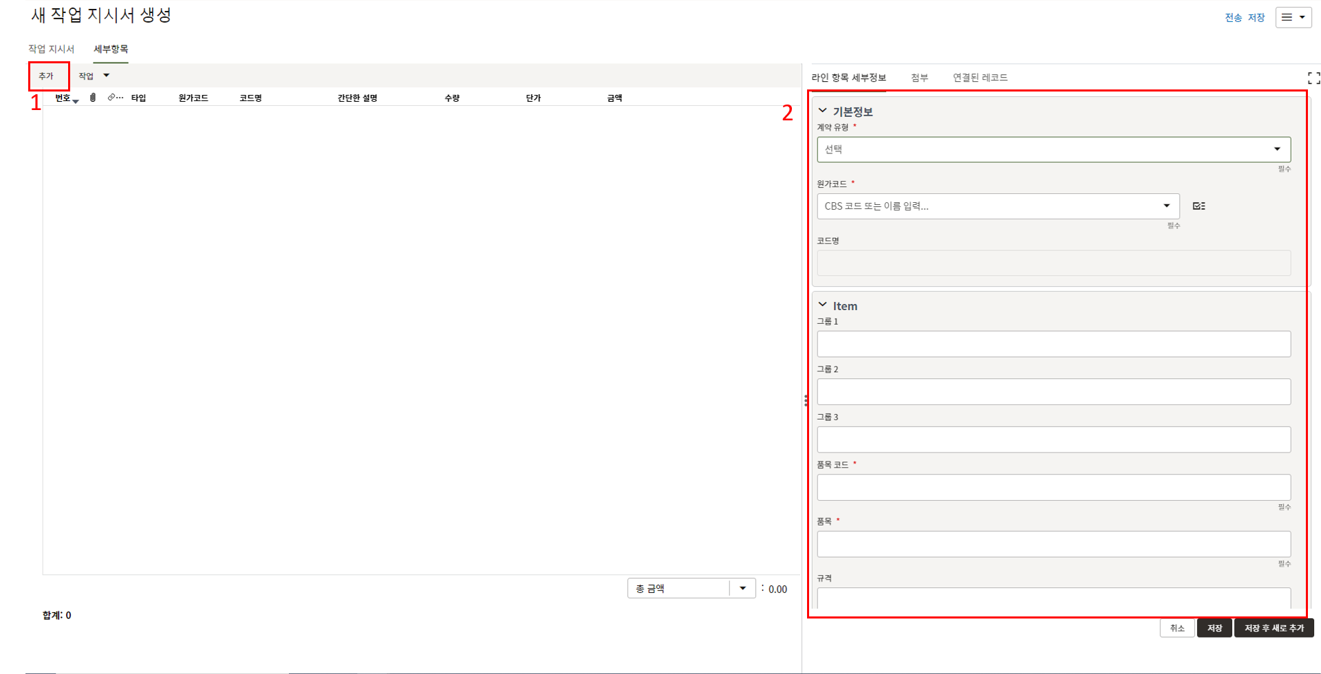 하나의 레코드에 포함되는 내역,품목등 세부사항의 내용을 입력할 수 있습니다.