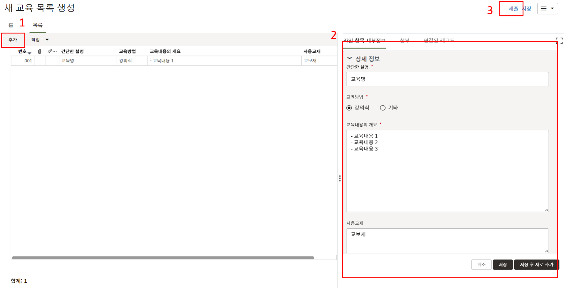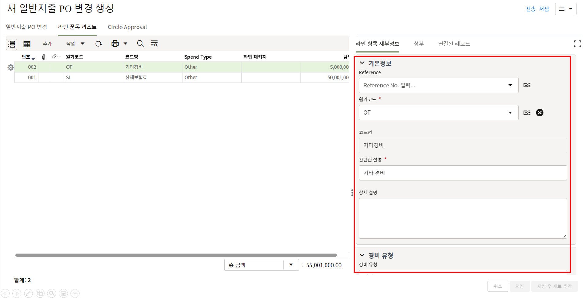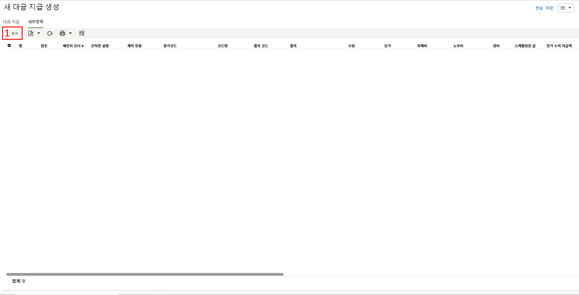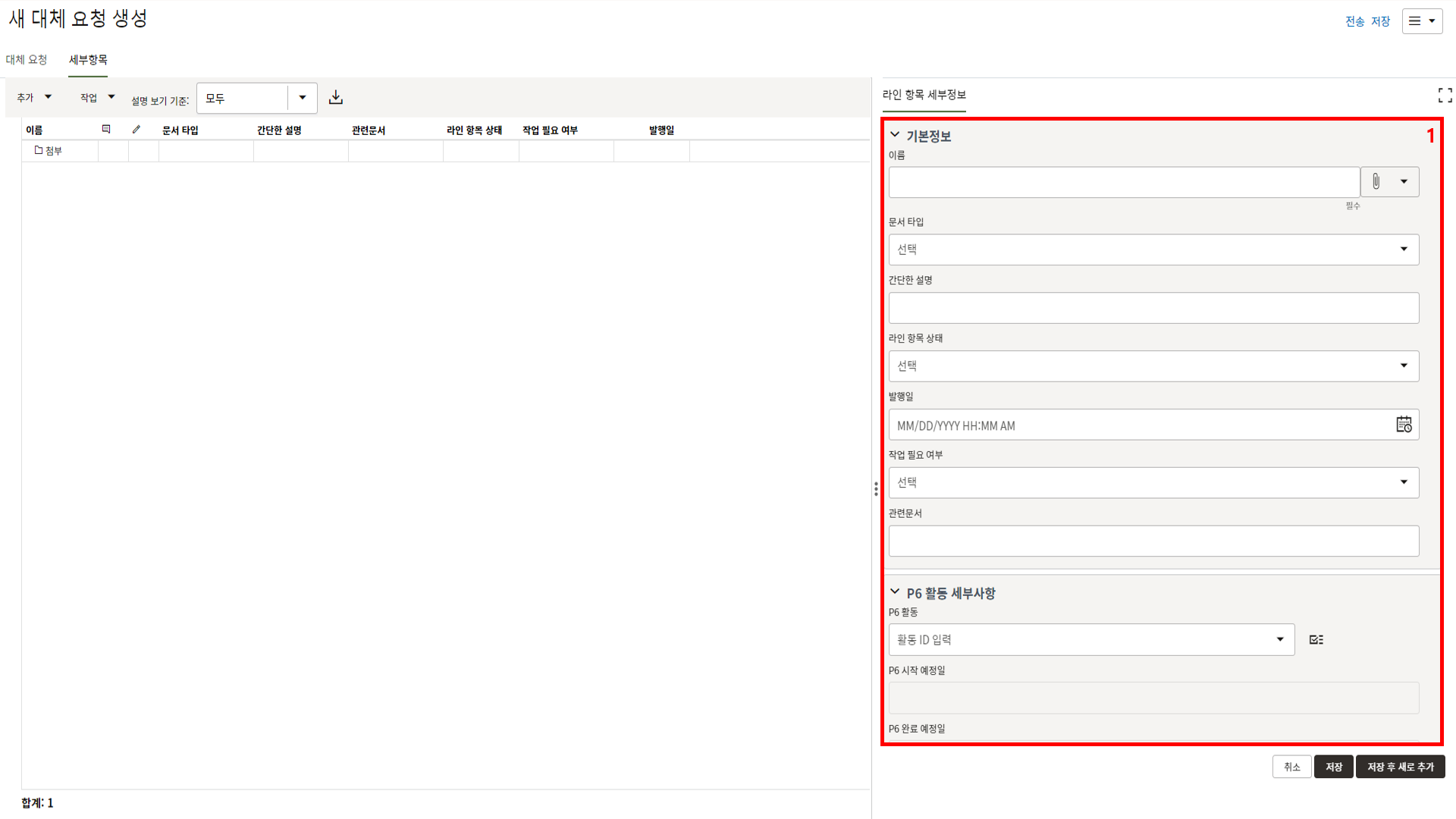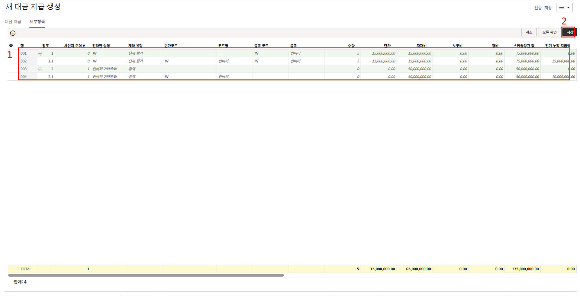 하나의 레코드에 포함되는 내역,품목등 세부사항의 내용을 입력할 수 있습니다.
