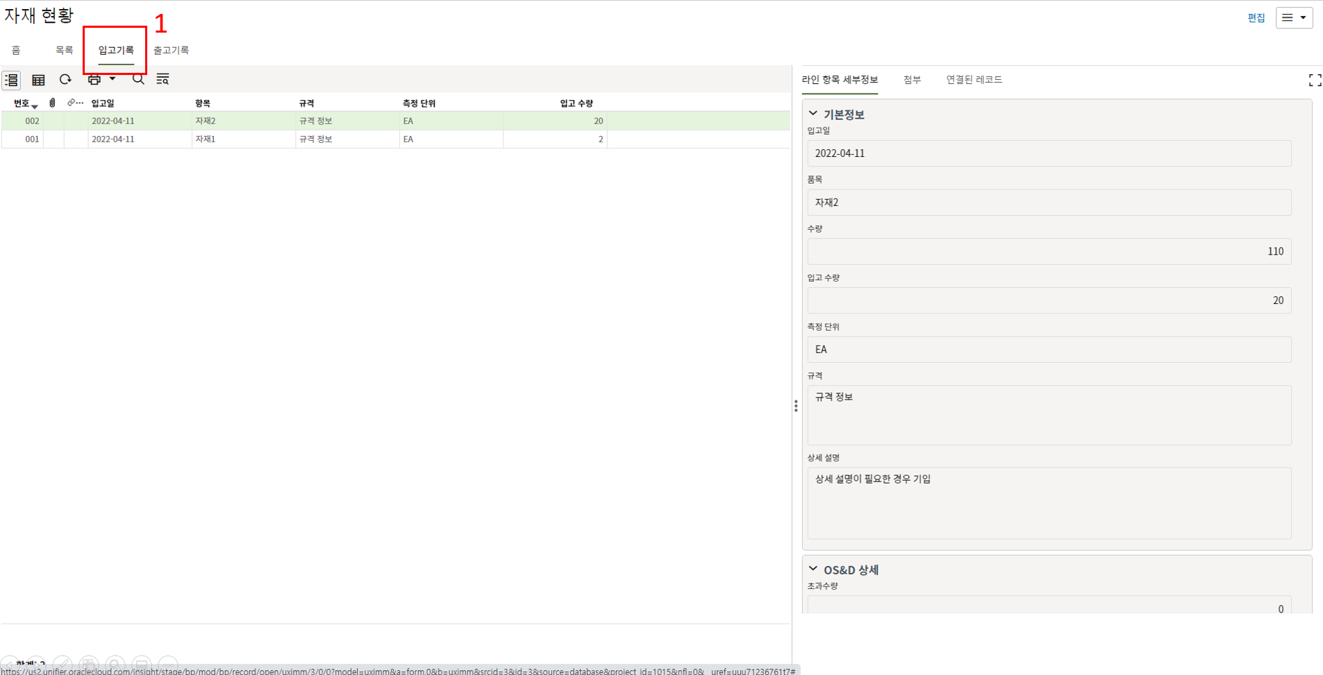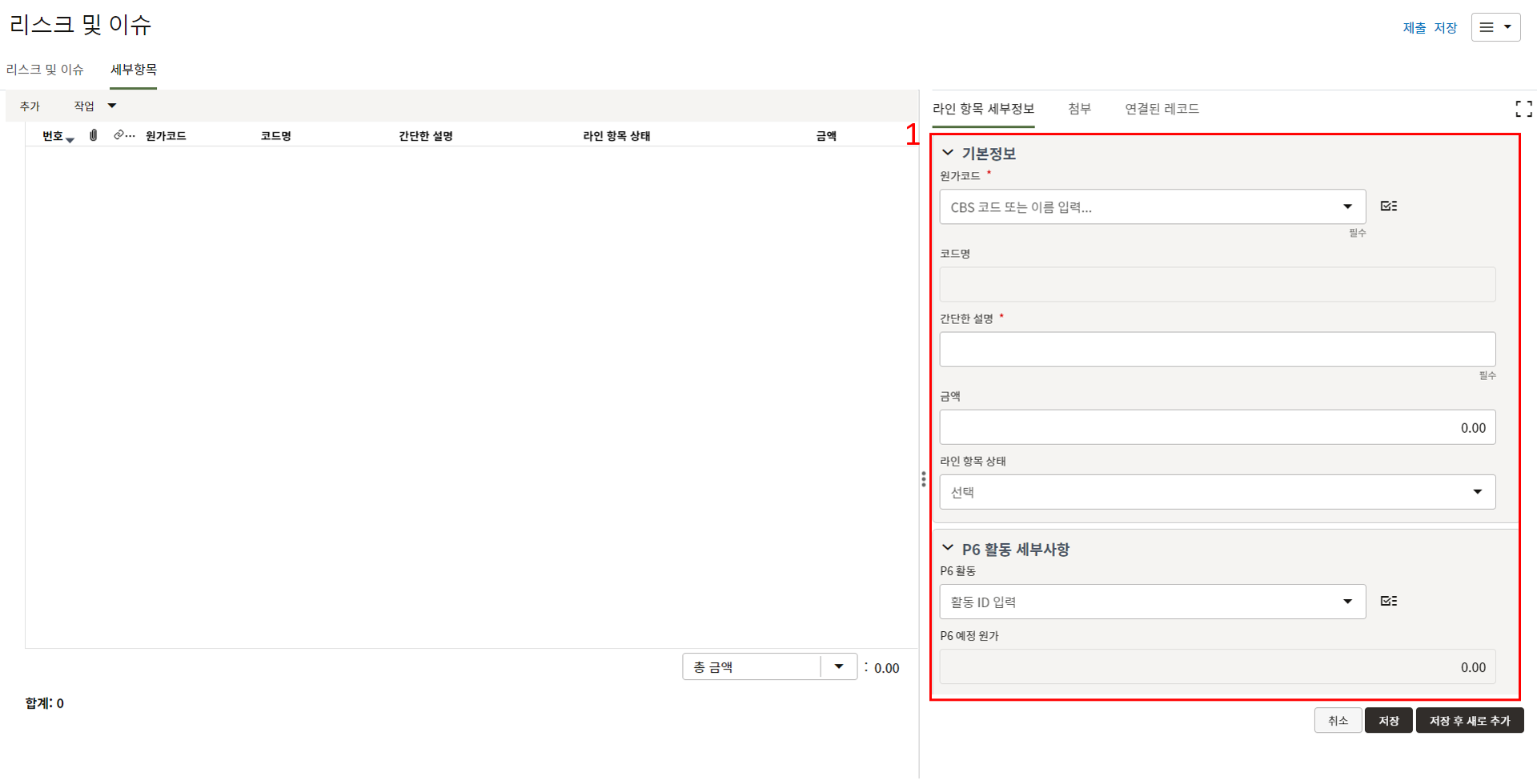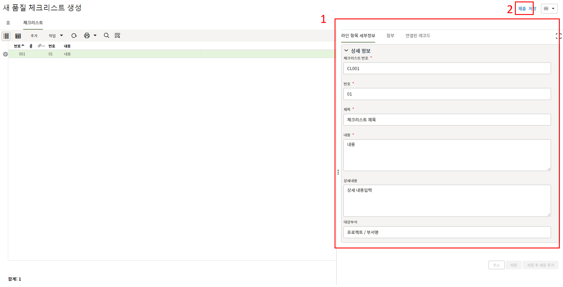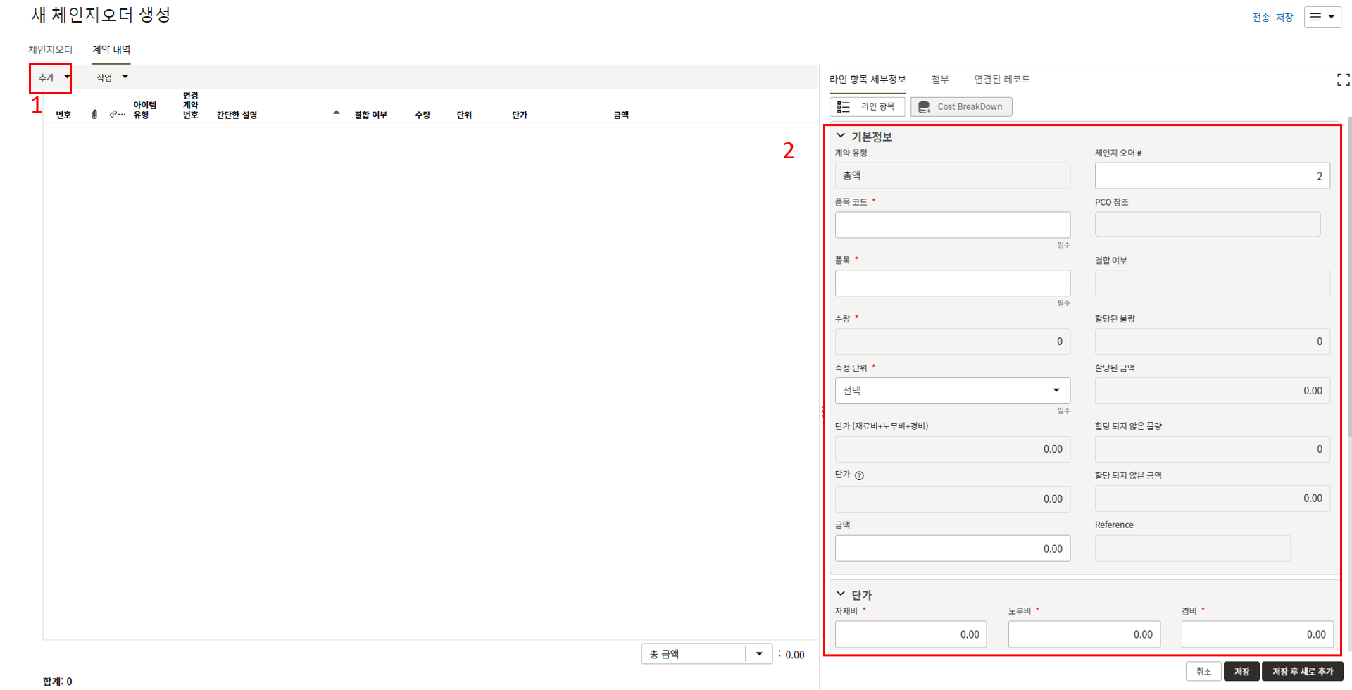 하나의 레코드에 포함되는 내역,품목등 세부사항의 내용을 입력할 수 있습니다.