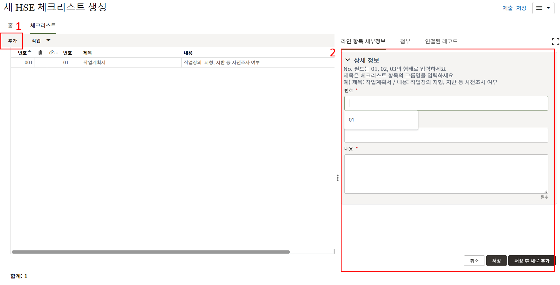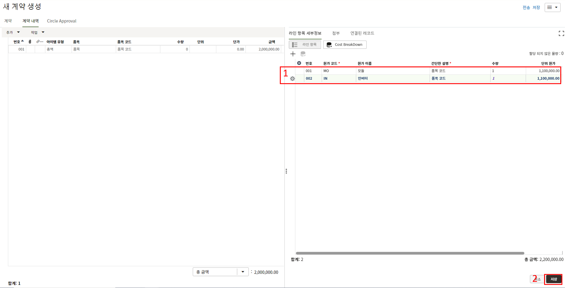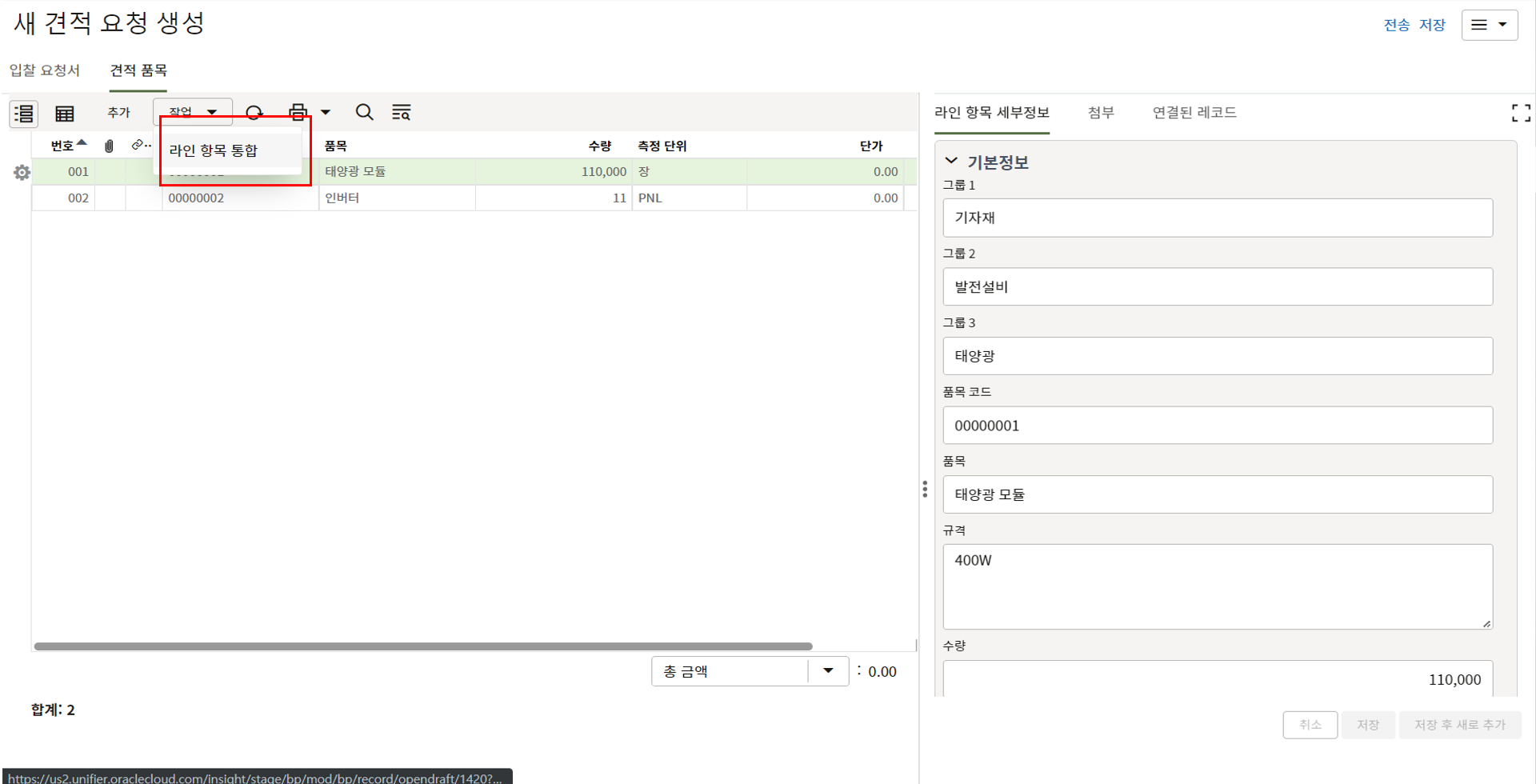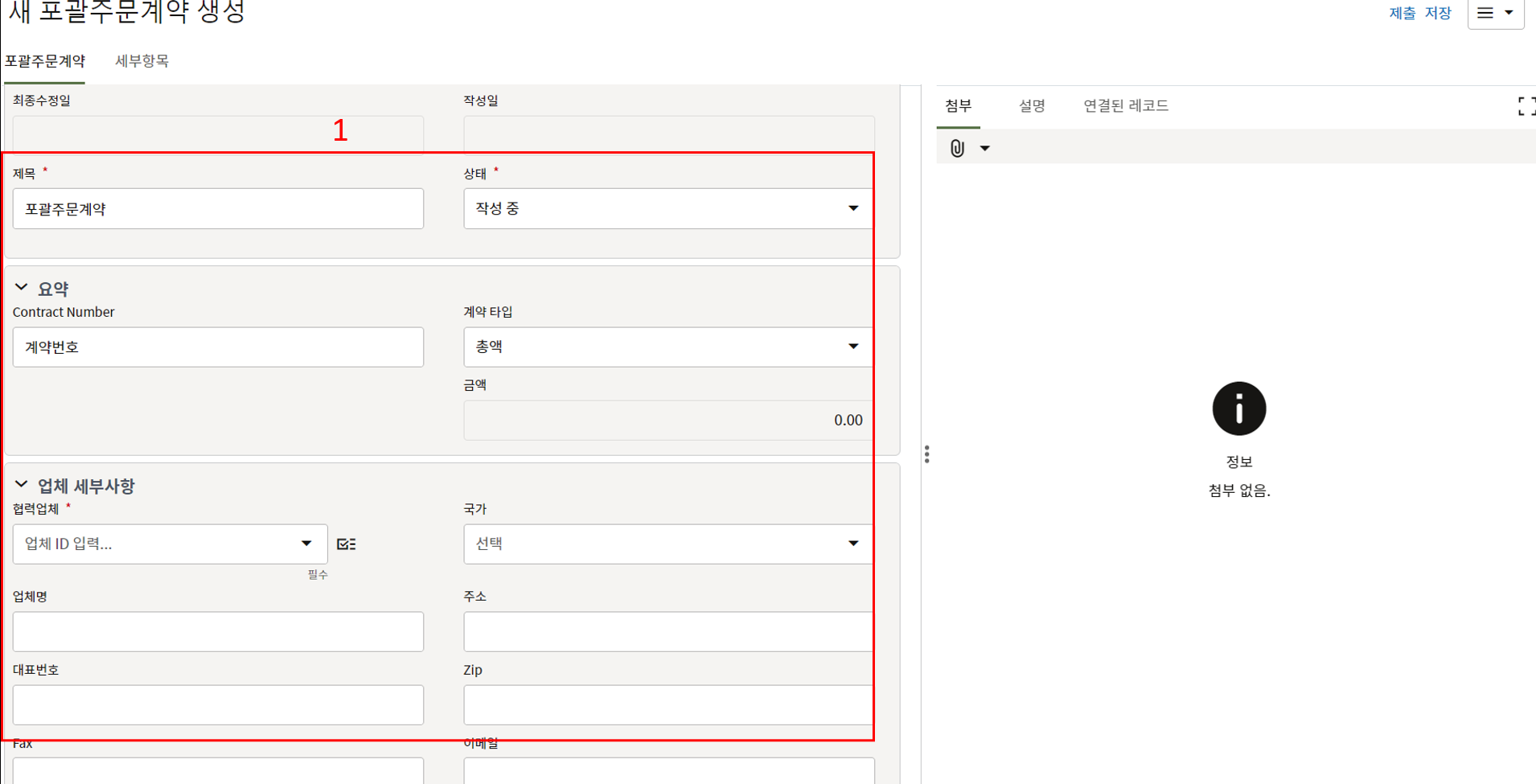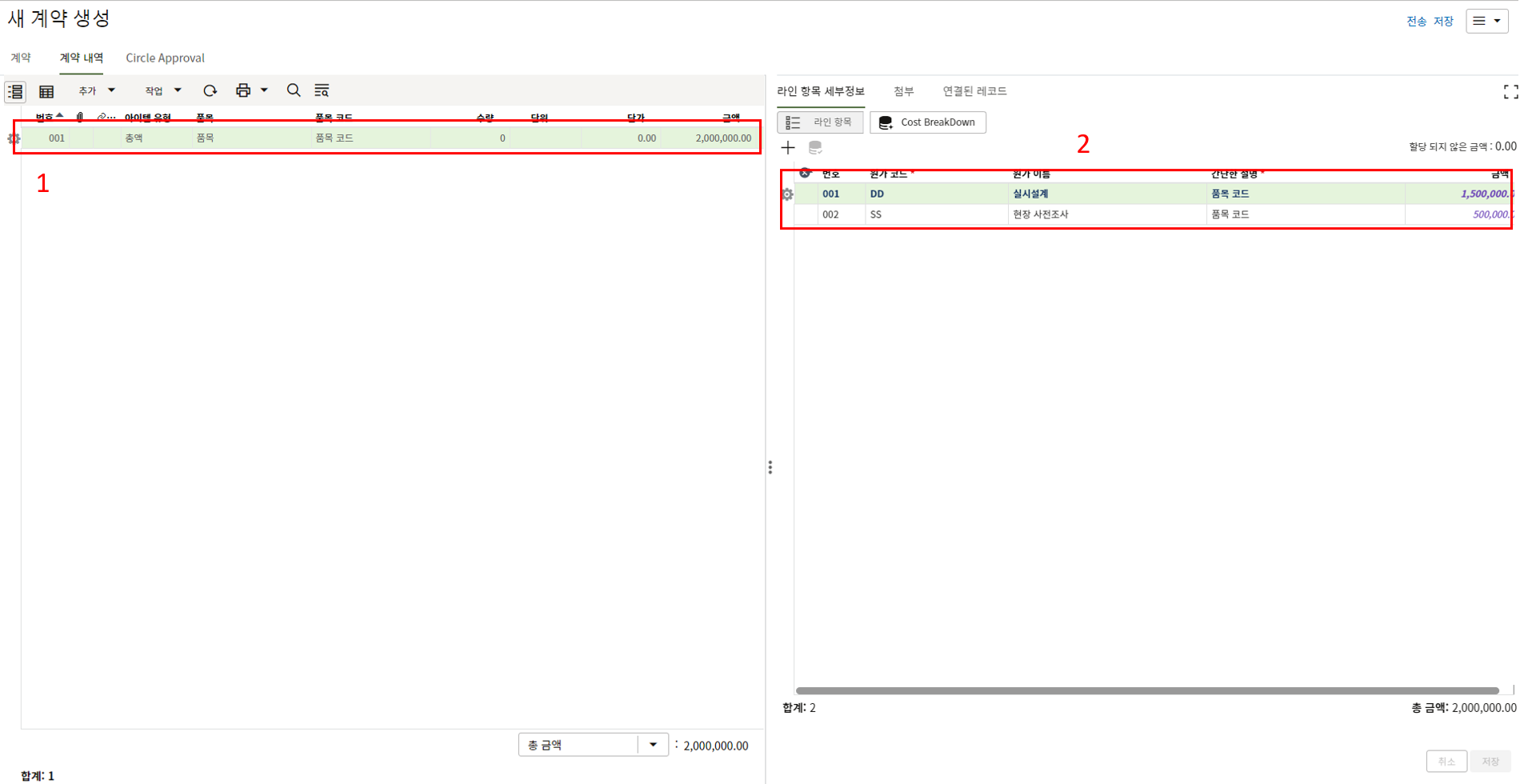 하나의 레코드에 포함되는 내역,품목등 세부사항의 내용을 입력할 수 있습니다.