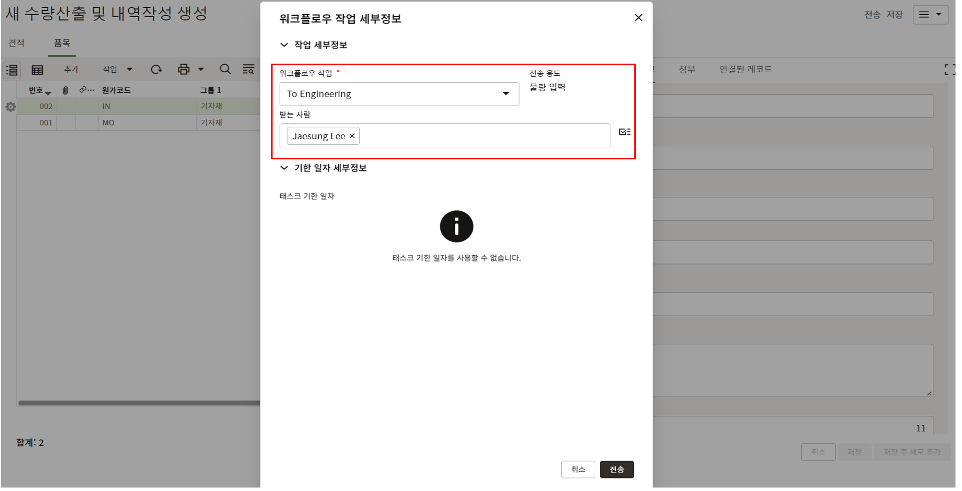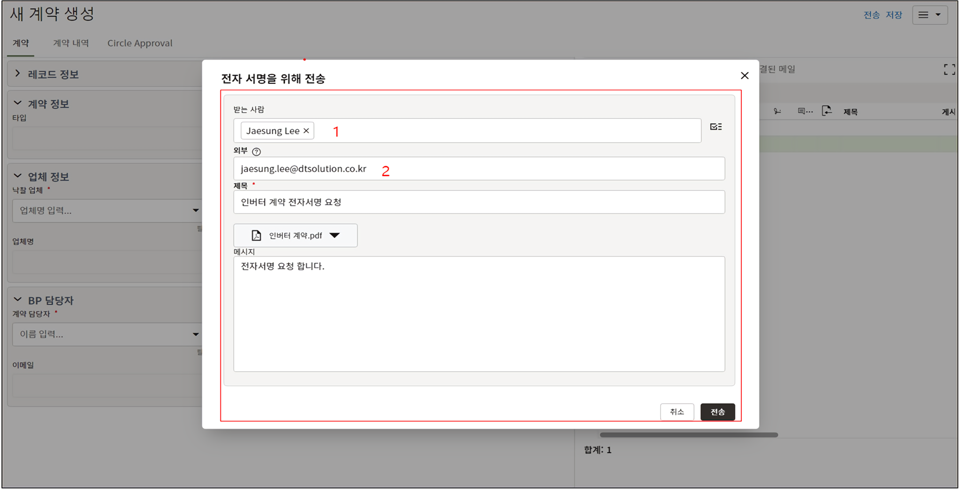 이때 "담당자"에 지정된 사람이 자동으로 수신인으로 지정됩니다.