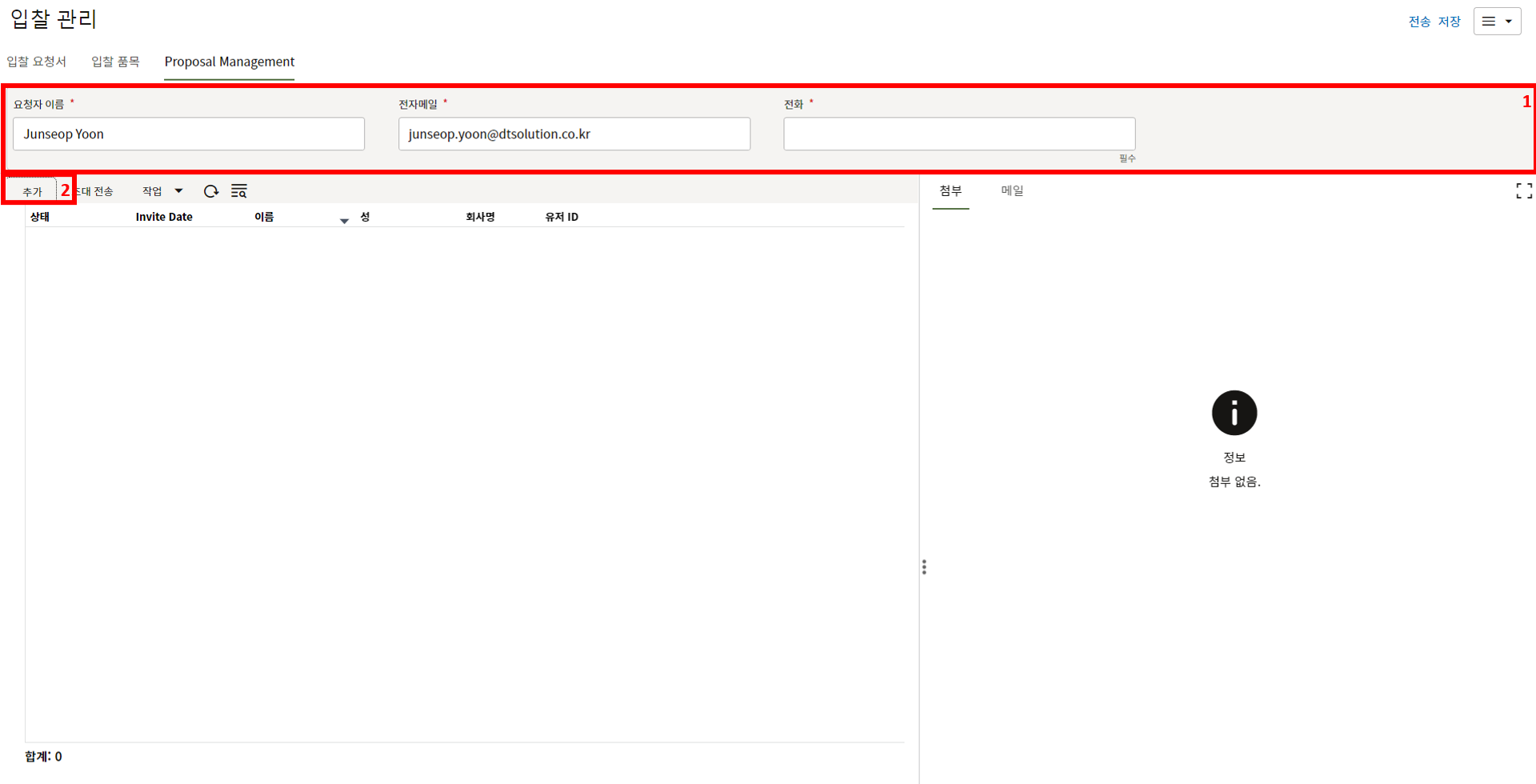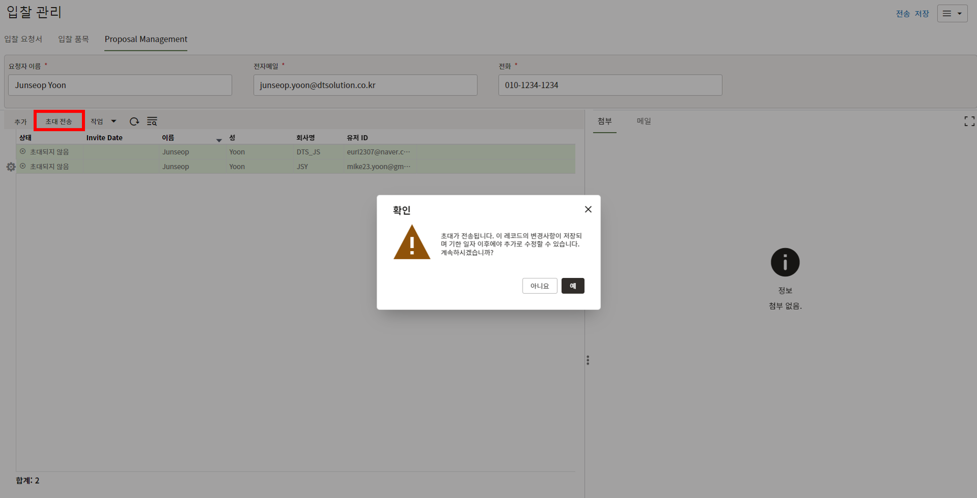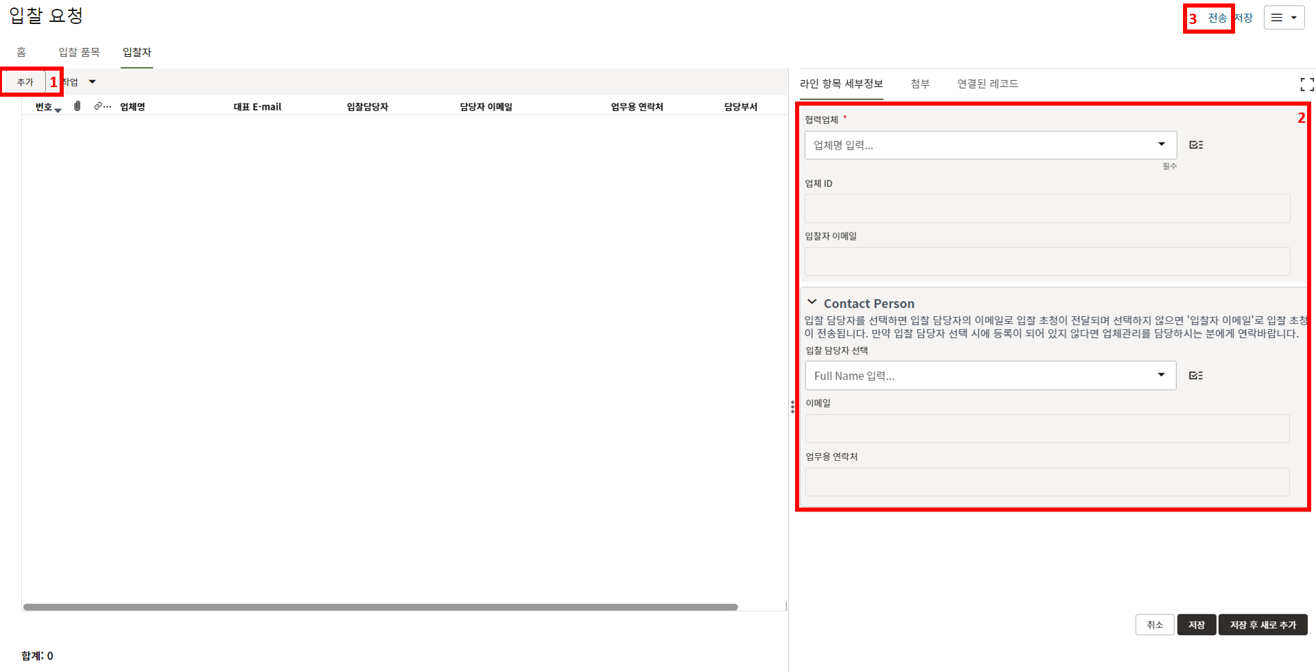 8. "추가" 버튼을 눌러 초청할 협력업체를 추가한 후 "전송"을 누릅니다.