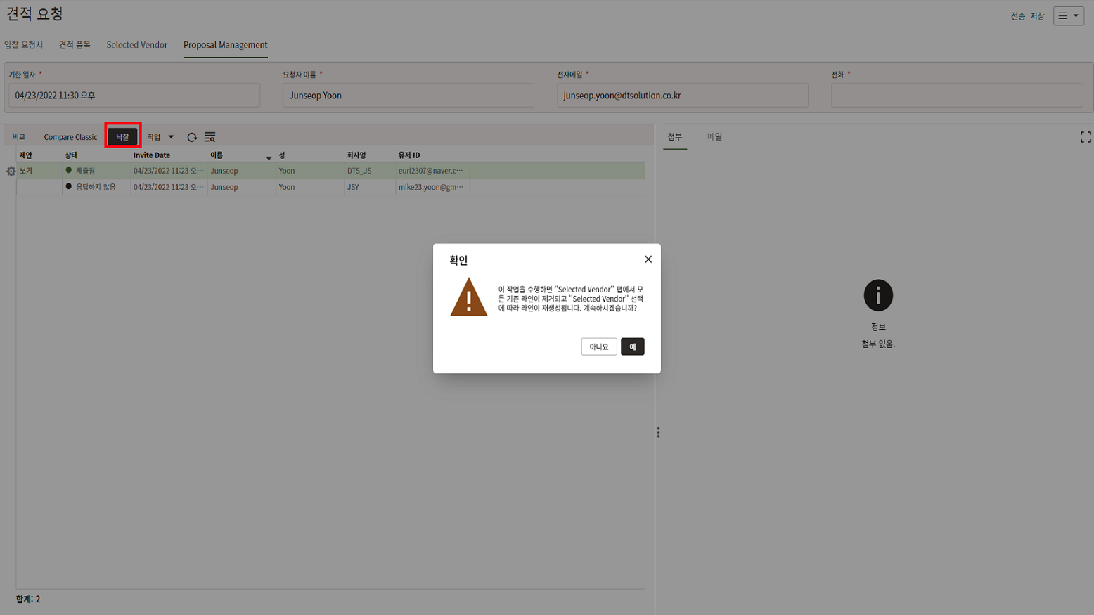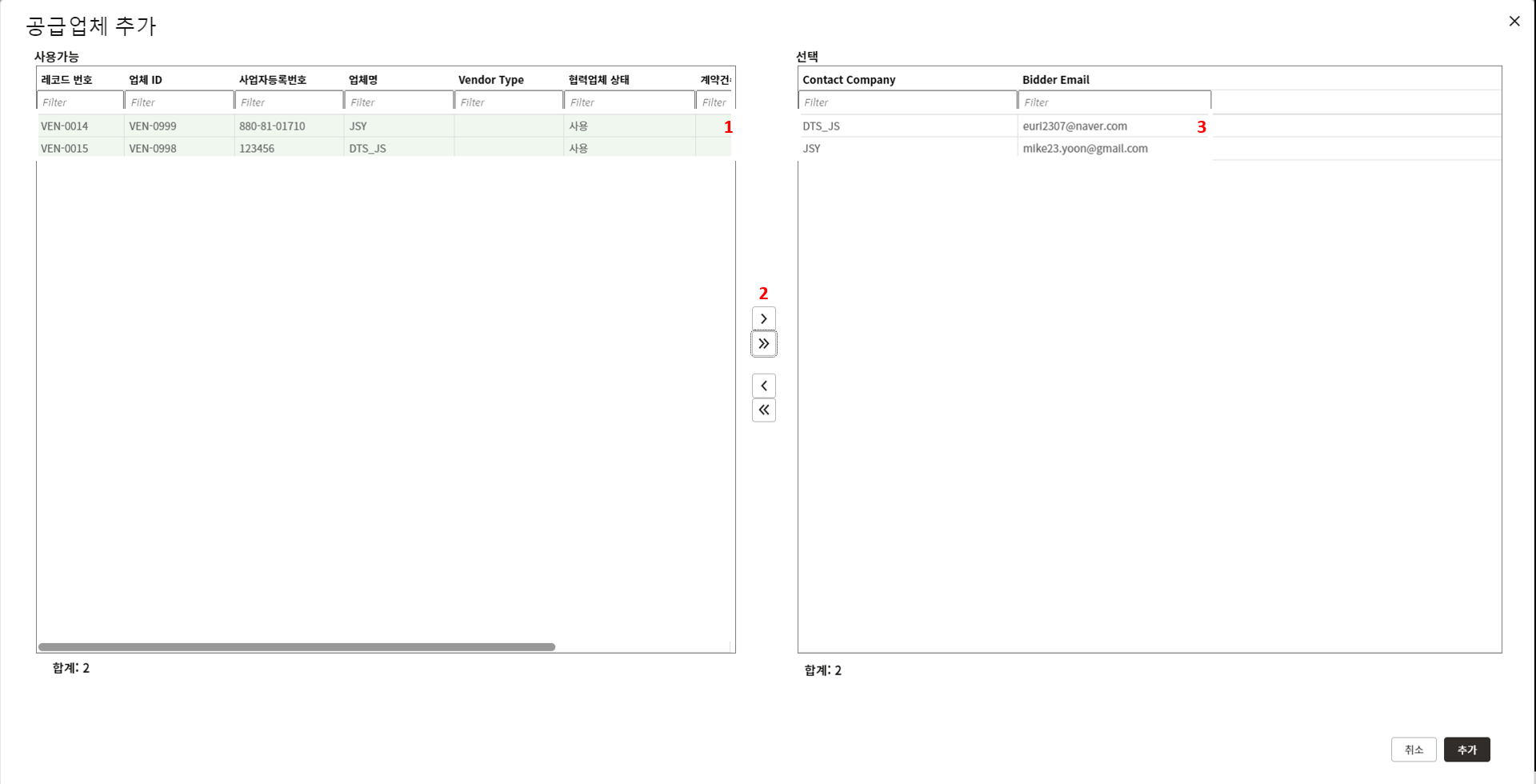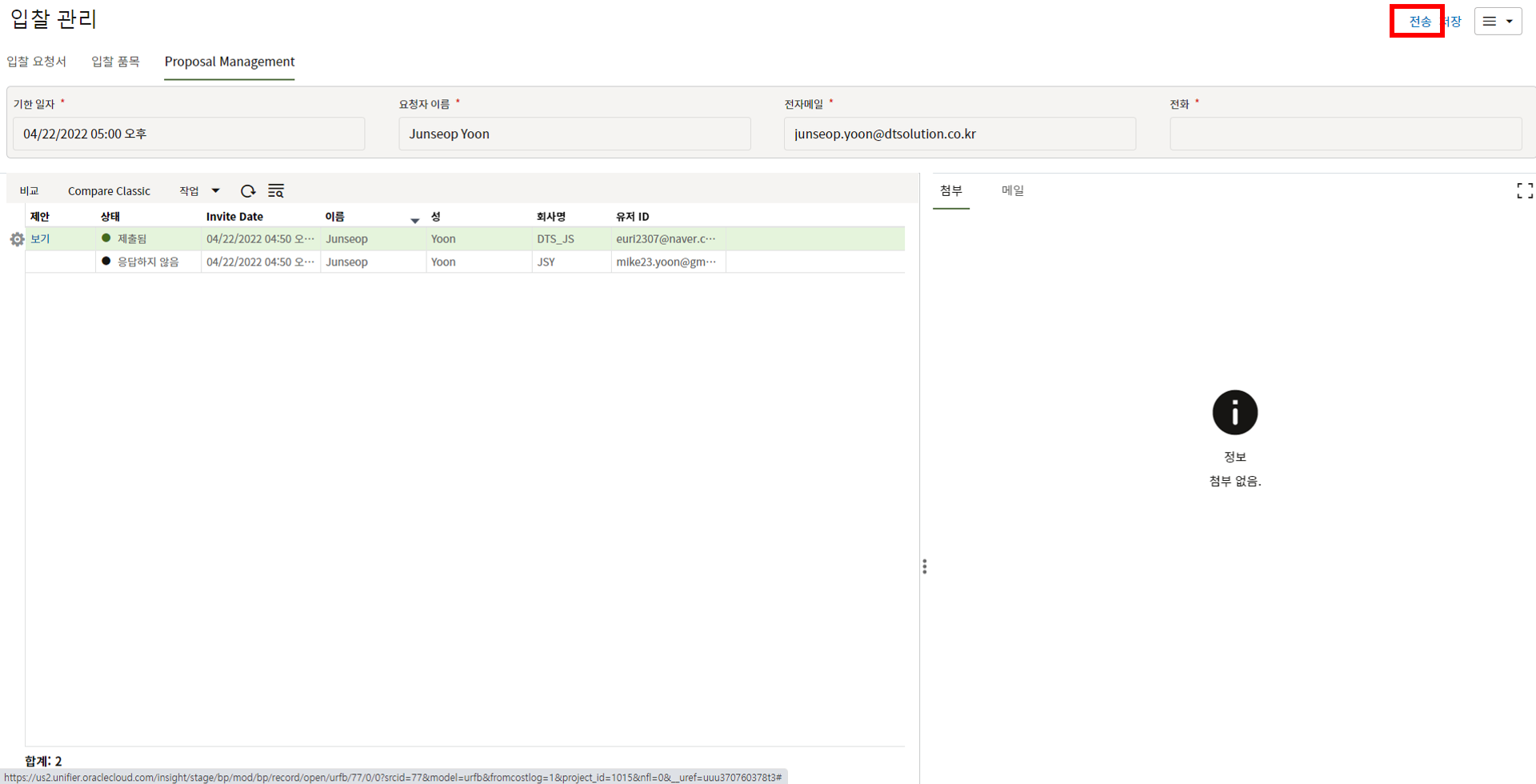 8. "추가" 버튼을 눌러 초청할 협력업체를 추가한 후 "전송"을 누릅니다.