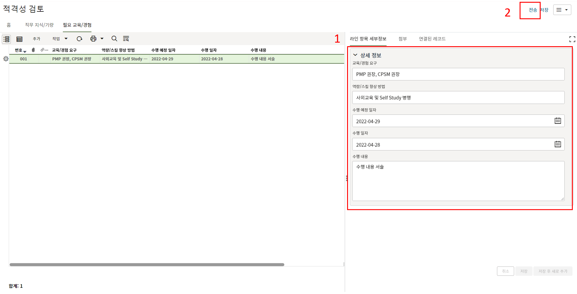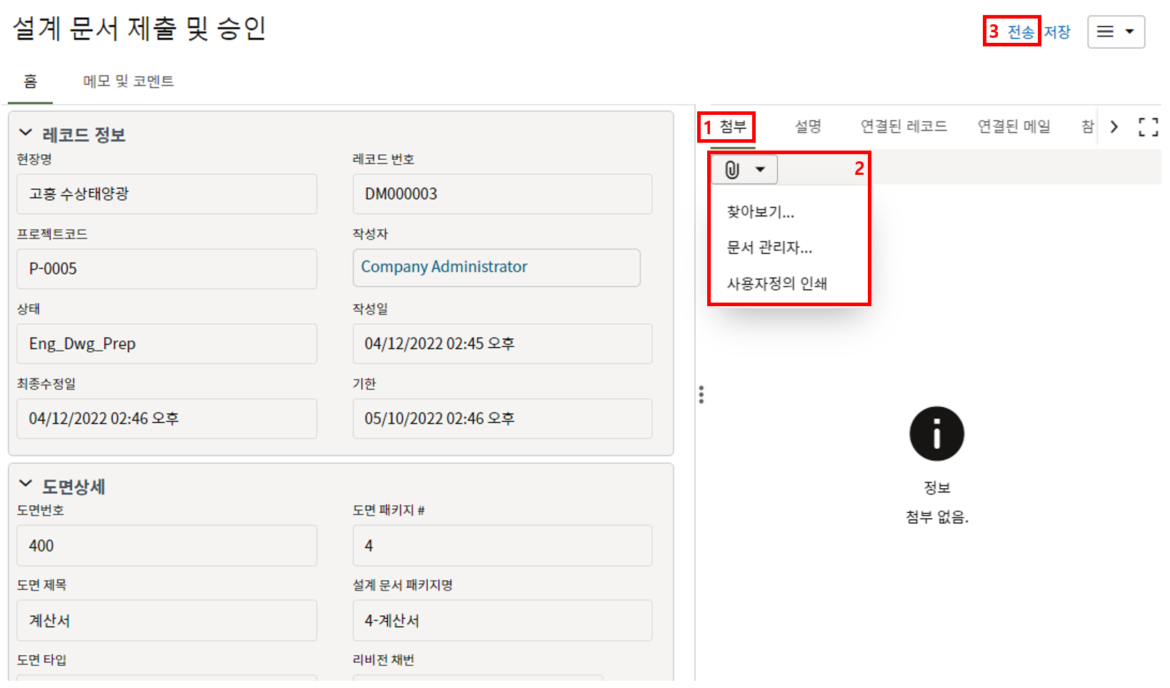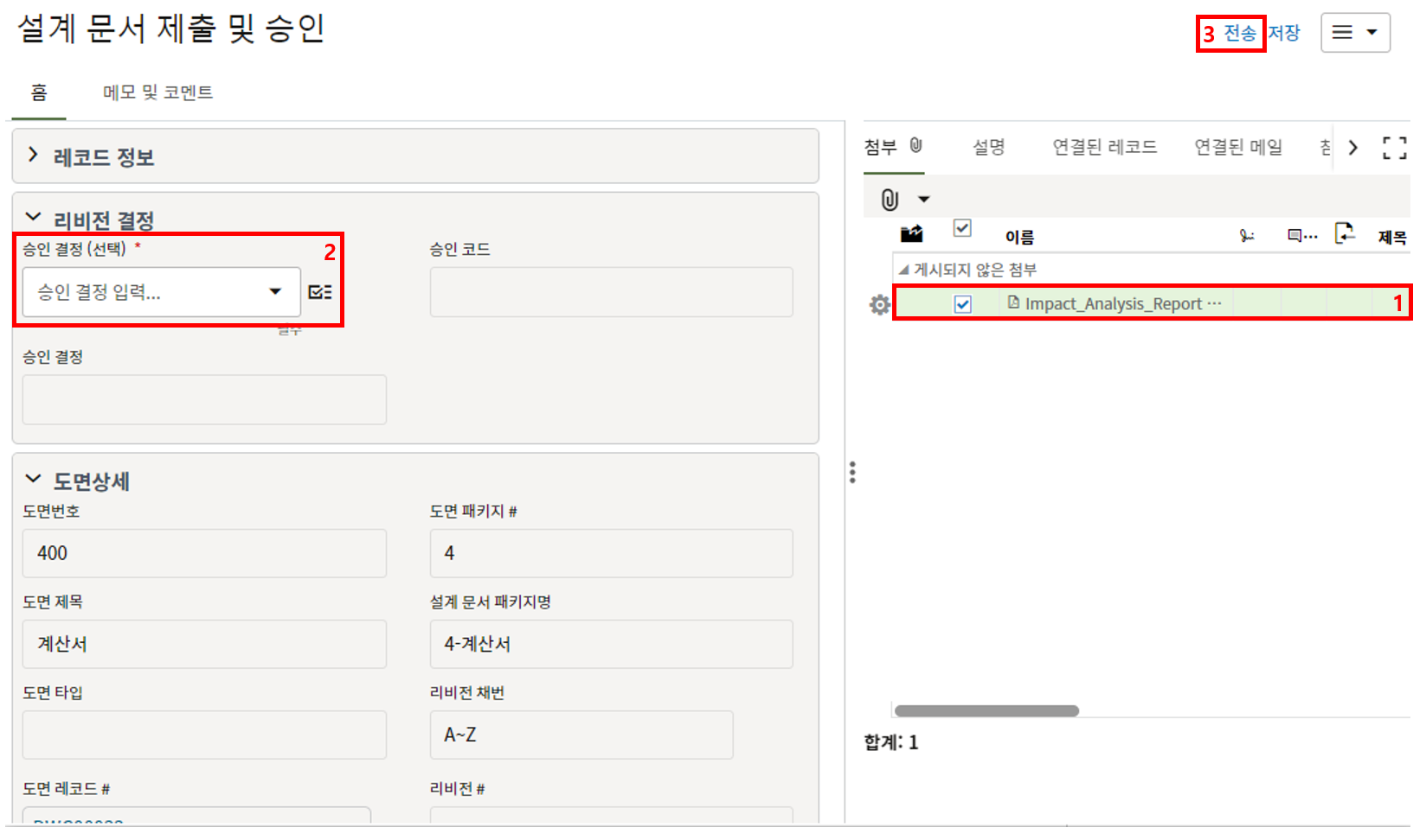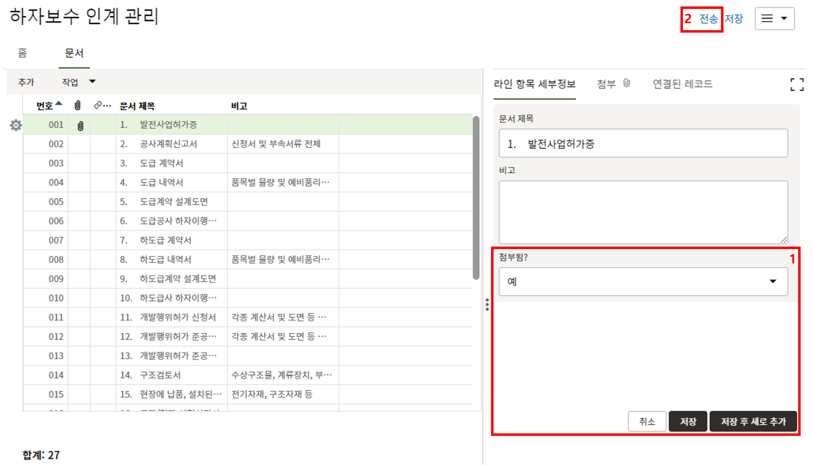 4. "세부항목" 탭에 첨부자료를 등록한 후, 검토자에게 전송합니다.