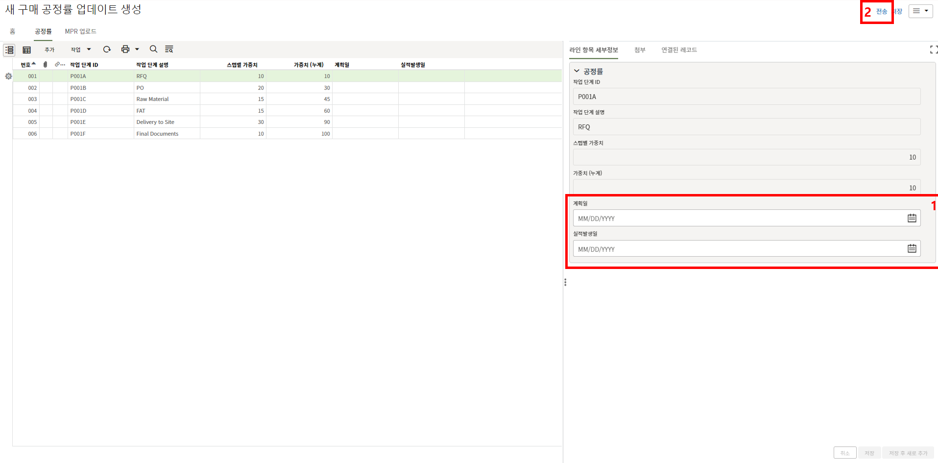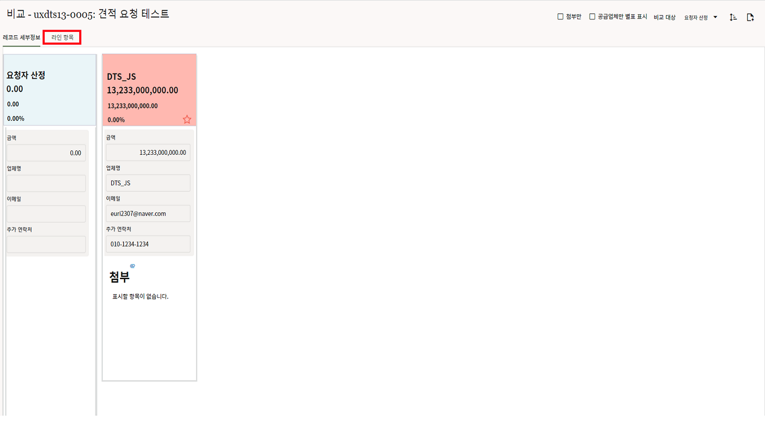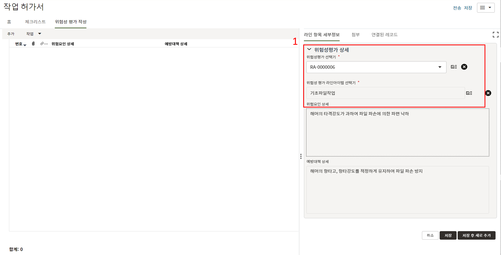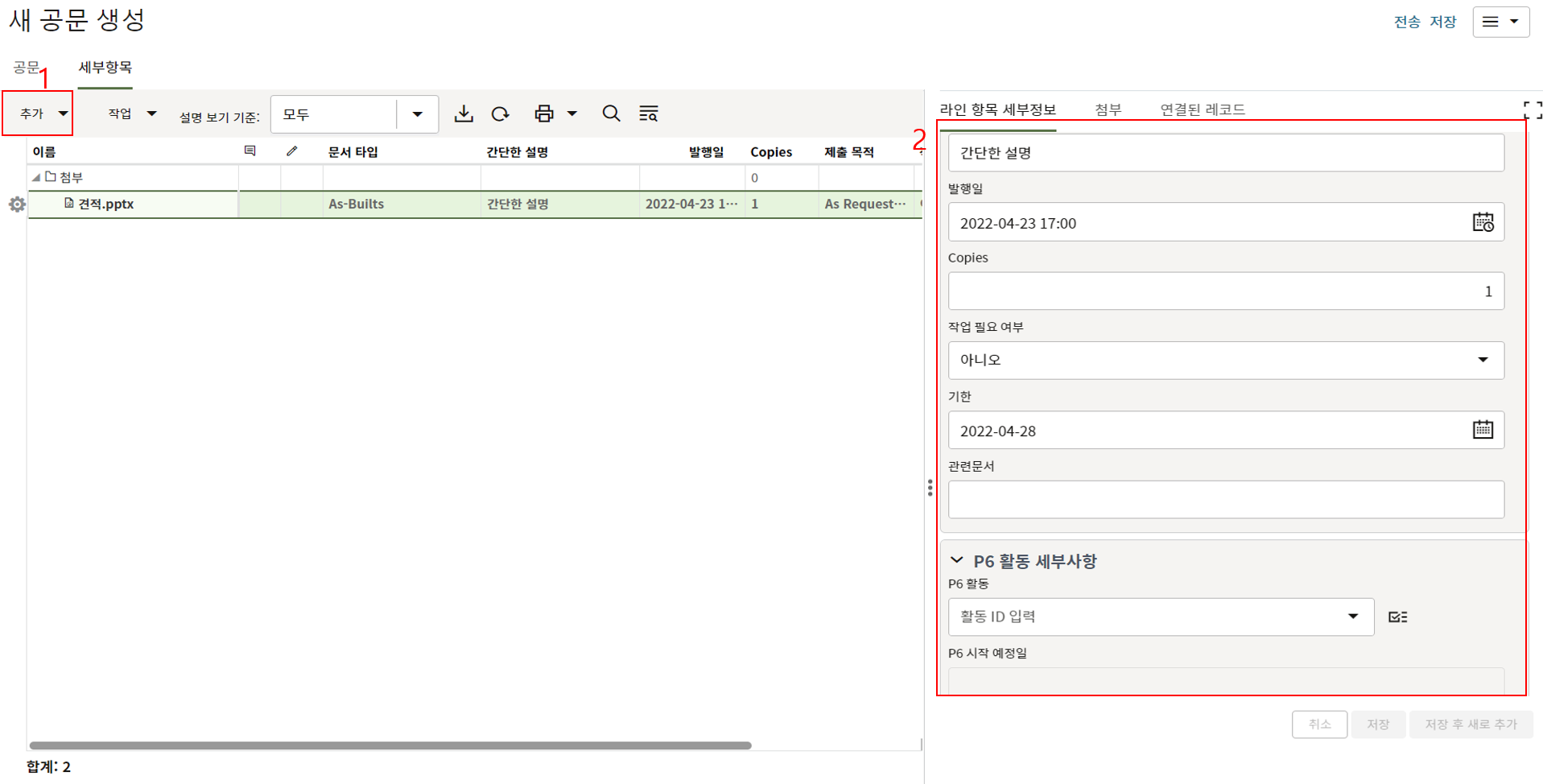 4. "세부항목" 탭에 첨부자료를 등록한 후, 검토자에게 전송합니다.