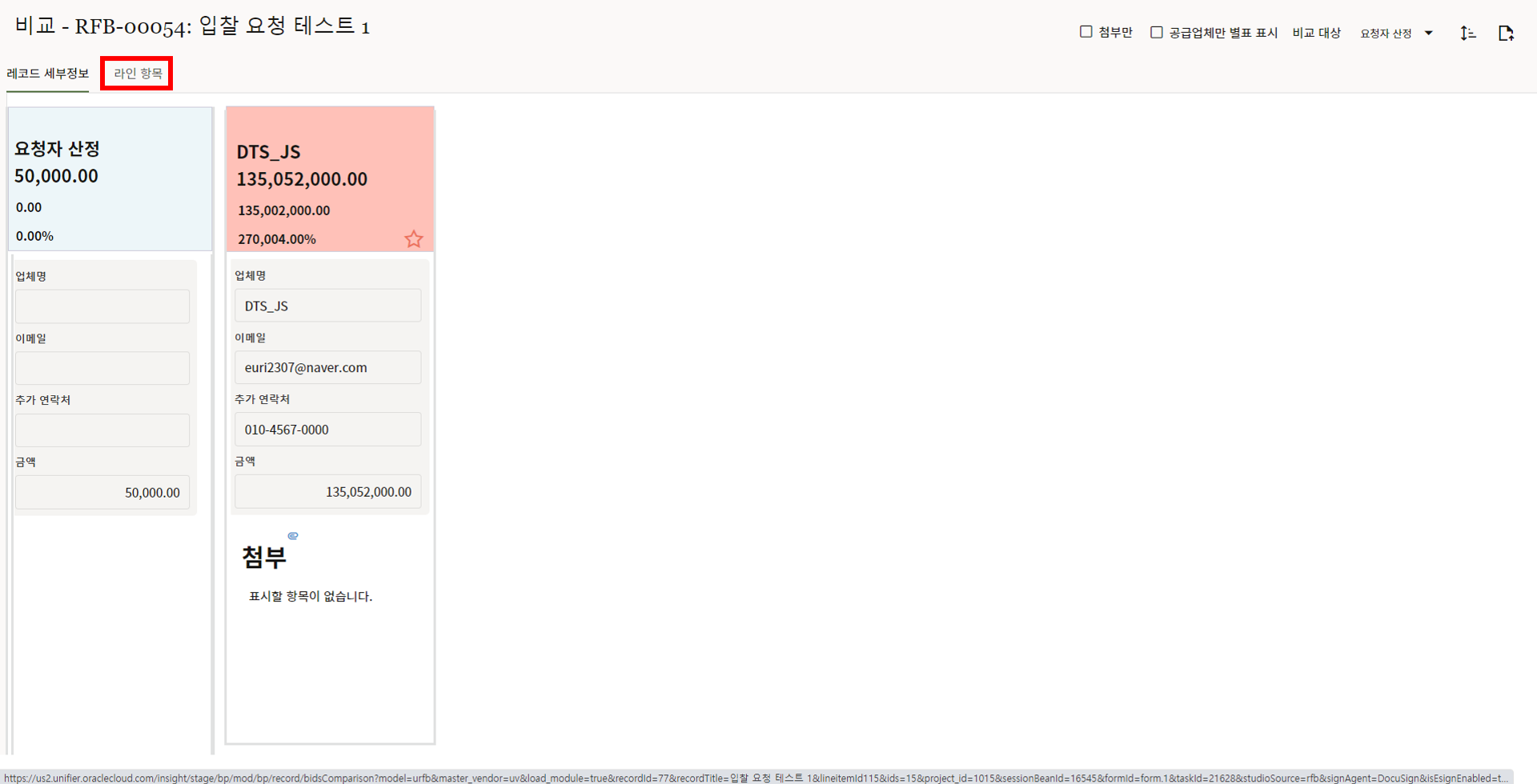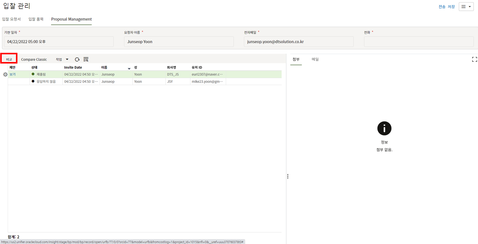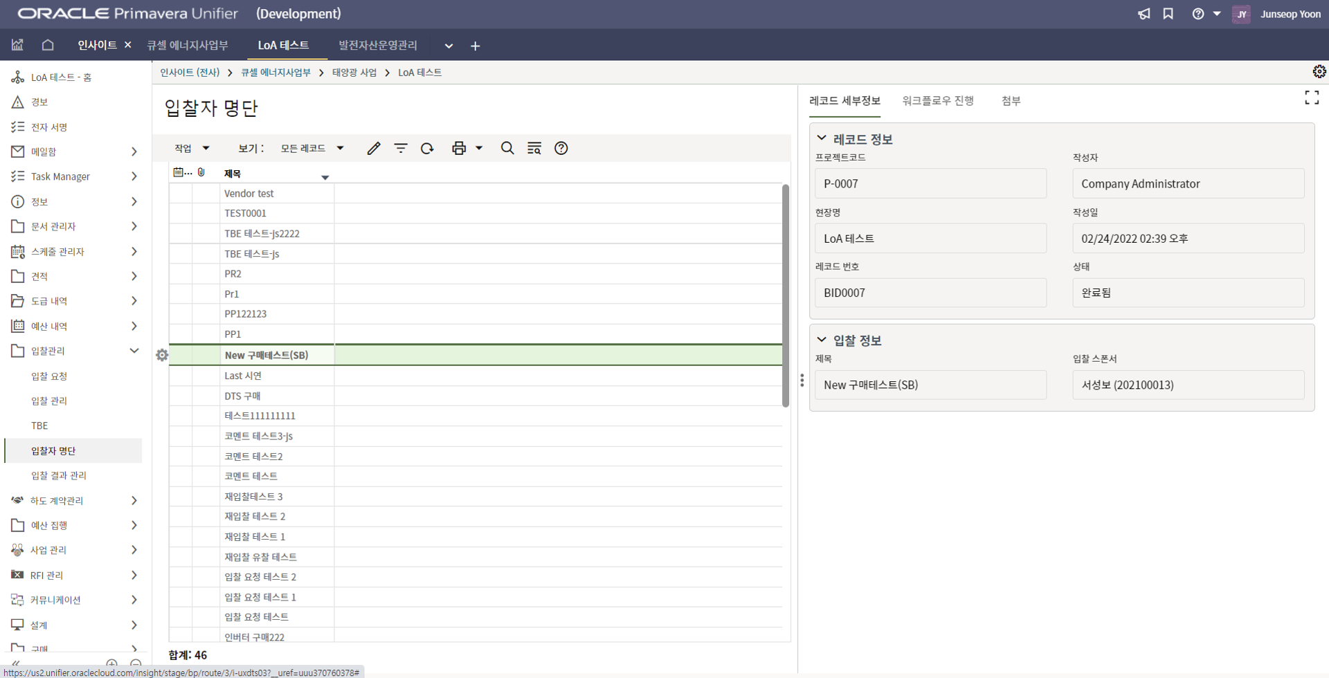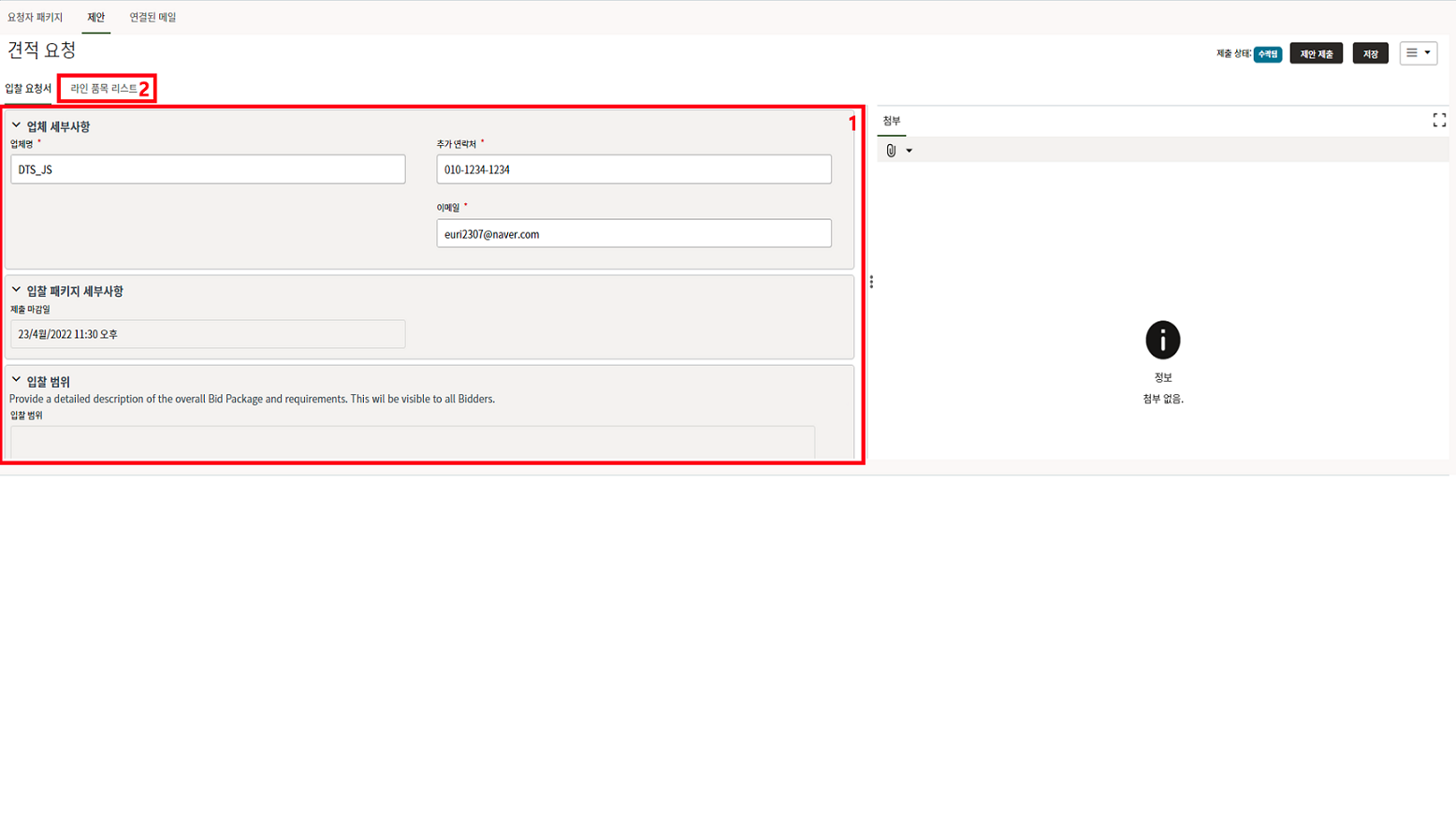 7. 입찰 담당자는 내용을 확인한 후 입찰업체 초청을 위해 "입찰자" 탭으로 이동합니다.