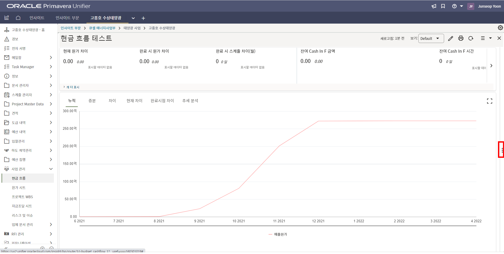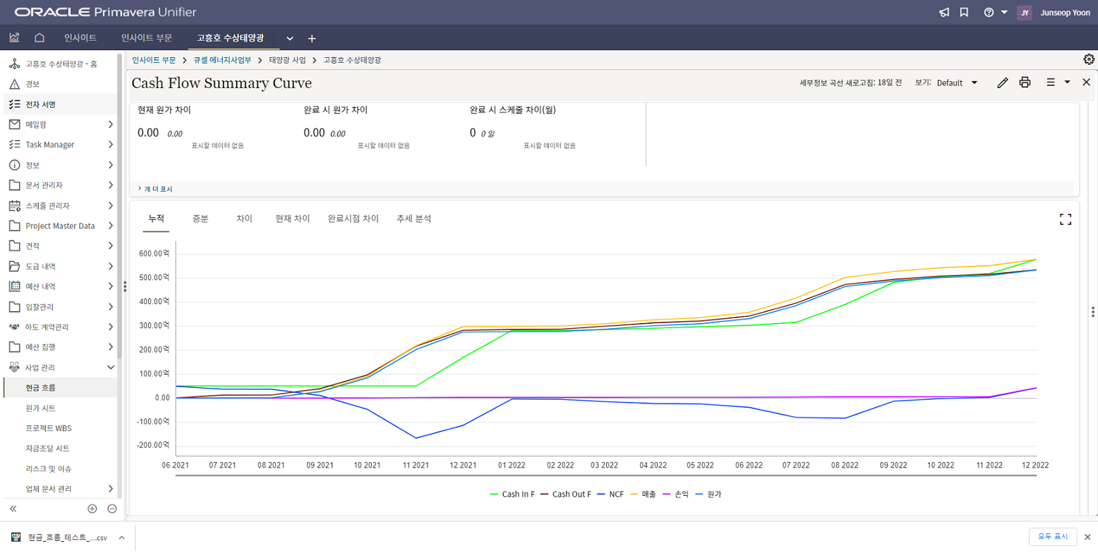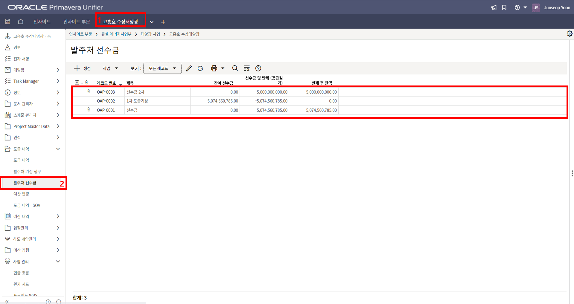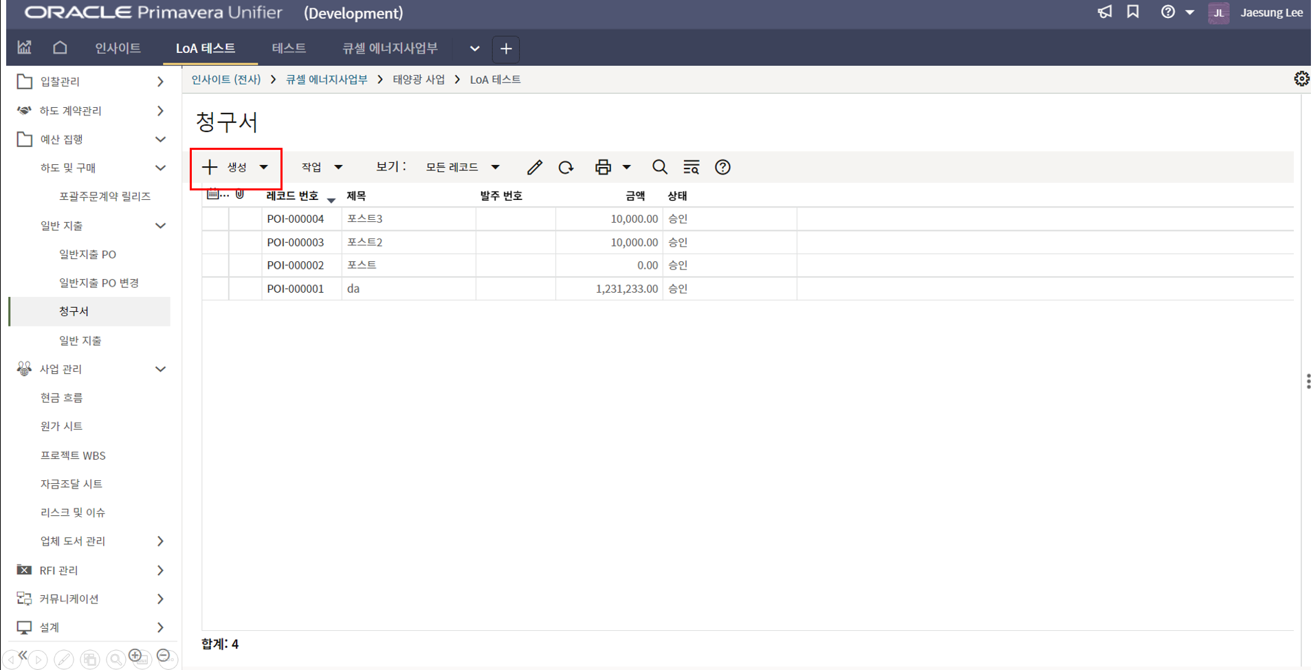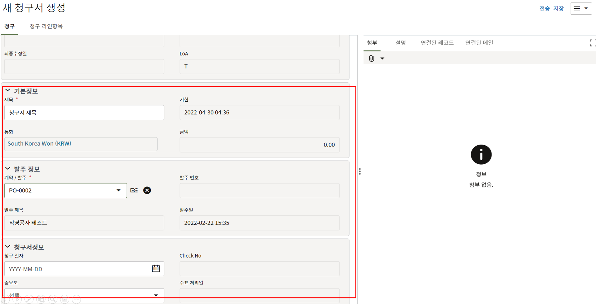 4. 프로젝트 SAP 오더번호를 입력합니다. 입력된 오더번호와 매칭되는 전표들이 "청구서" 메뉴에 생성됩니다.
