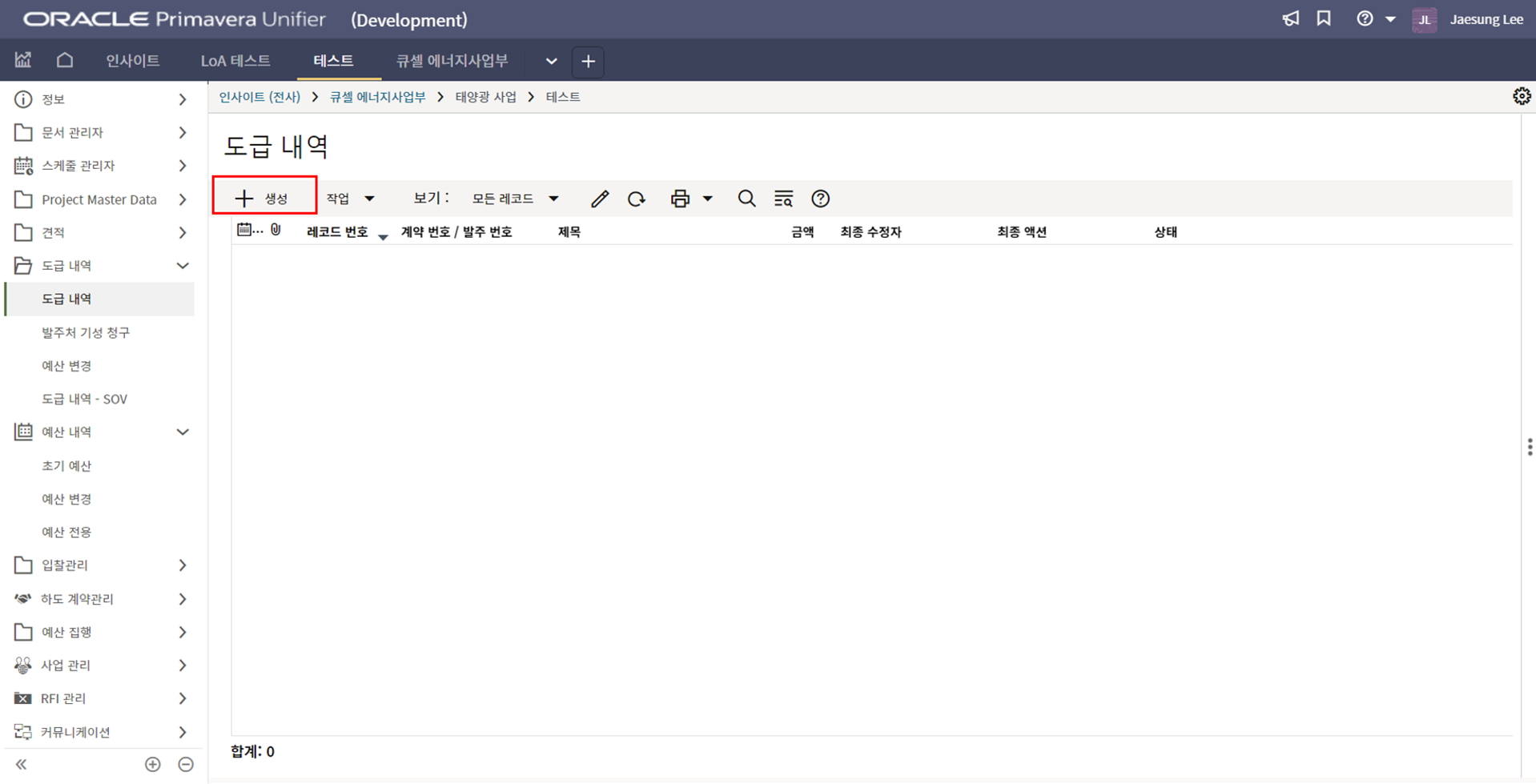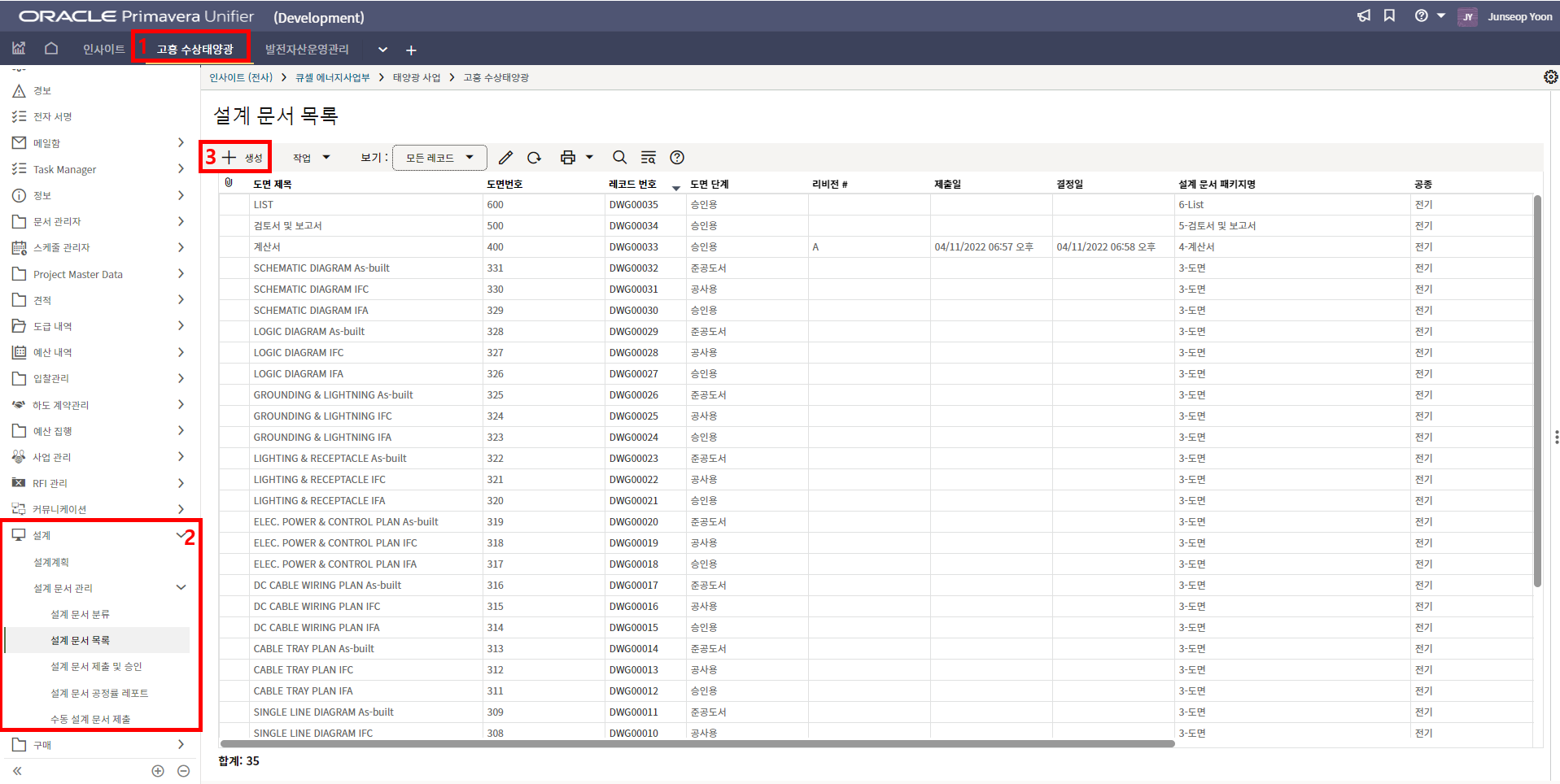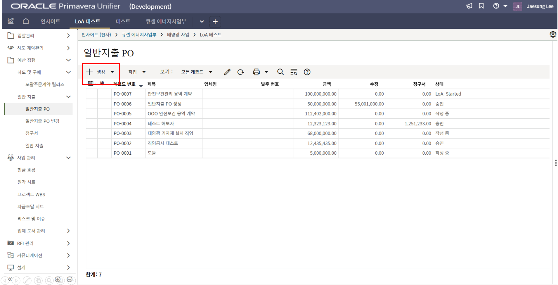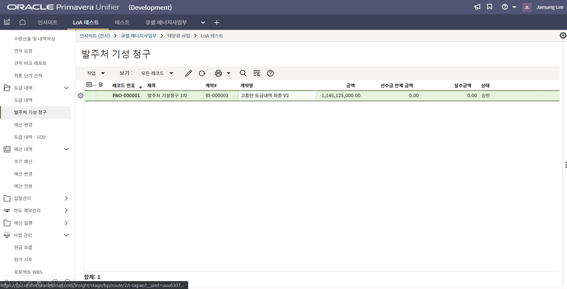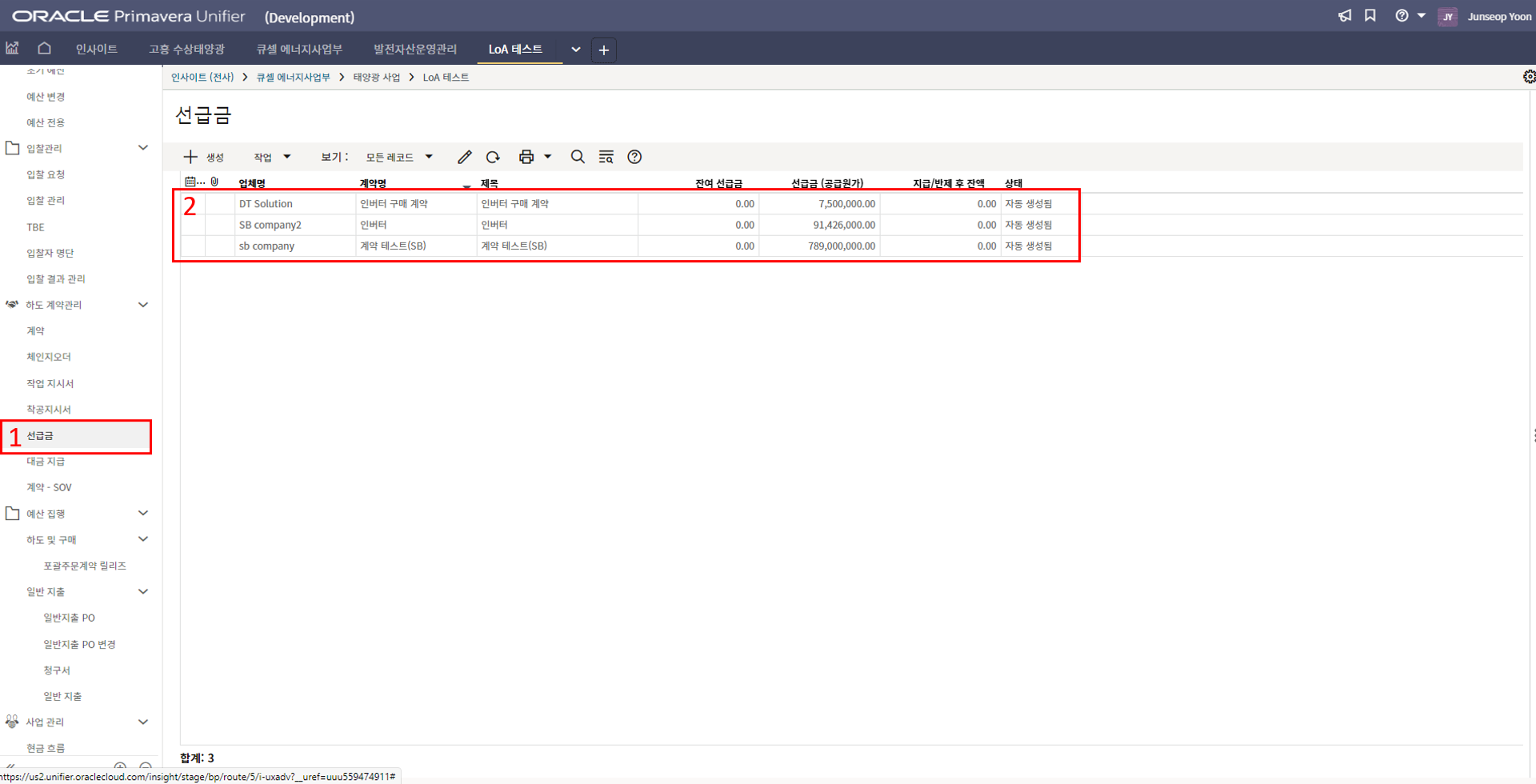 4. 프로젝트 SAP 오더번호를 입력합니다. 입력된 오더번호와 매칭되는 전표들이 "청구서" 메뉴에 생성됩니다.