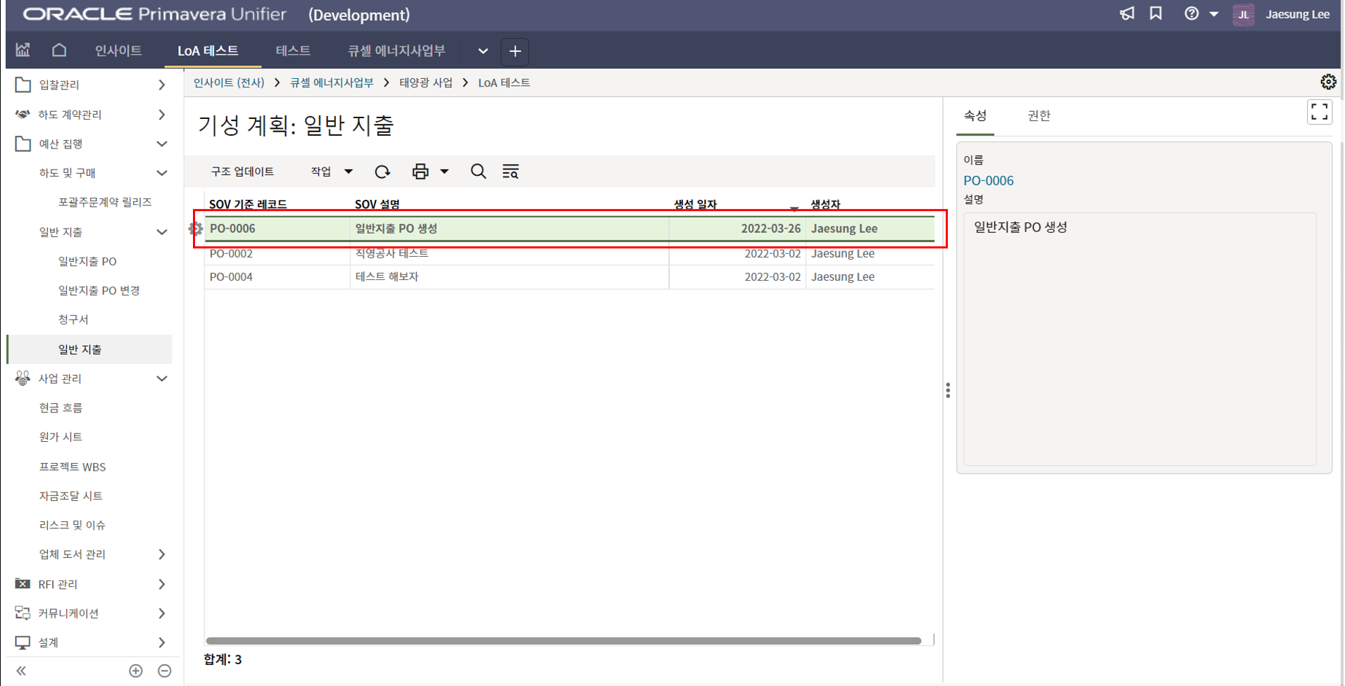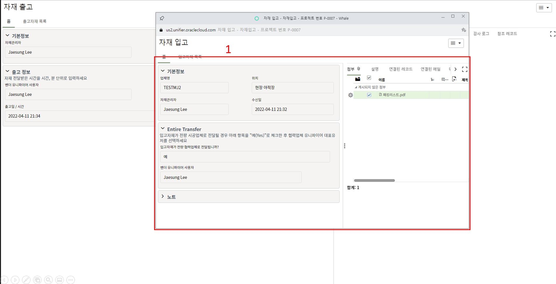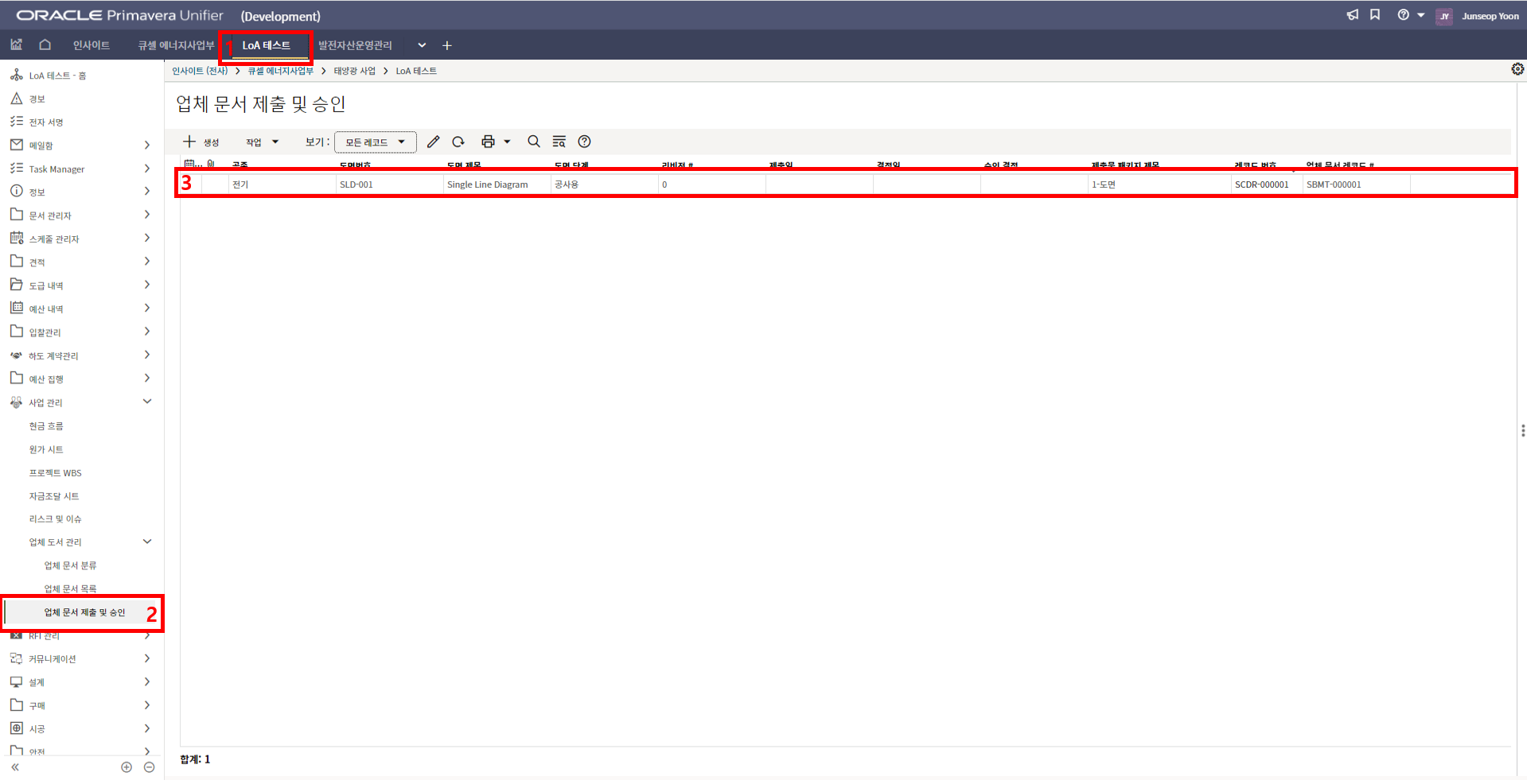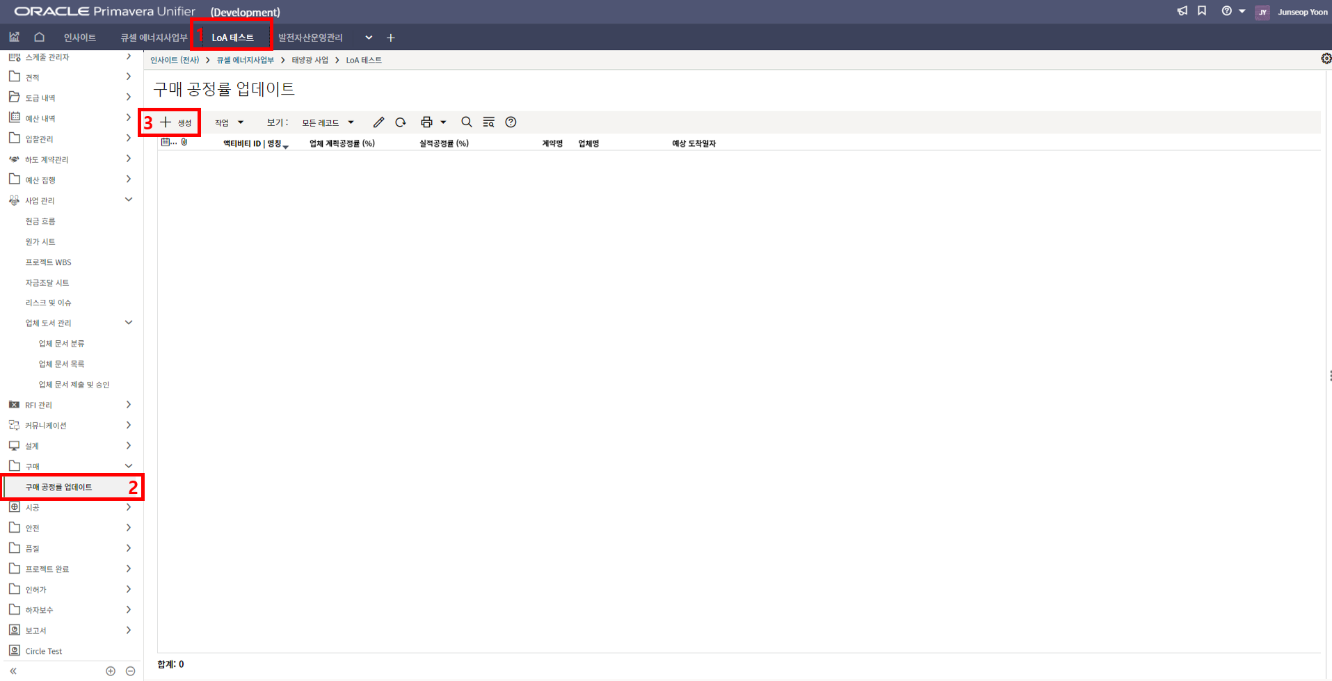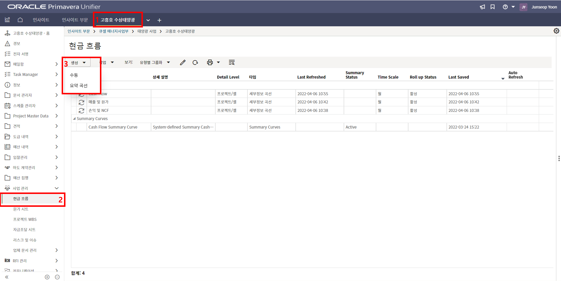 4. 프로젝트 SAP 오더번호를 입력합니다. 입력된 오더번호와 매칭되는 전표들이 "청구서" 메뉴에 생성됩니다.