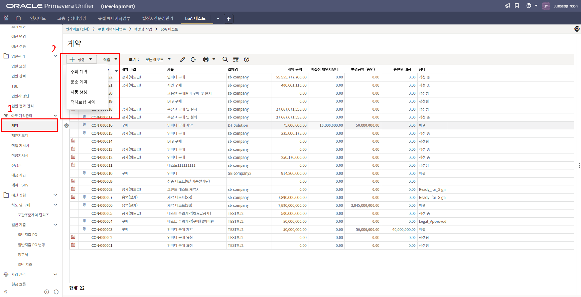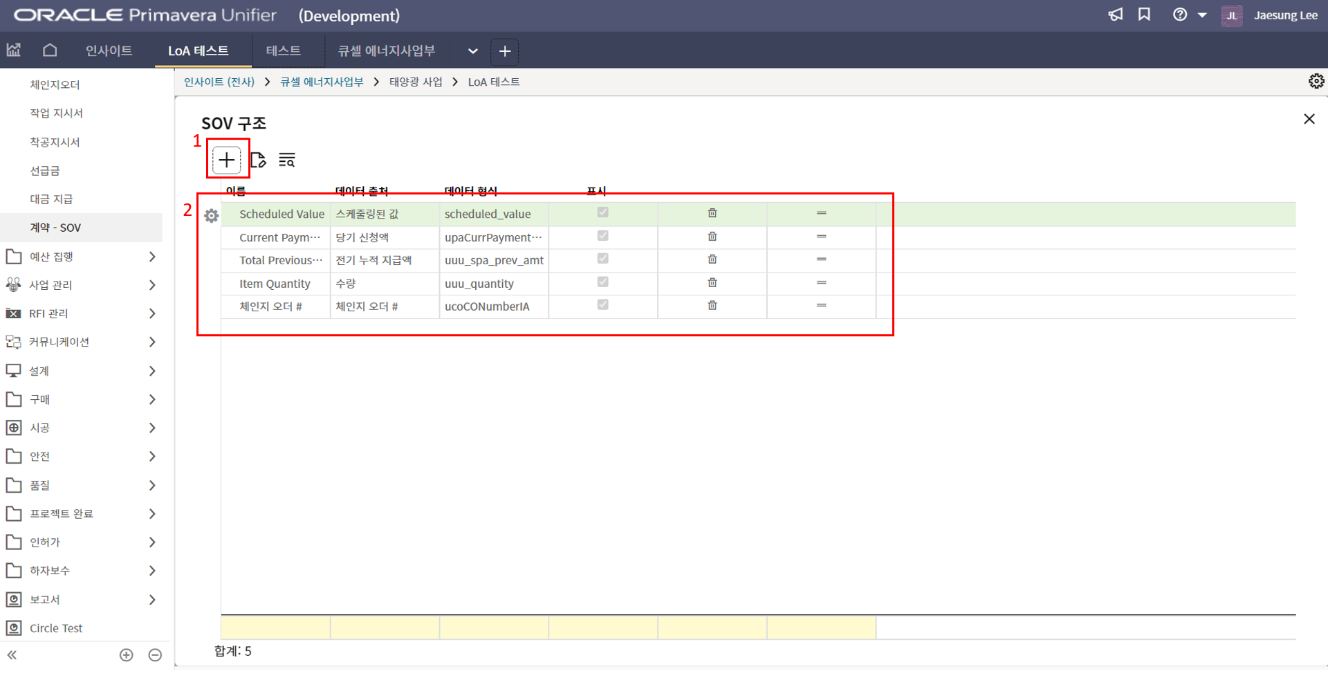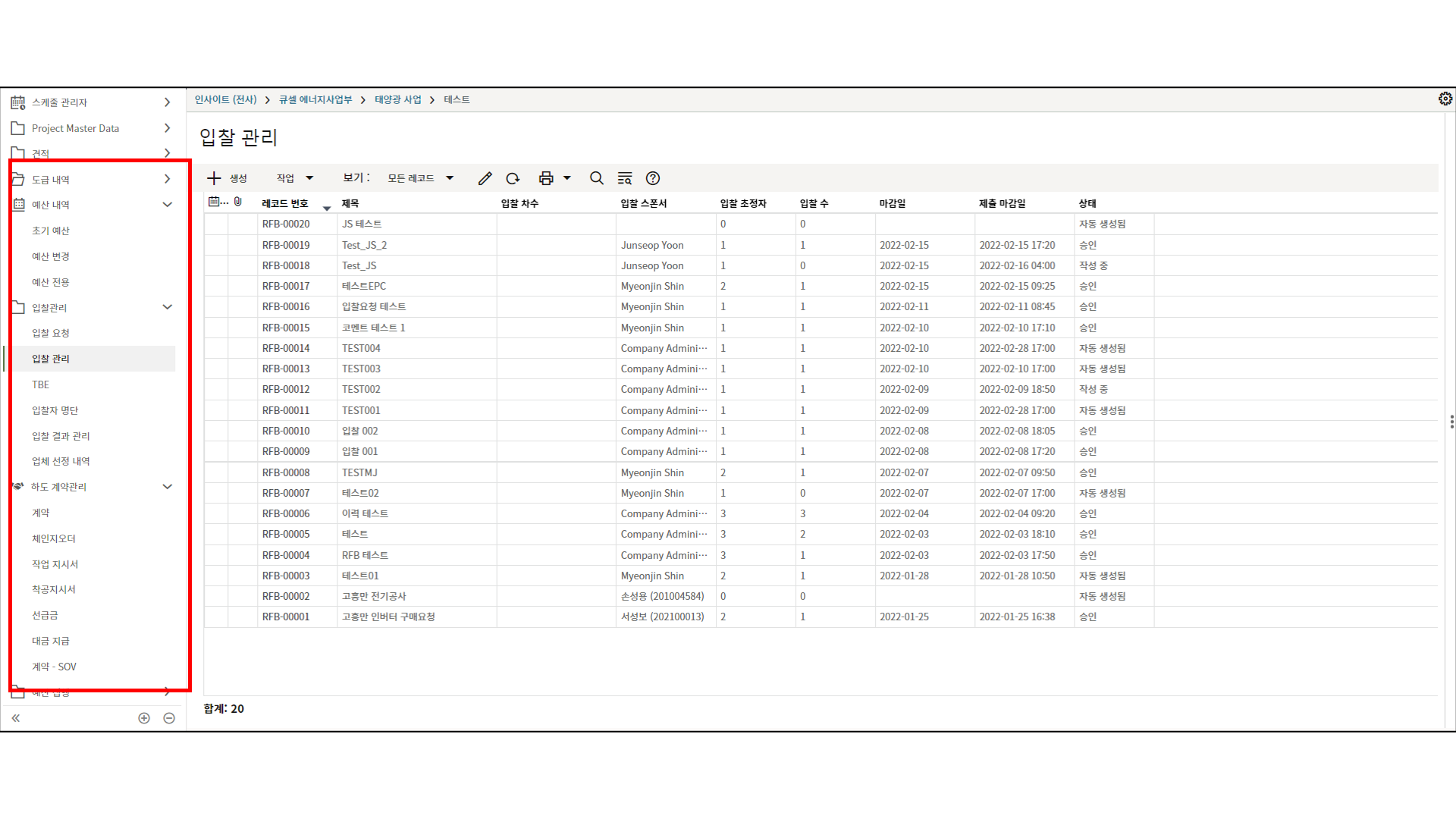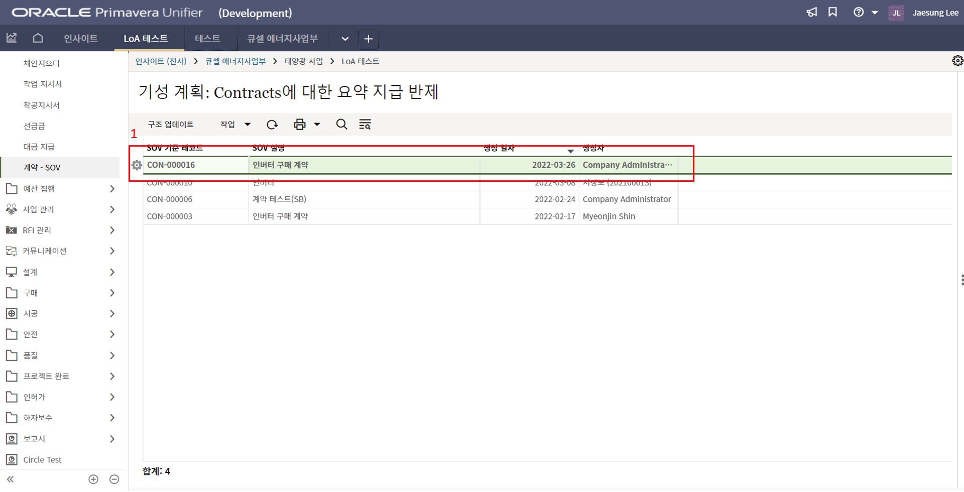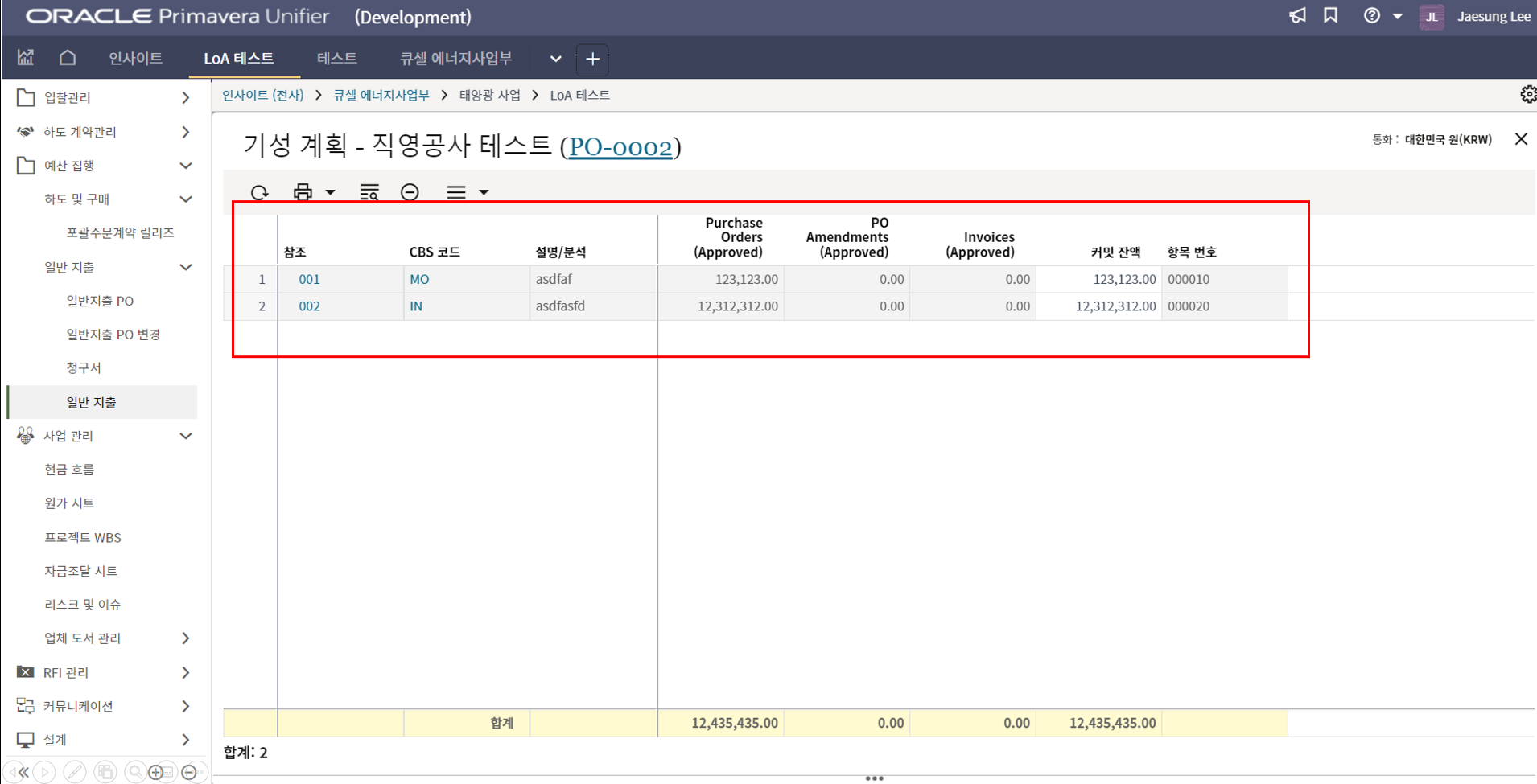 4. 프로젝트 SAP 오더번호를 입력합니다. 입력된 오더번호와 매칭되는 전표들이 "청구서" 메뉴에 생성됩니다.