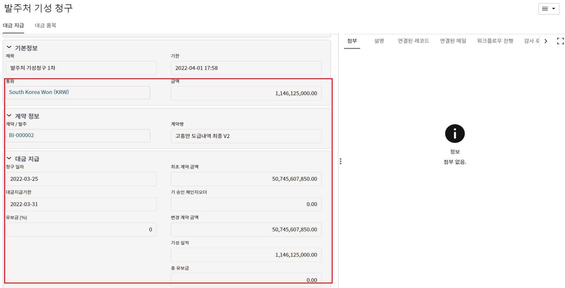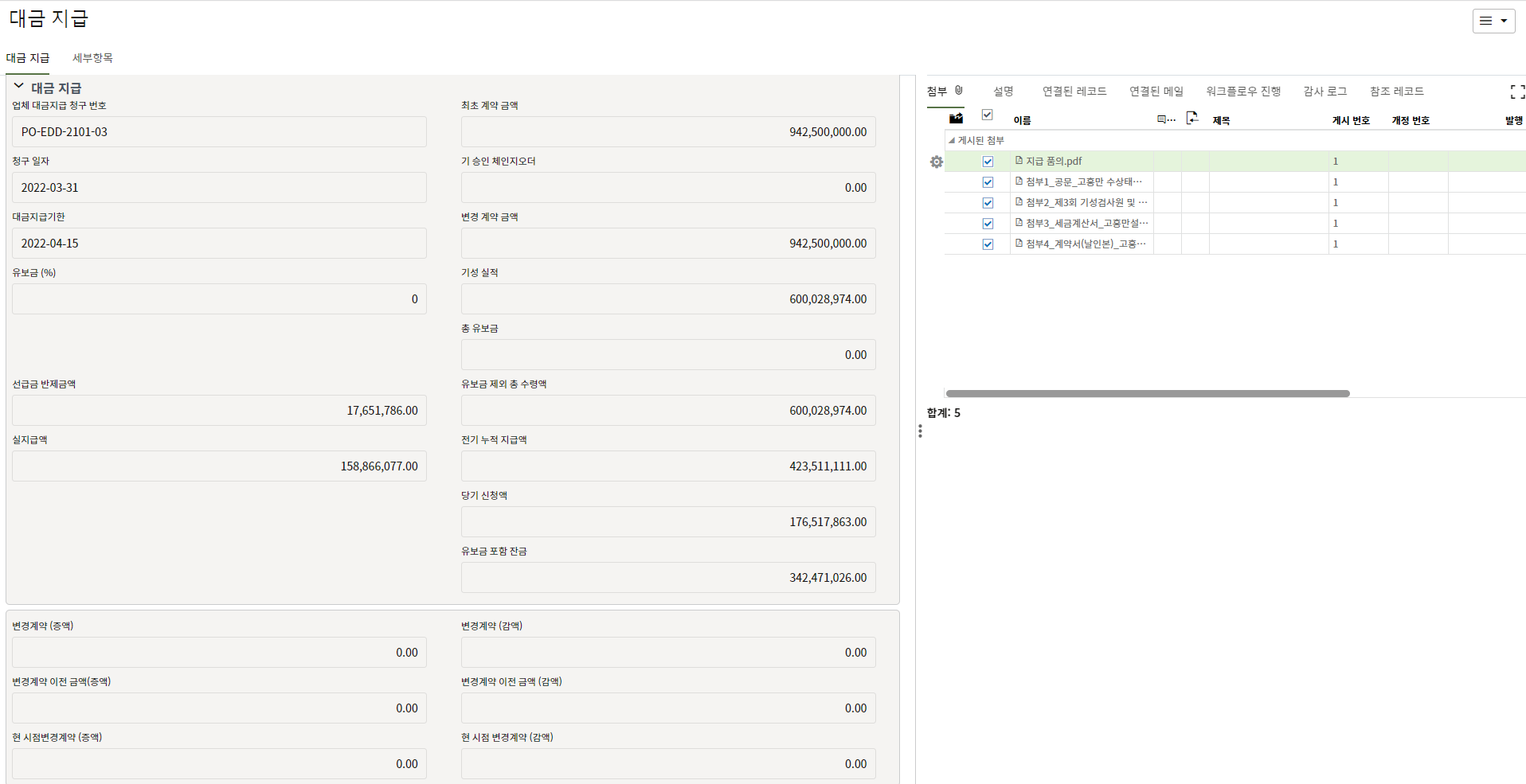 5. 계약내역에 대한 기성 실적정보을 입력합니다.