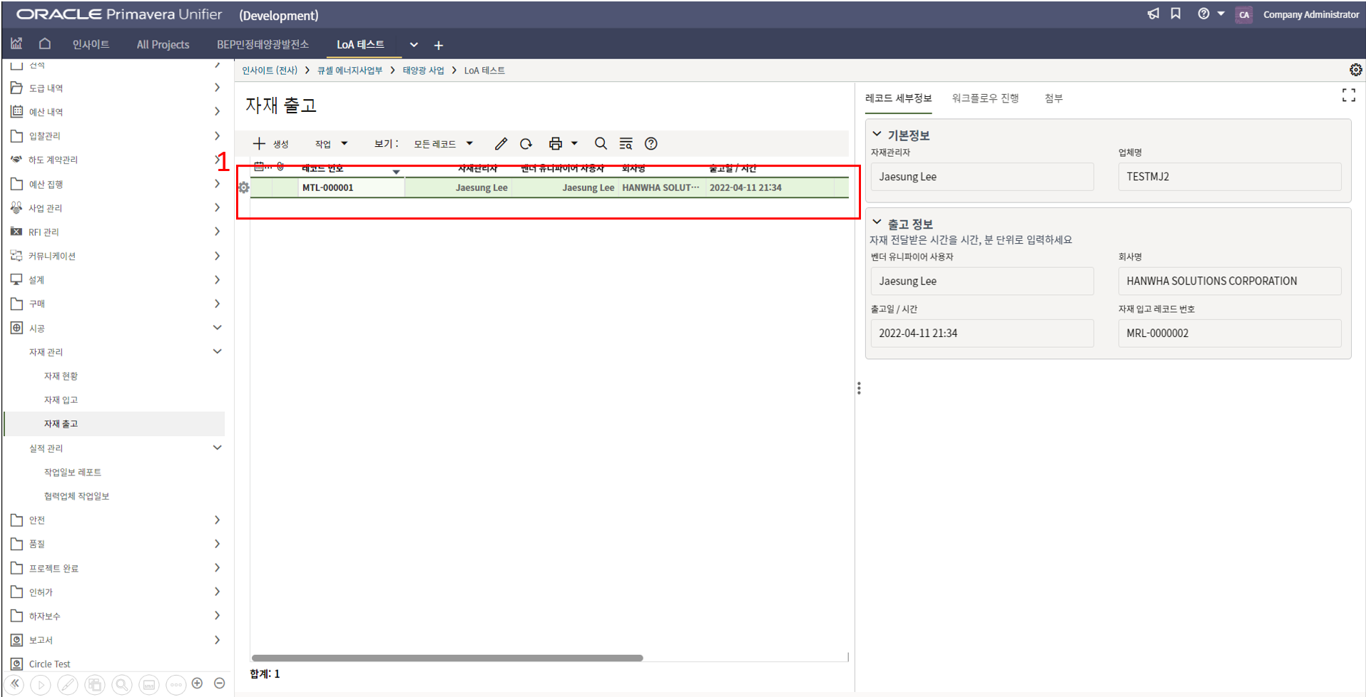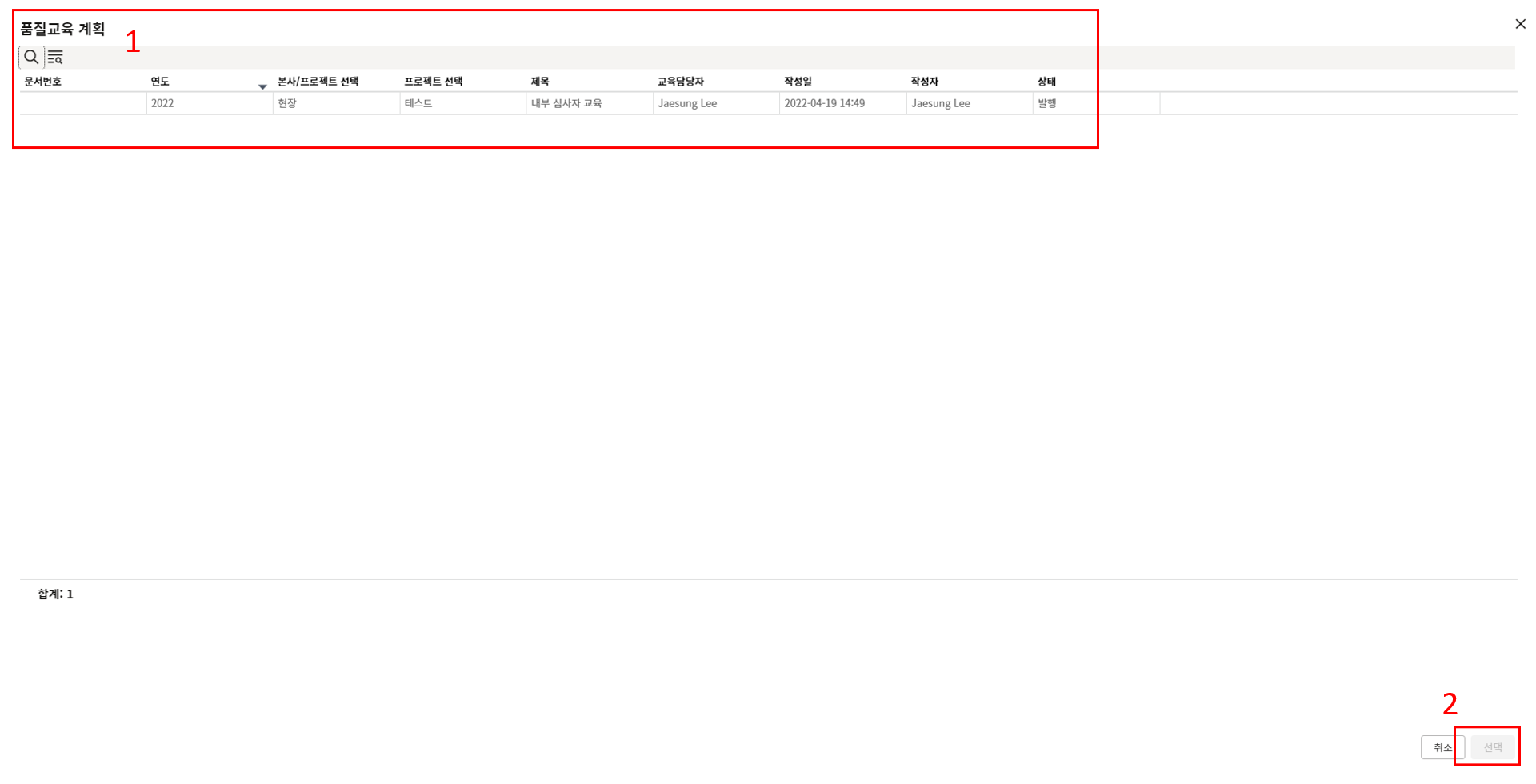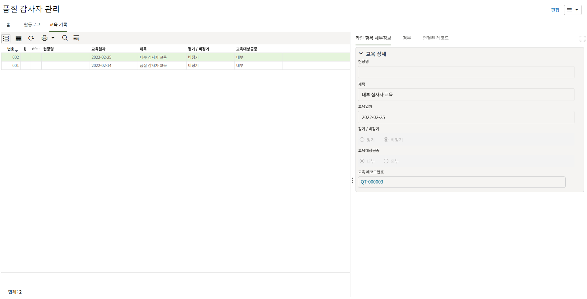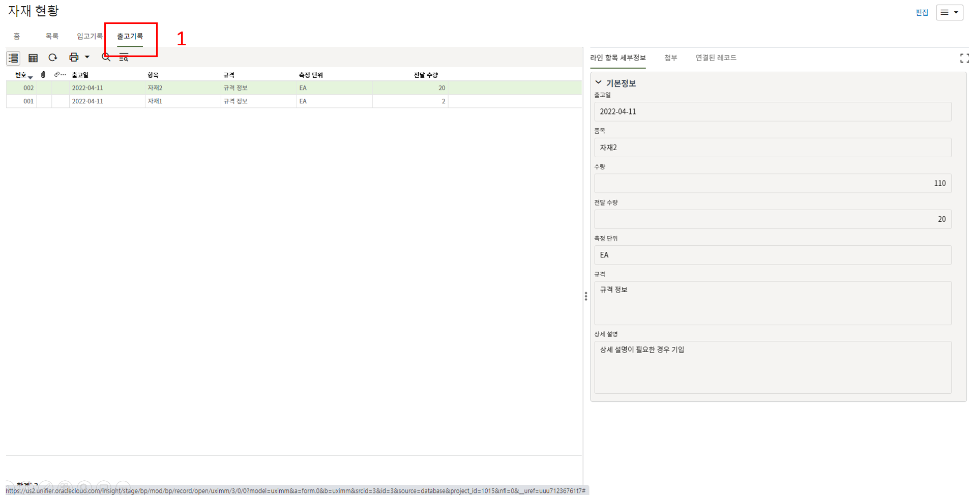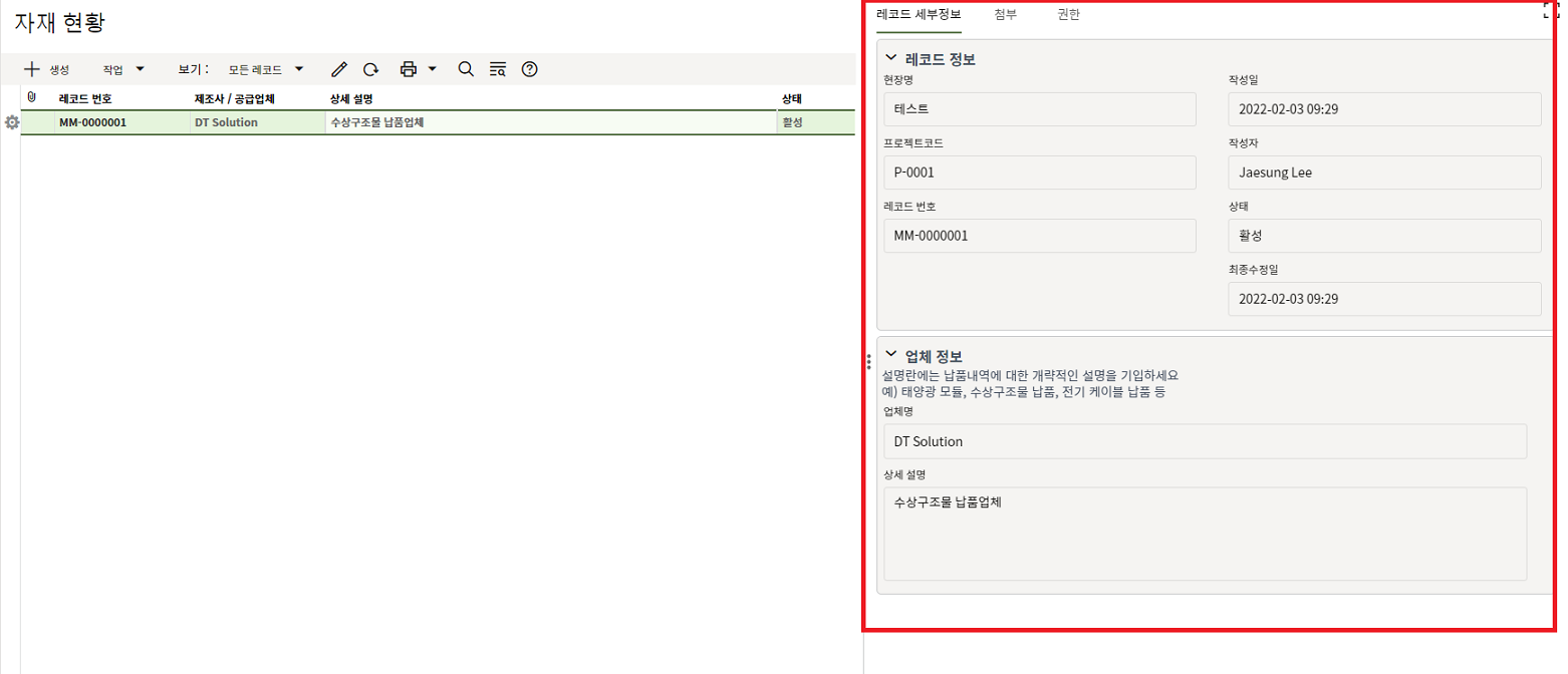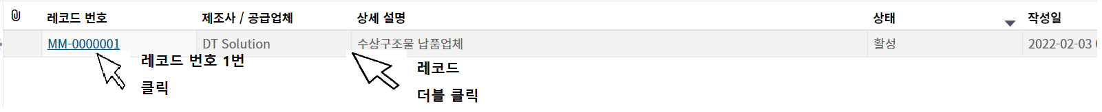 2. 조회를 원하는 레코드의 레코드 번호를 한번 클릭하거나, 레코드를 더블클릭하여 레코드를 조회합니다.