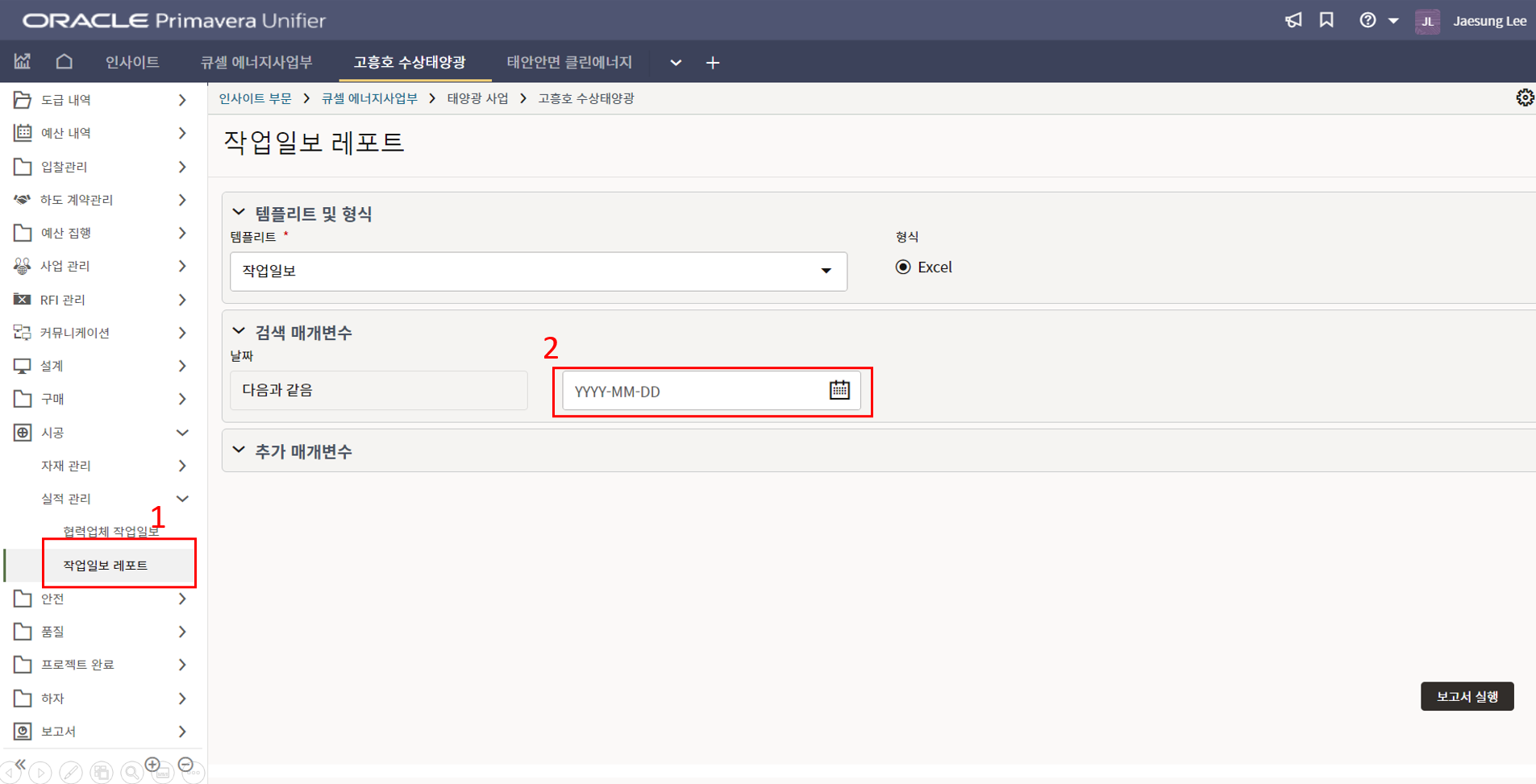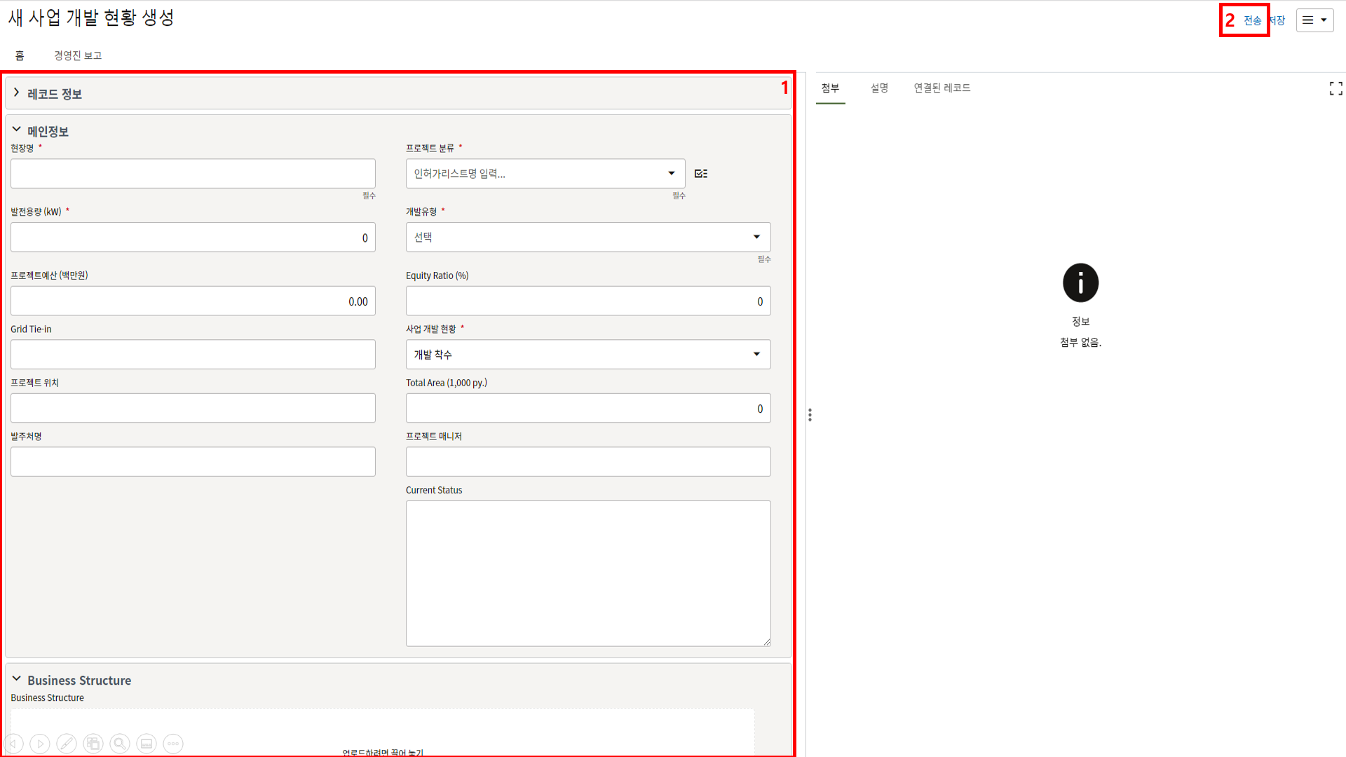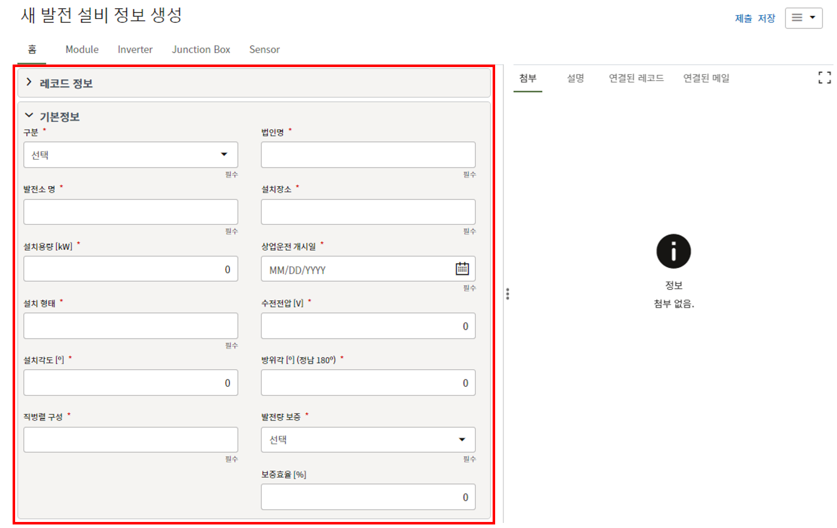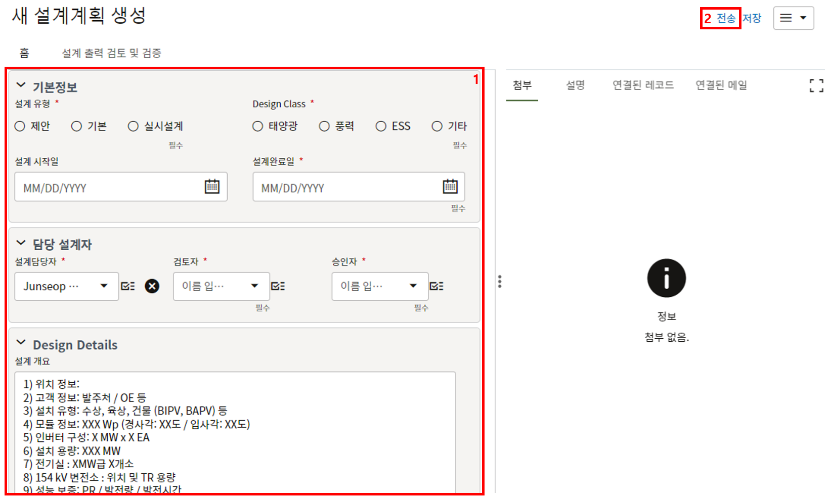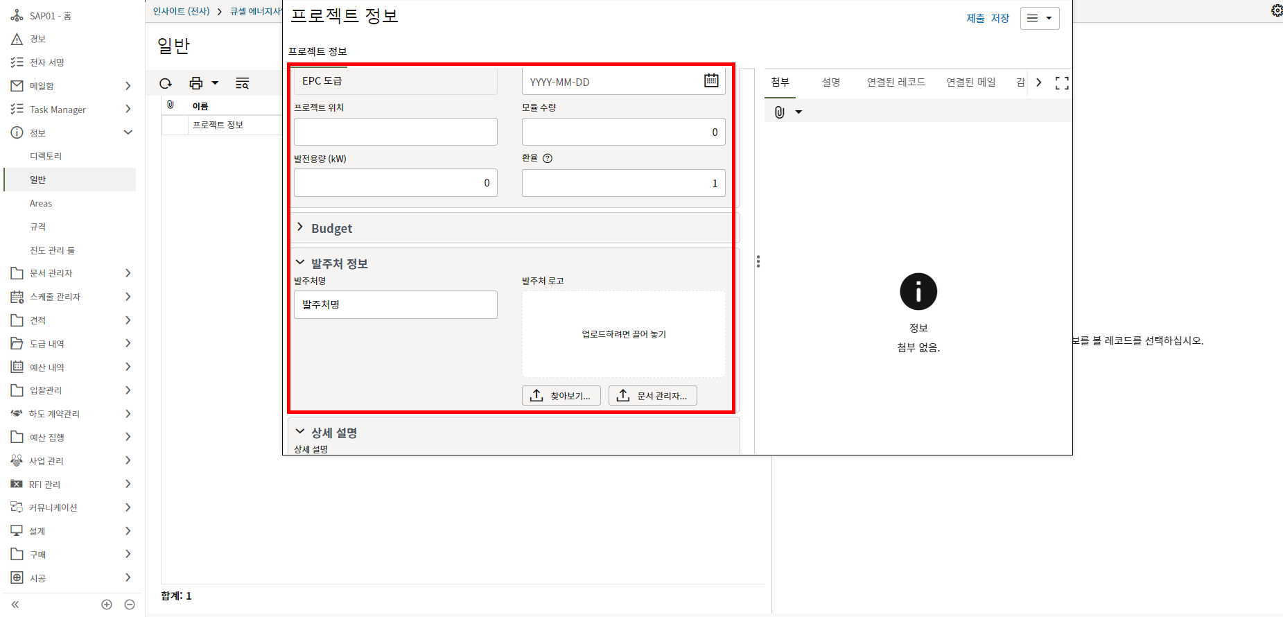 2. 프로젝트 위치, 모듈수량, 발전용량, 환율, 발주처명의 정보를 기입합니다.