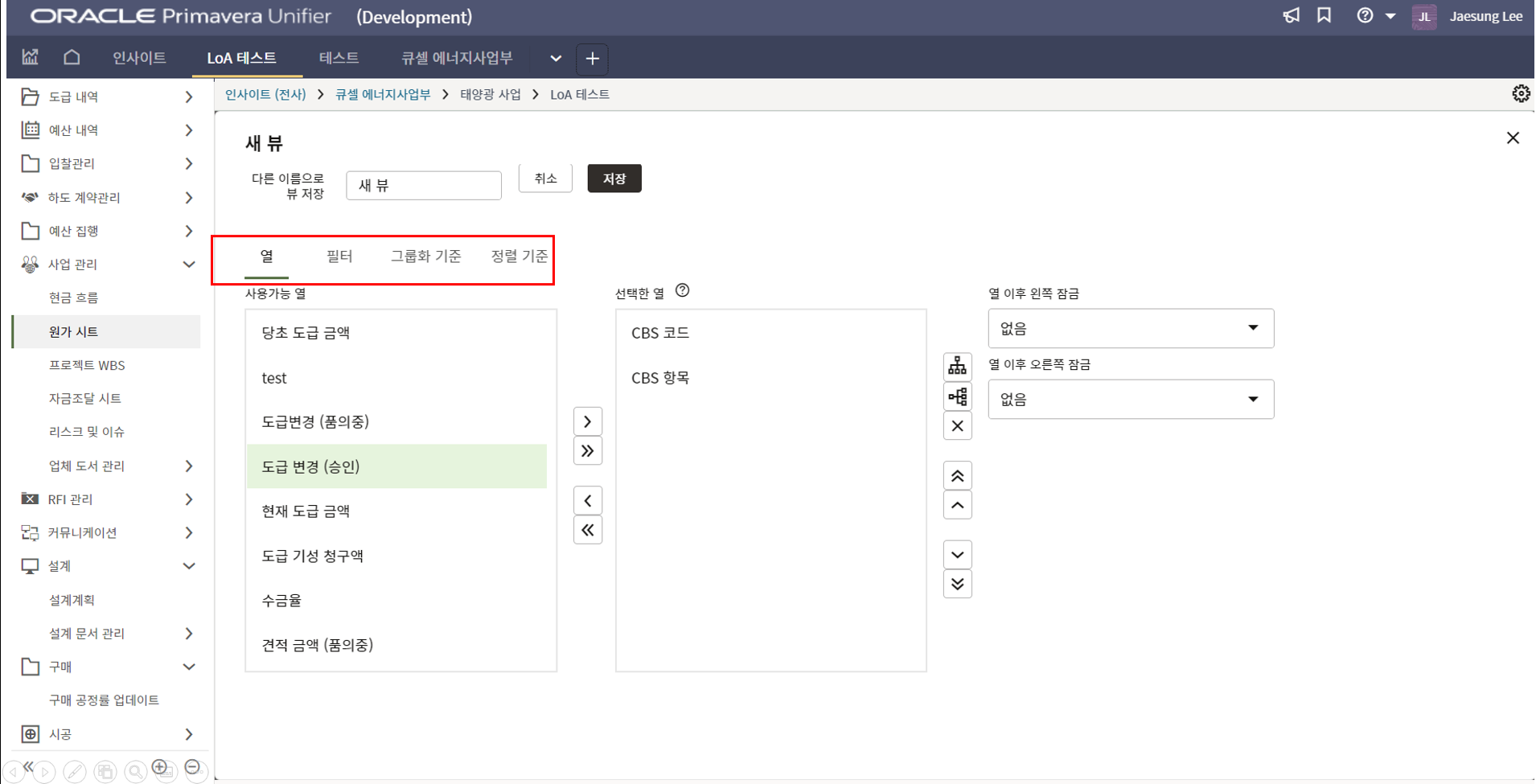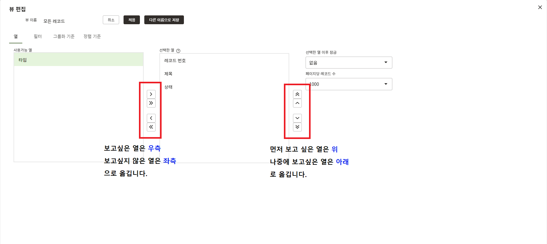 2. "열" 탭에서는 보고싶은 열과 보고 싶지 않은 열을 설정하고 위치를 변경할수 있습니다.