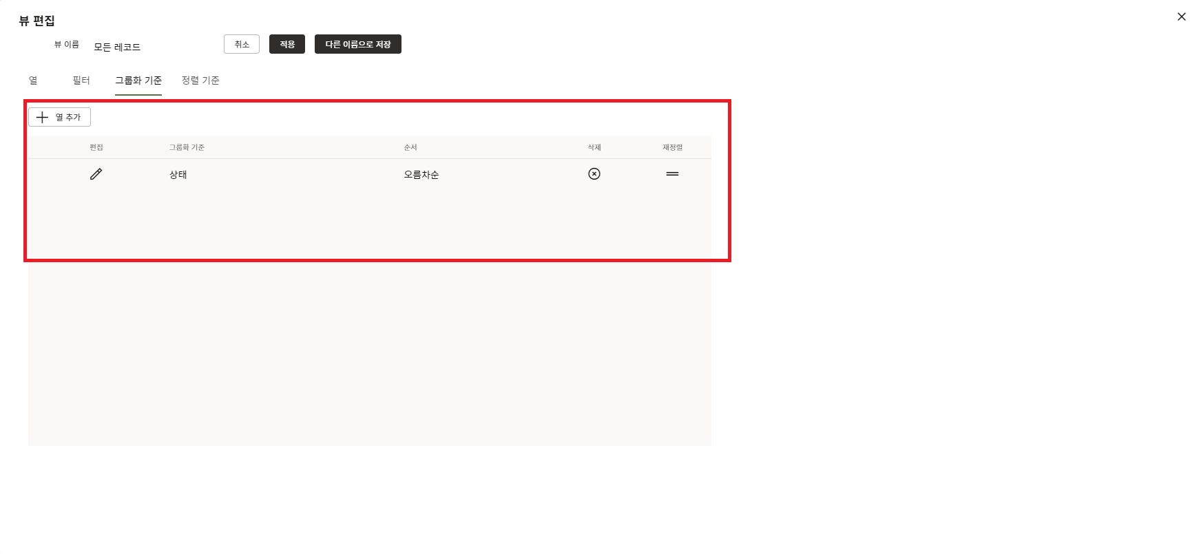 3. "그룹화 기준" 탭에서는 원하는 열을 기준으로 레코드를 그룹화하여 볼 수 있습니다.