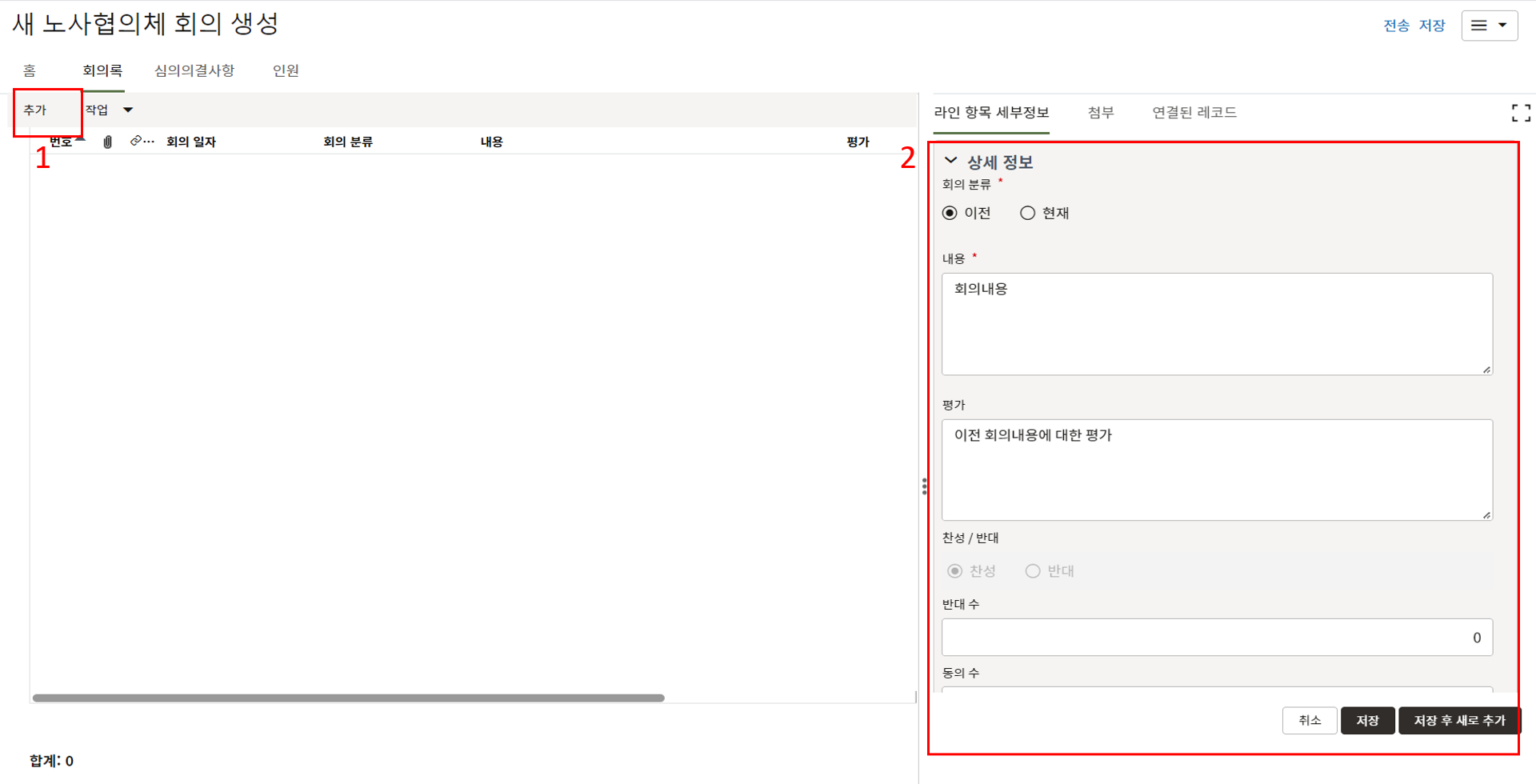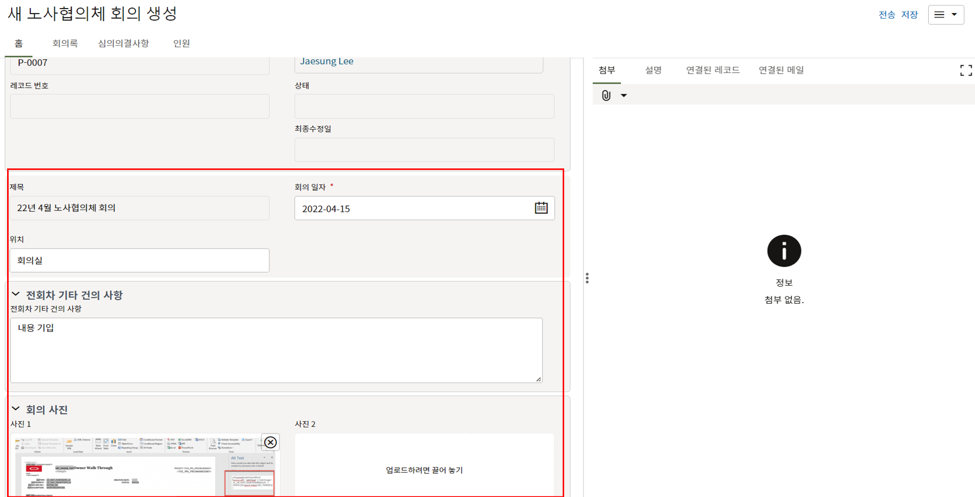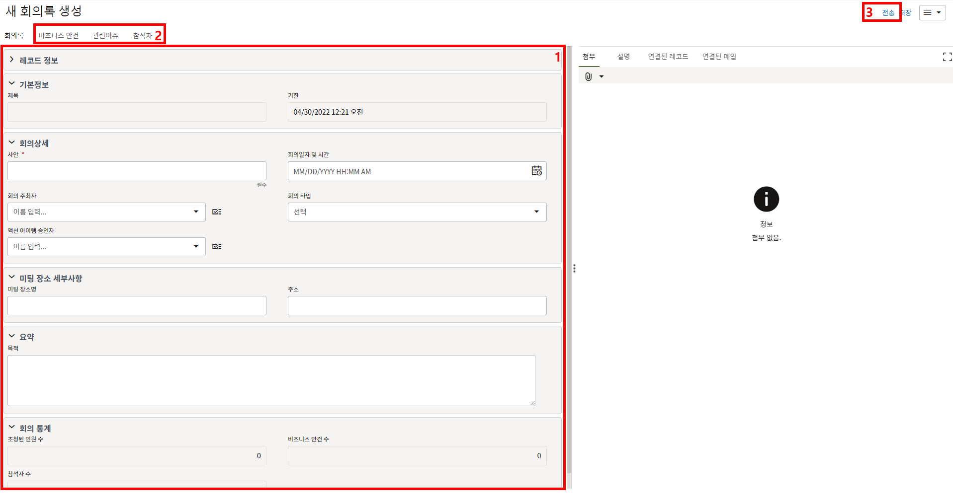 3. 상위양식을 입력 후, "비지니스 안건", "관련이슈", "참석자" 탭에 회의정보 및 결과를 입력 후