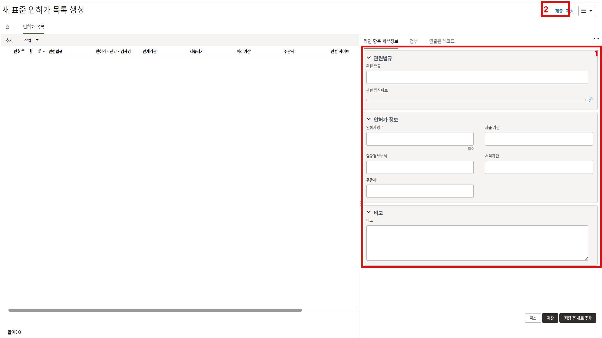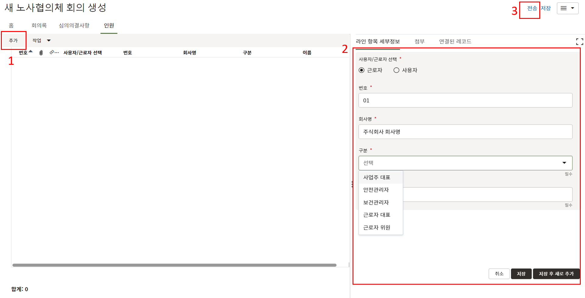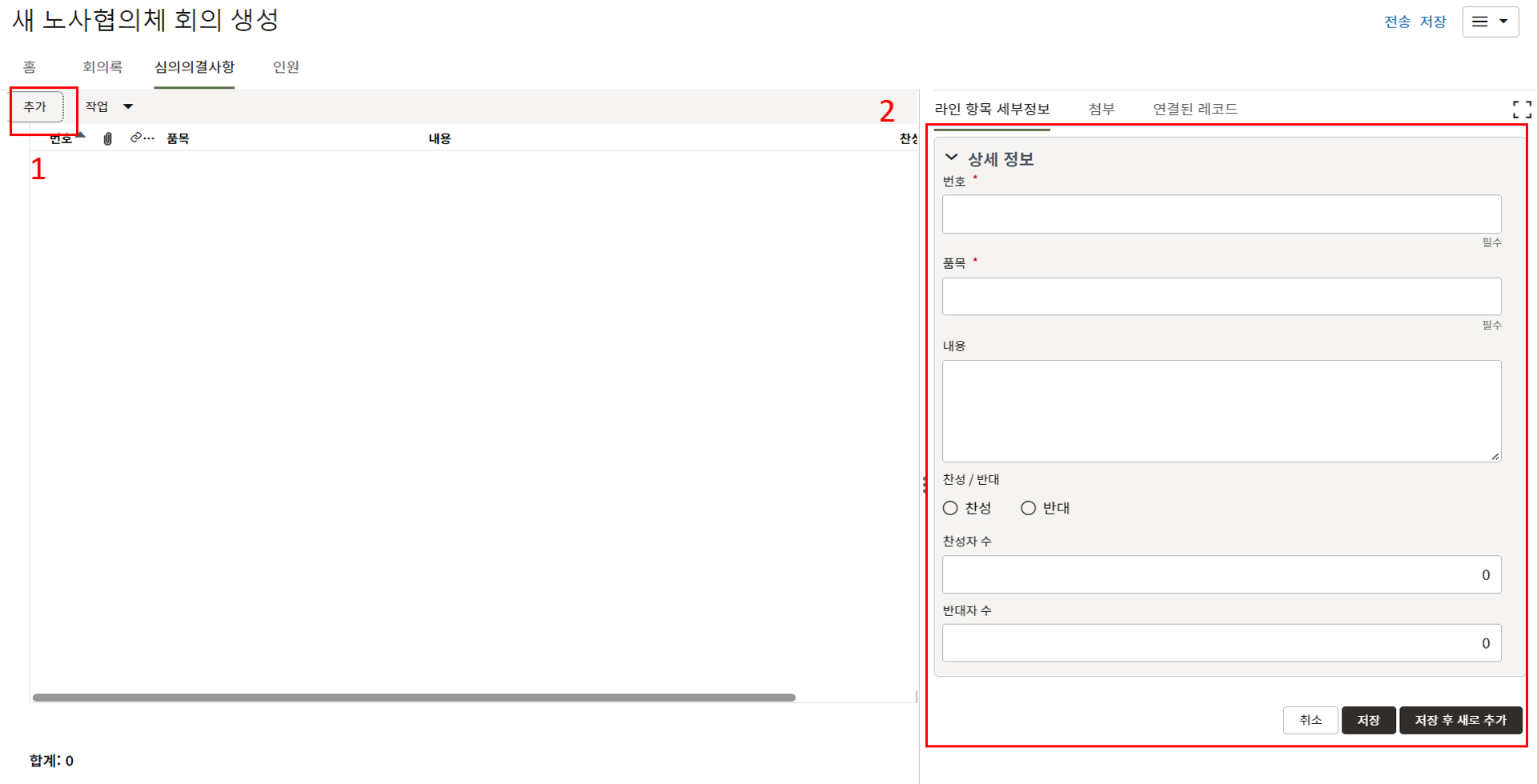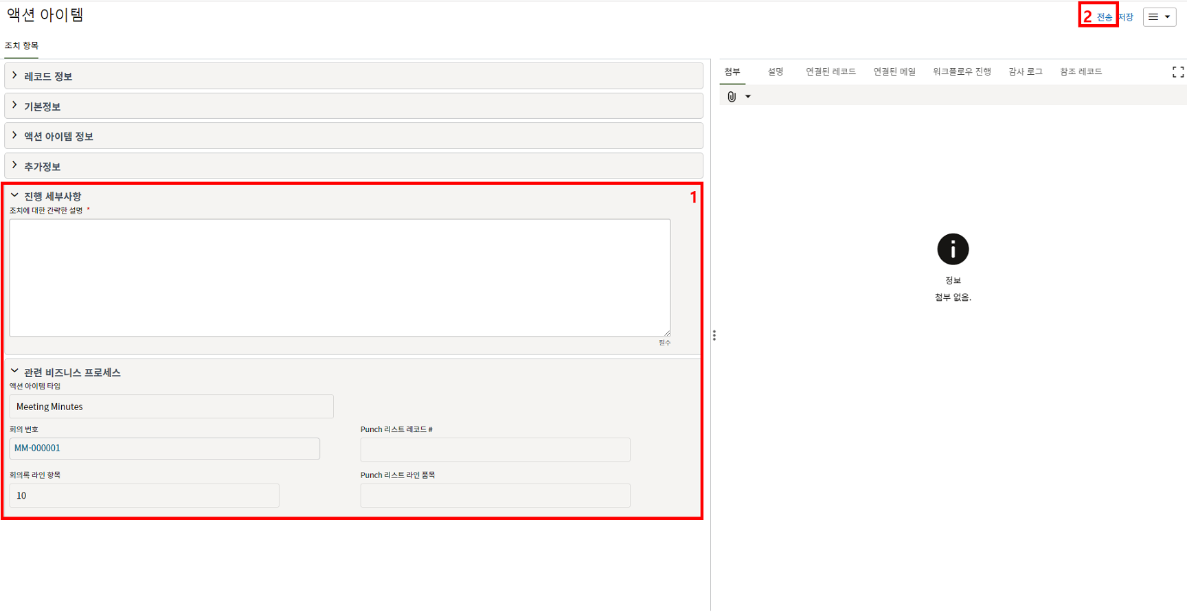 3. 상위양식을 입력 후, "비지니스 안건", "관련이슈", "참석자" 탭에 회의정보 및 결과를 입력 후