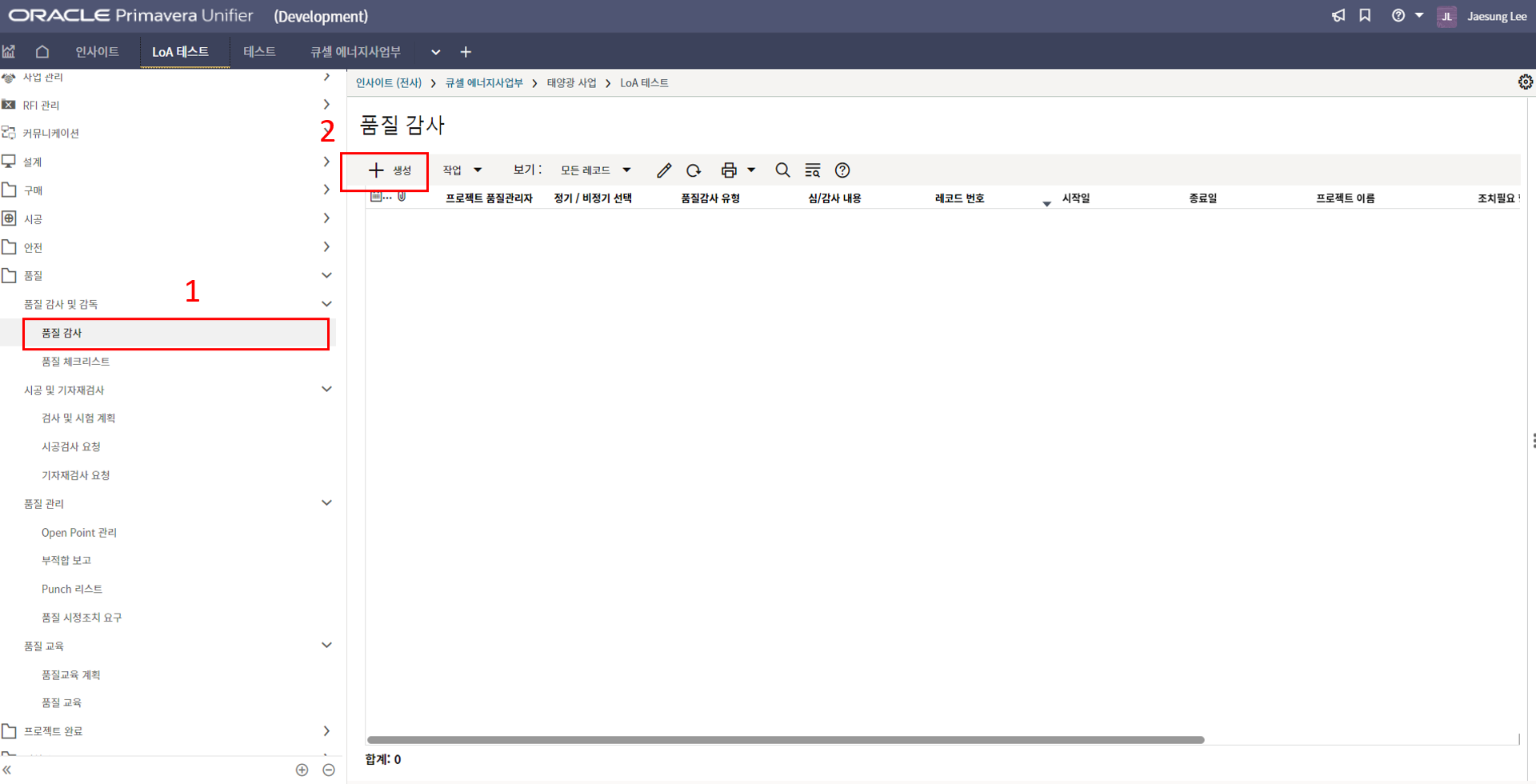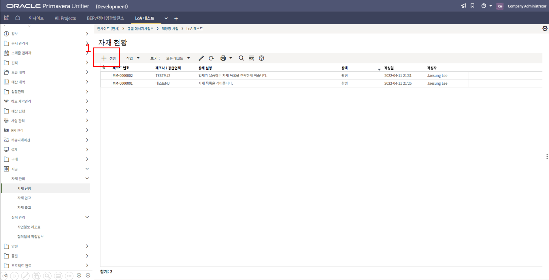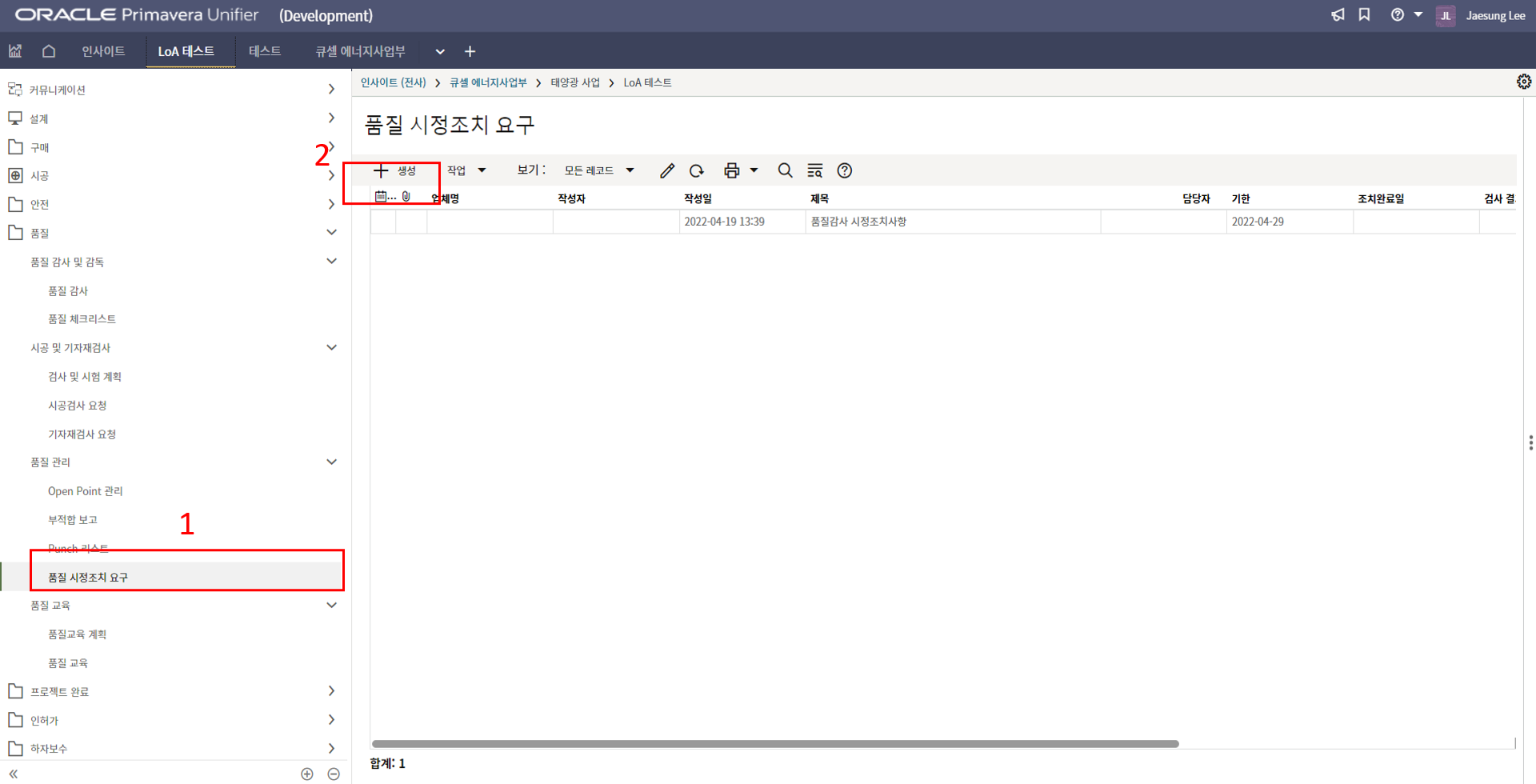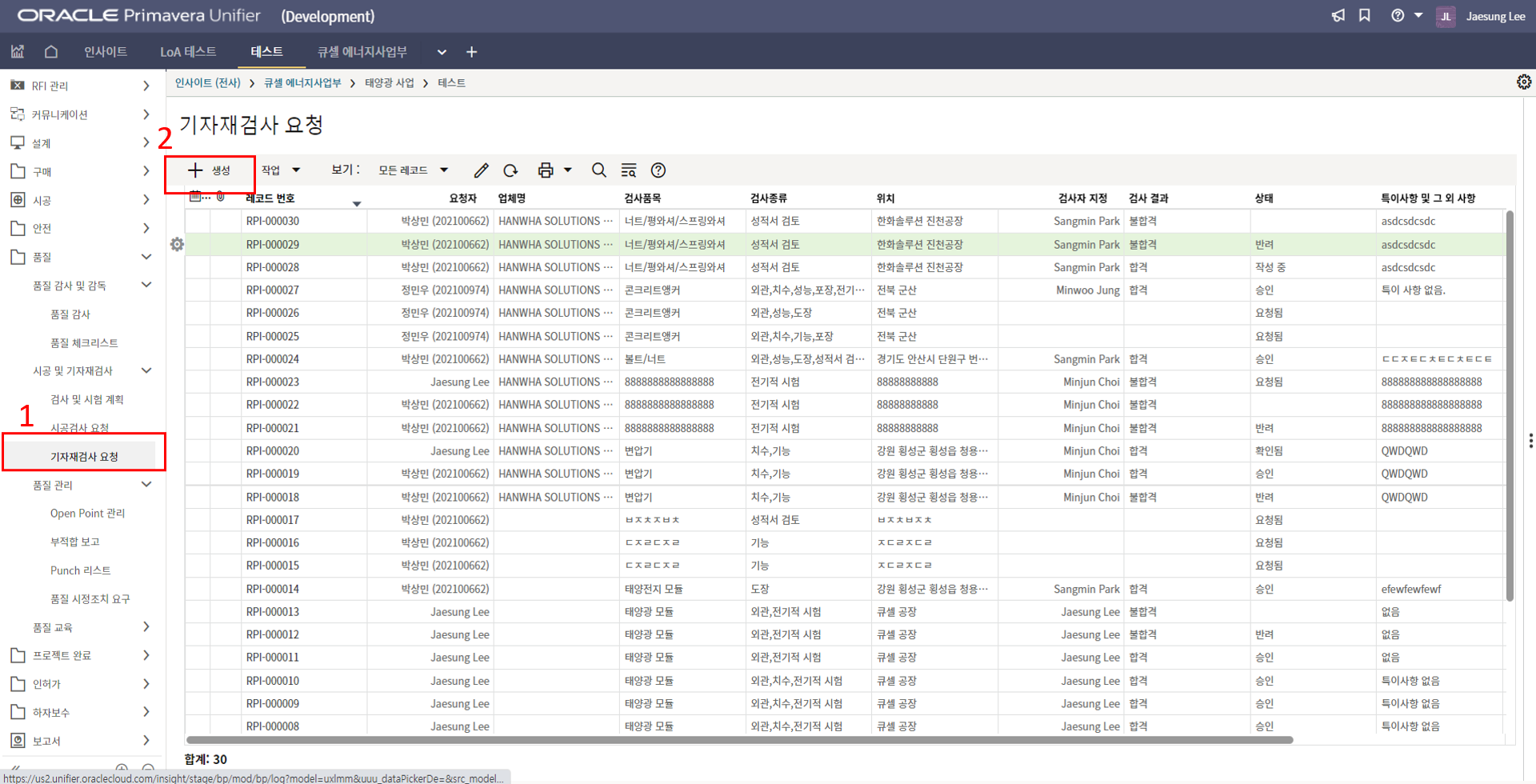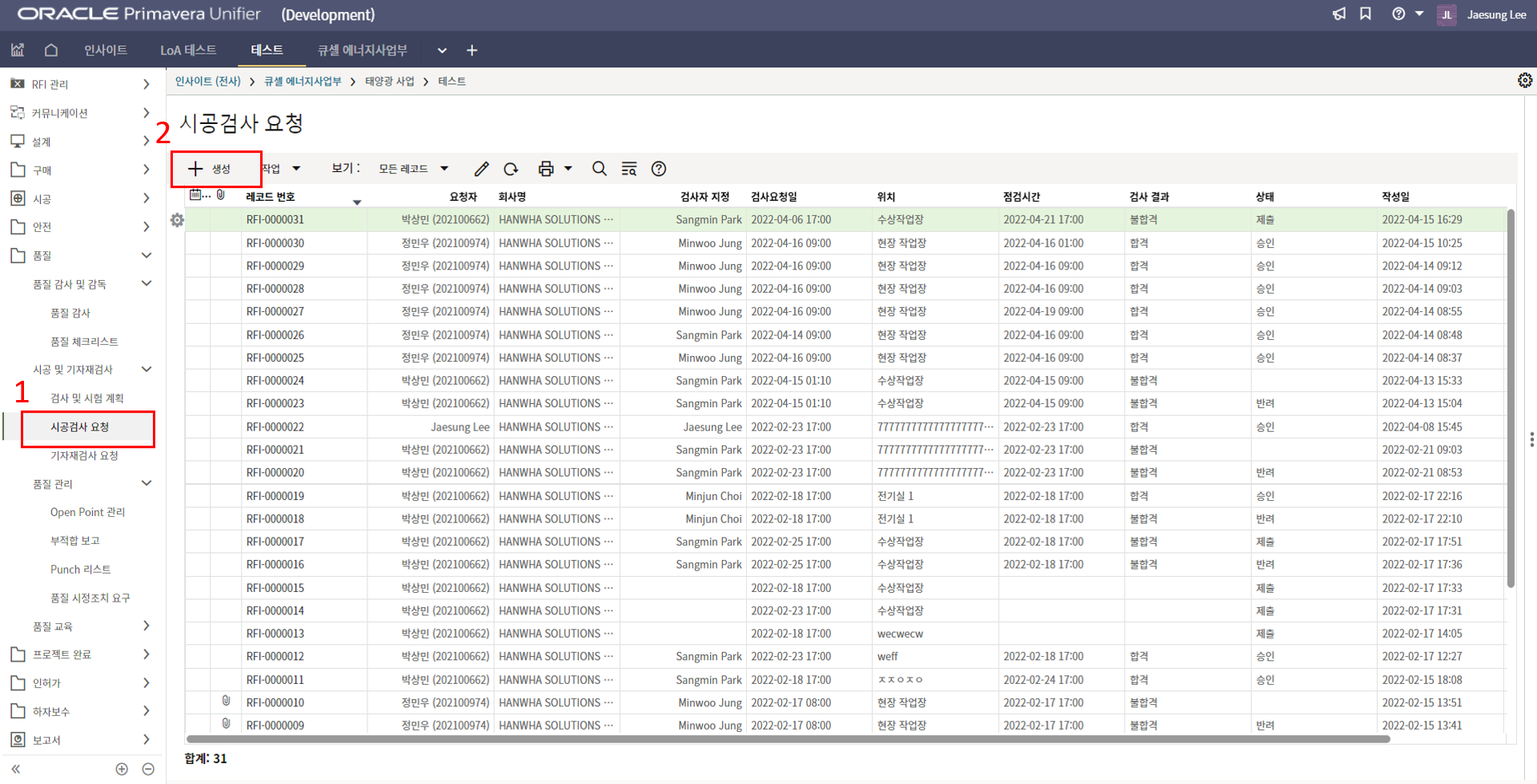 2. 시공검사 메뉴에서 생성버튼을 클릭합니다.