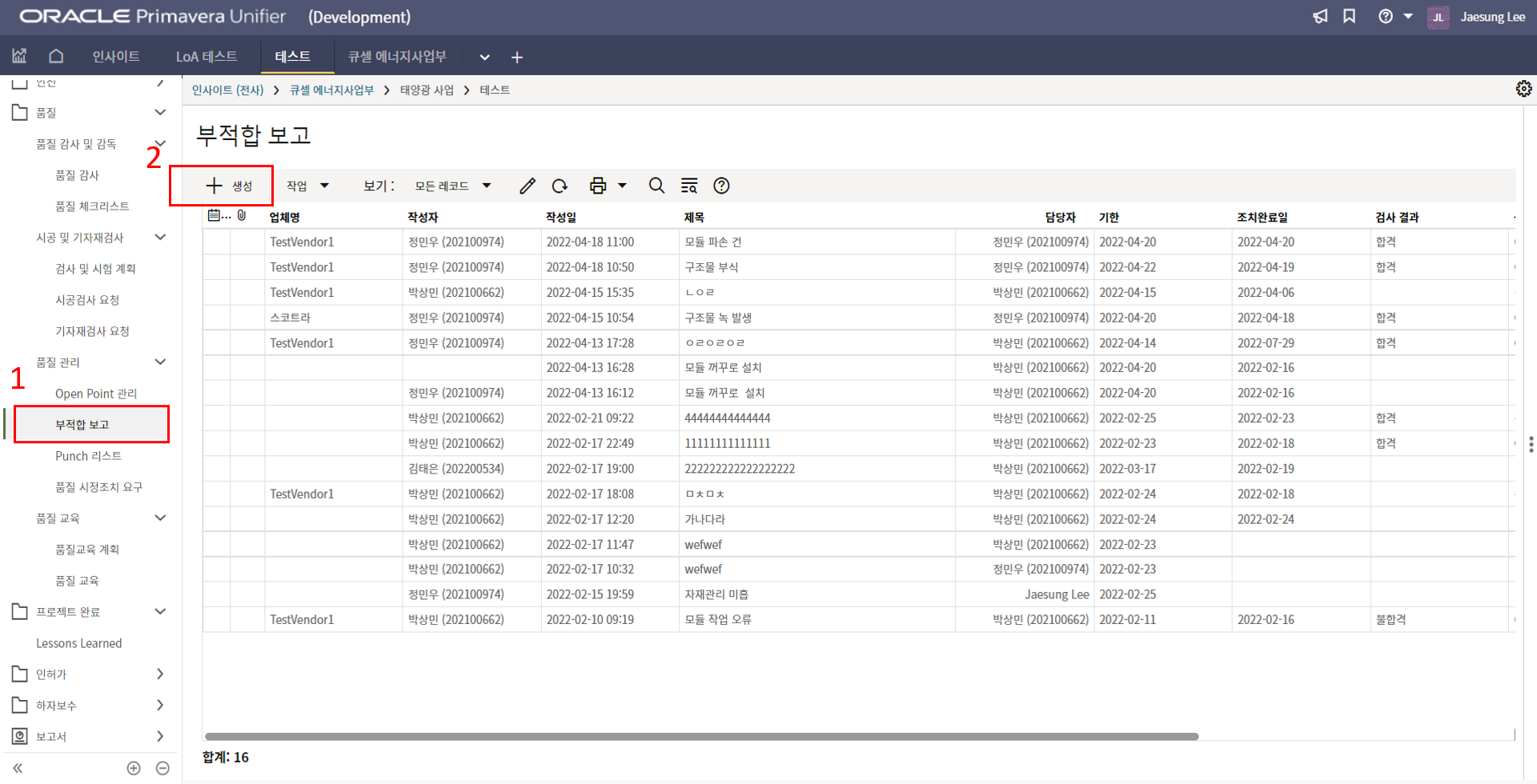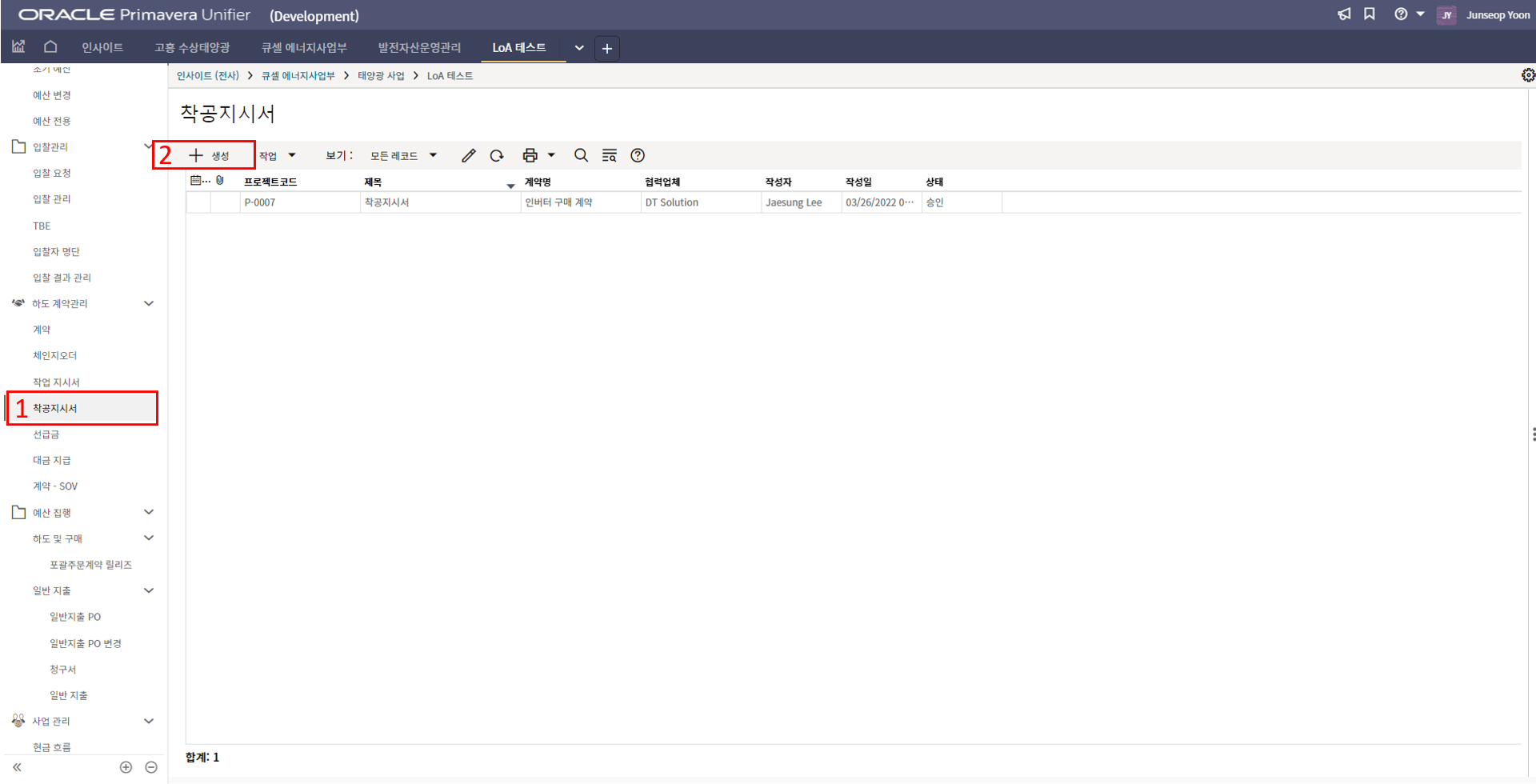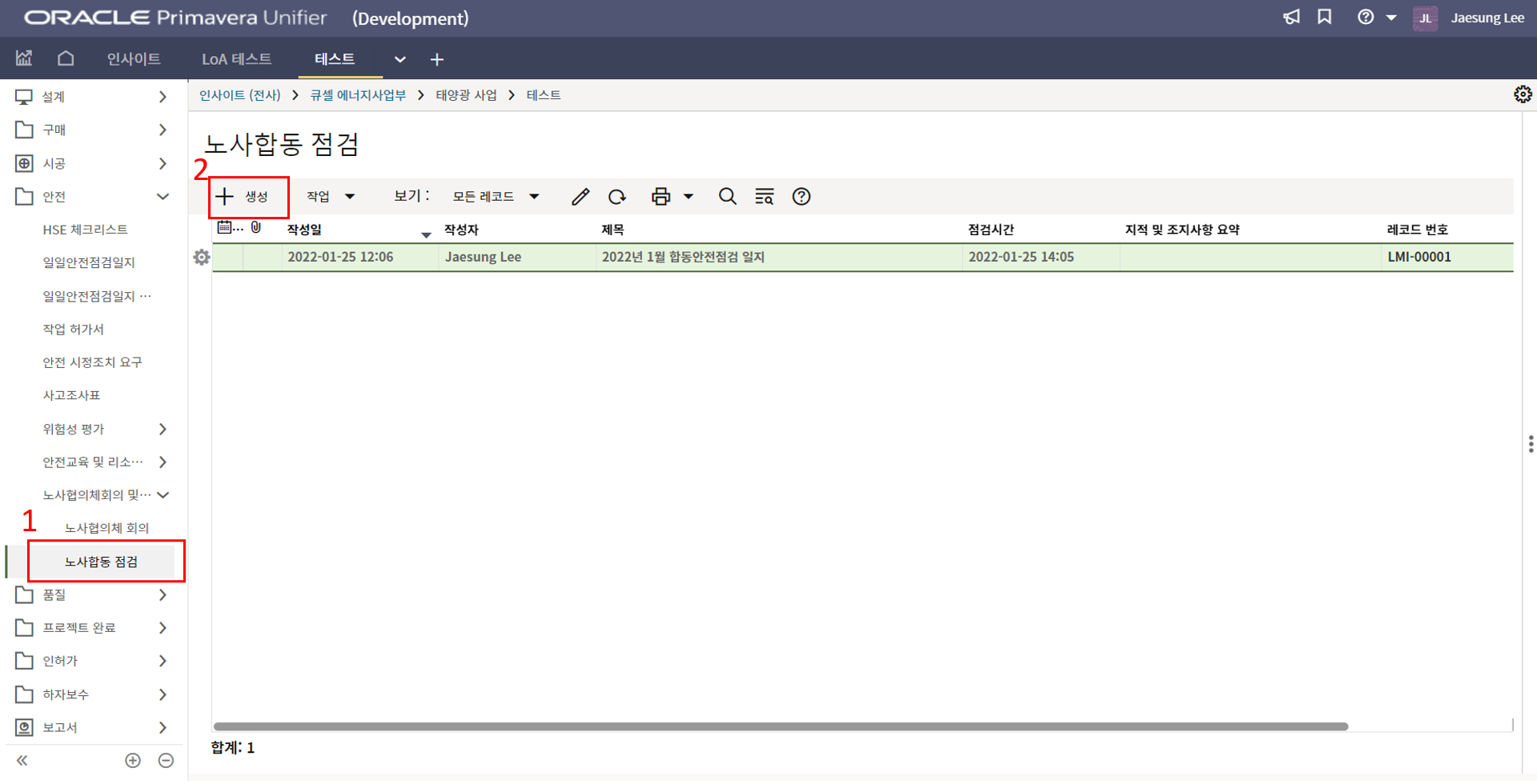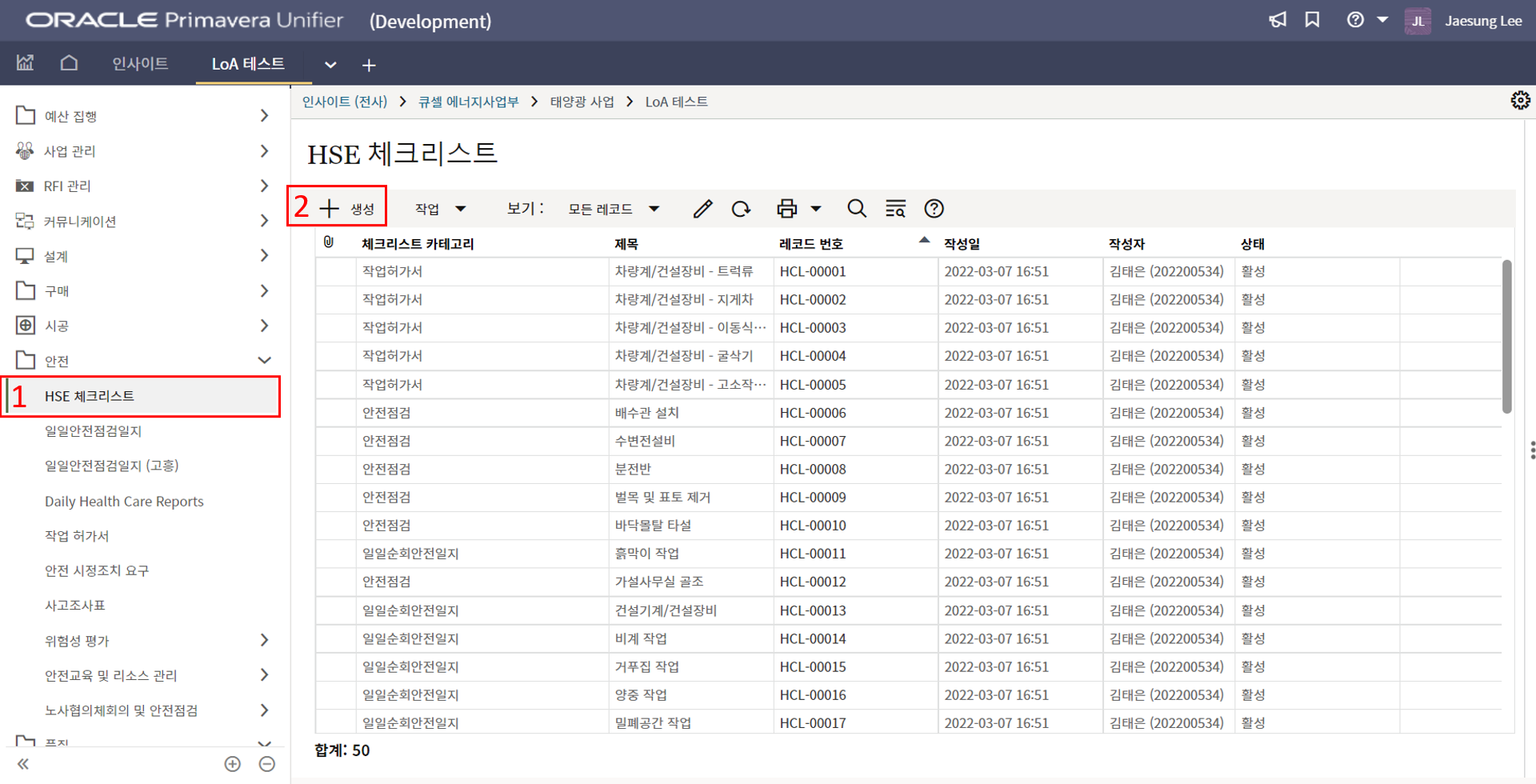 2. 시공검사 메뉴에서 생성버튼을 클릭합니다.