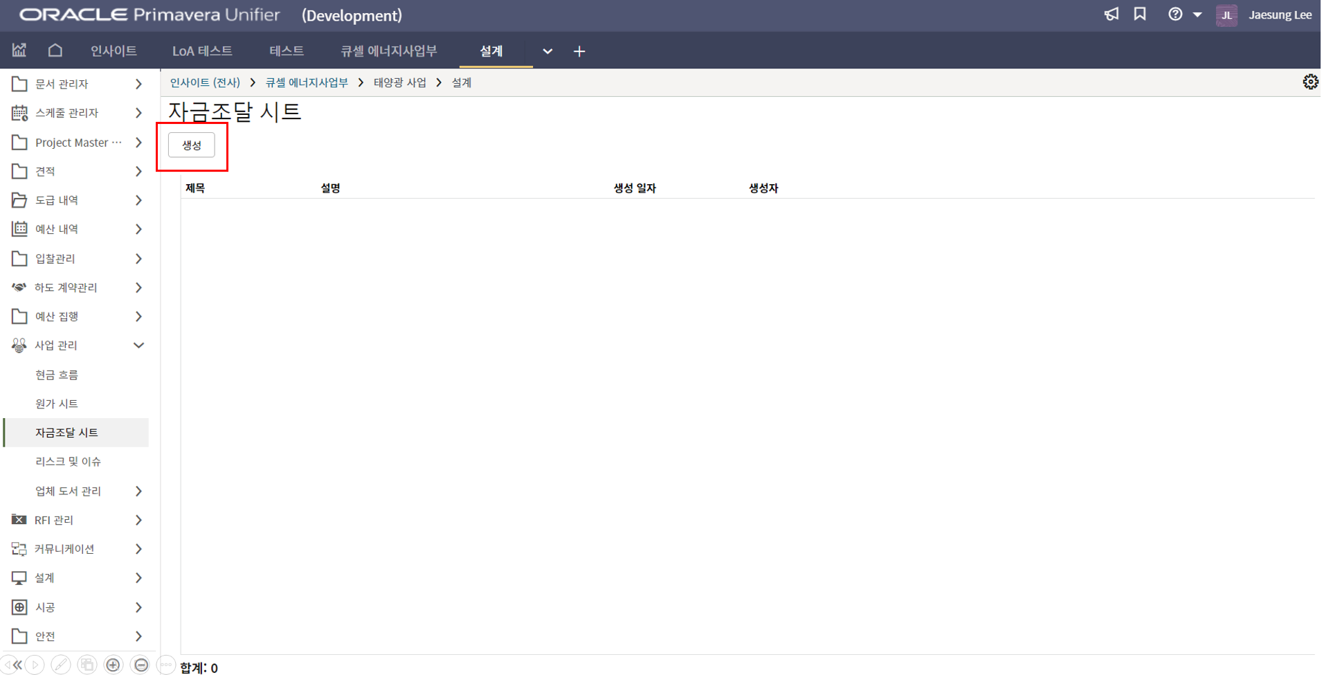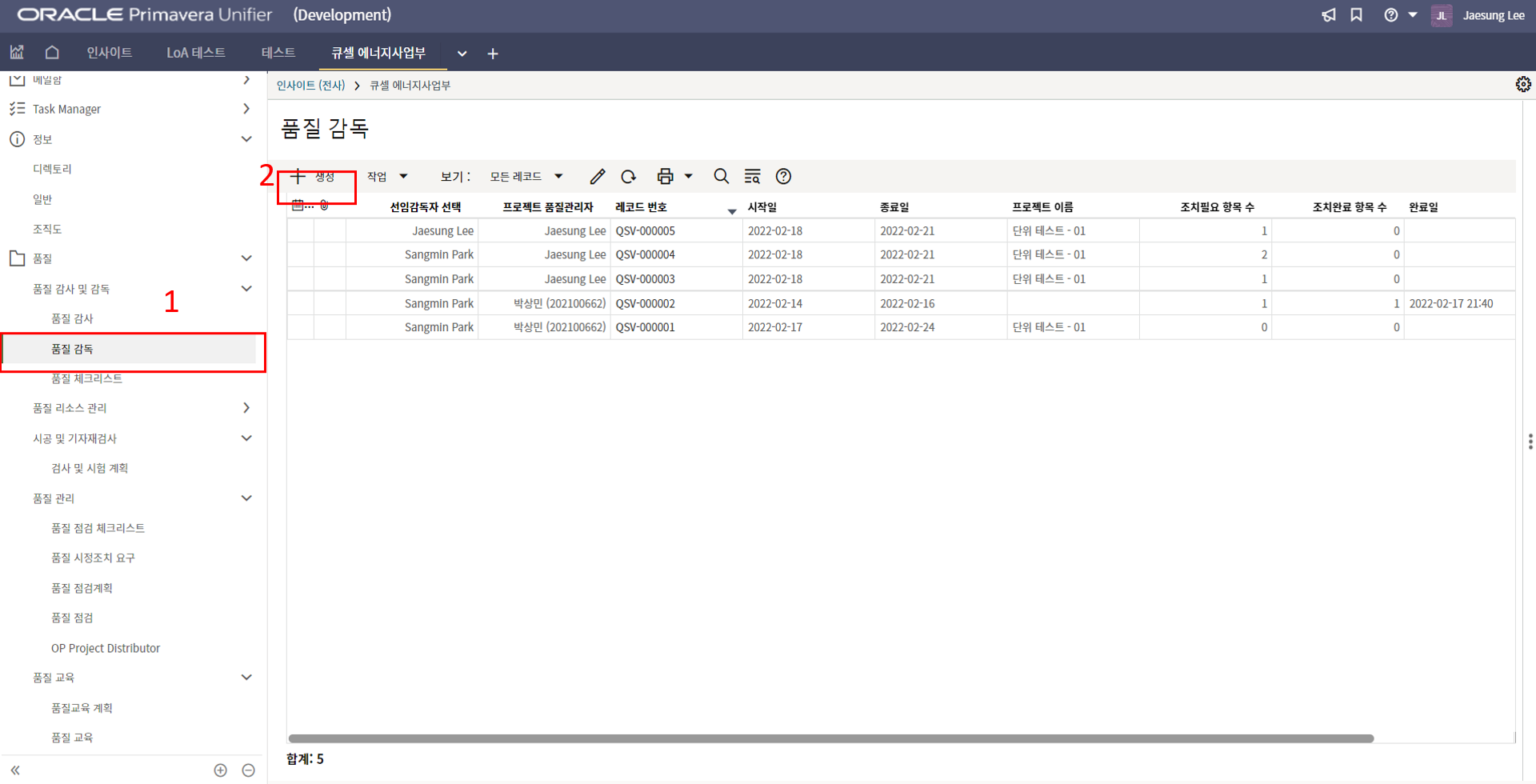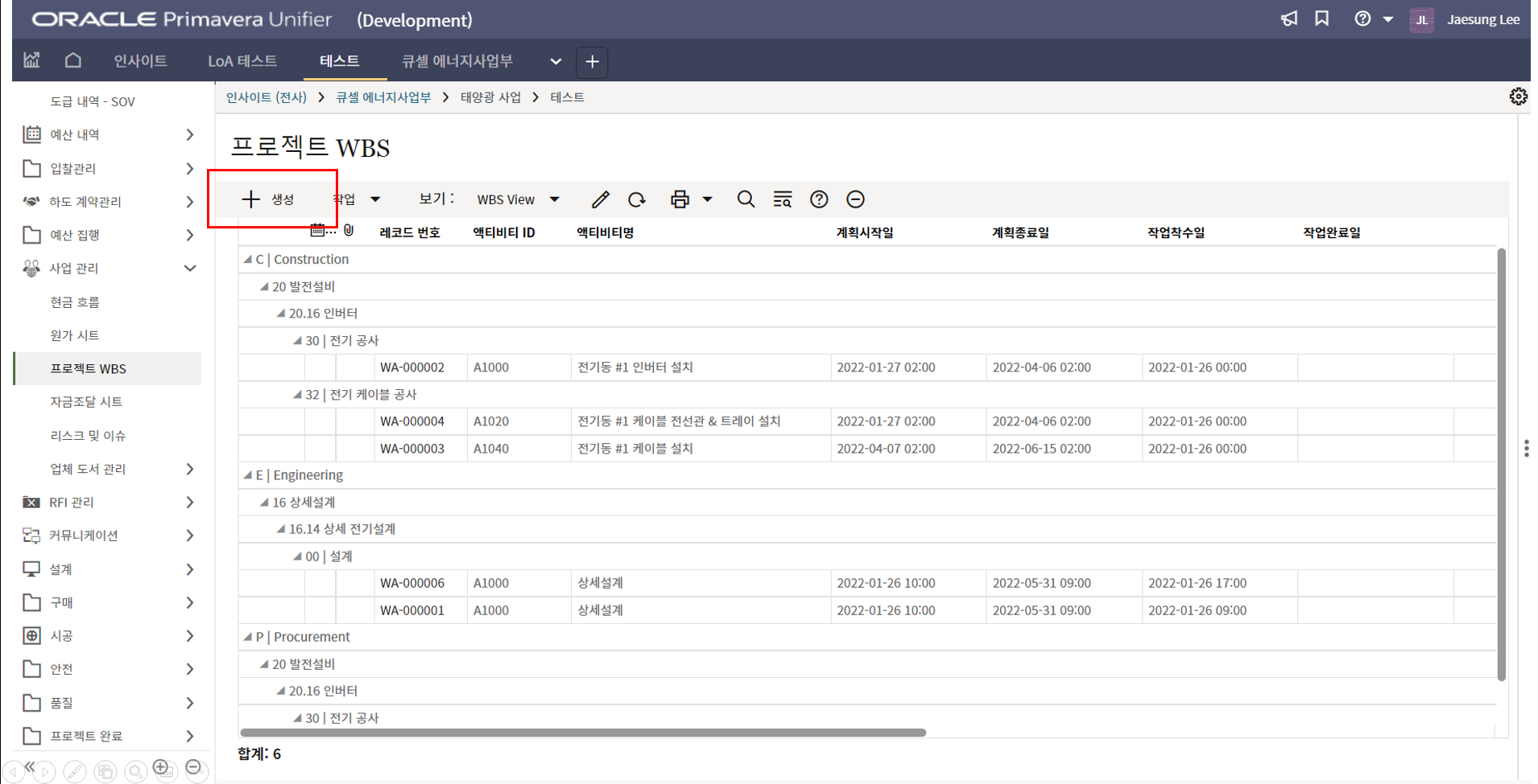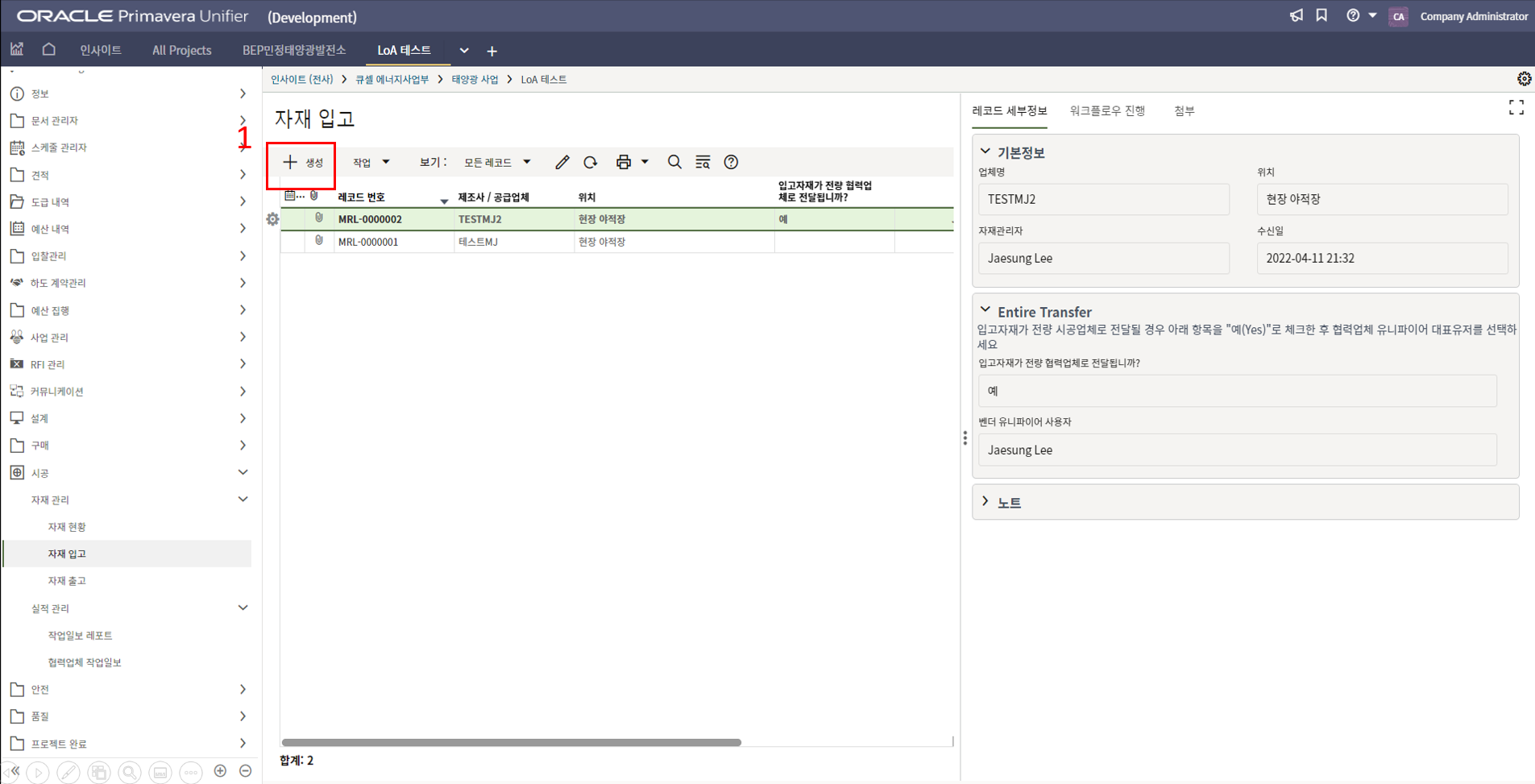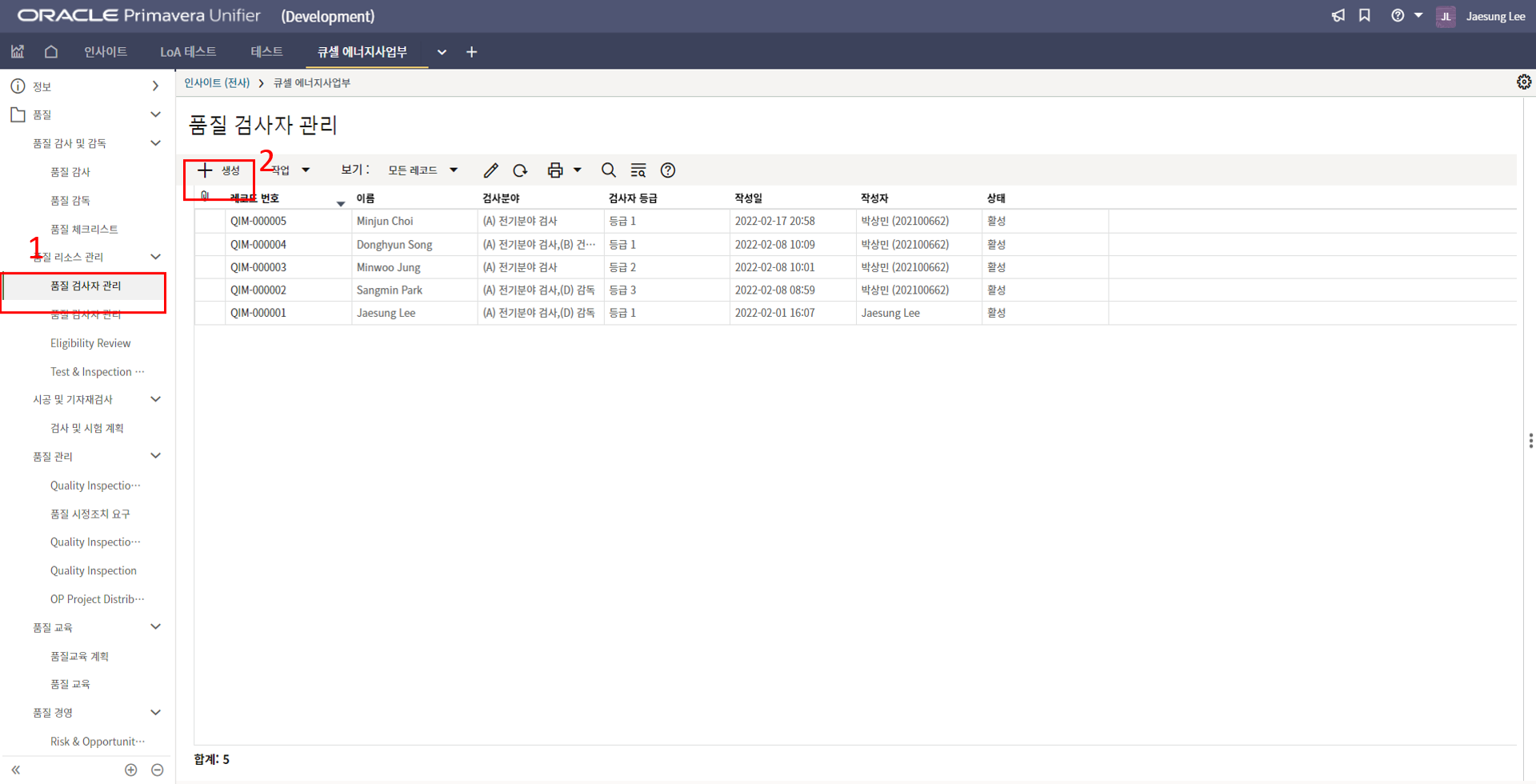 2. 시공검사 메뉴에서 생성버튼을 클릭합니다.