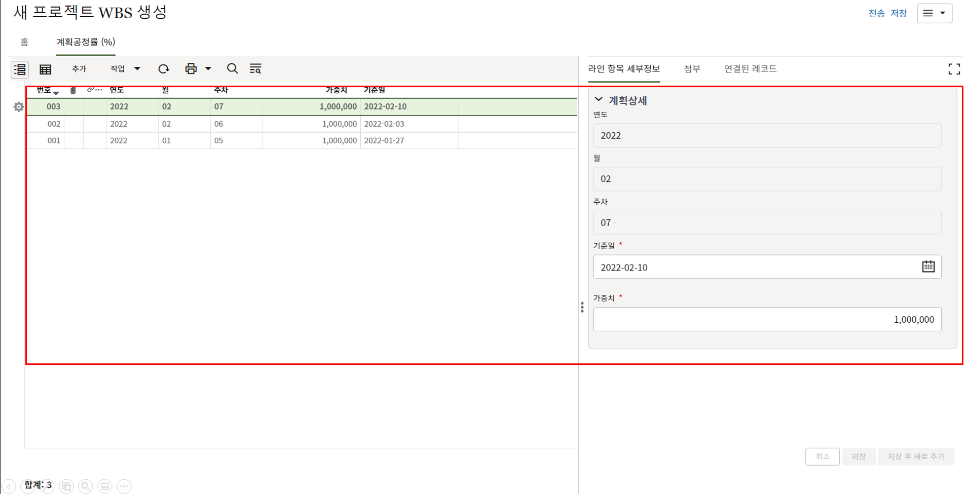 예시와 같이 세개의 레코드가 같은 워크프로우 상태라면, 내용 확인 없이 한번에 다음 단계로 넘길 수 있습니다.