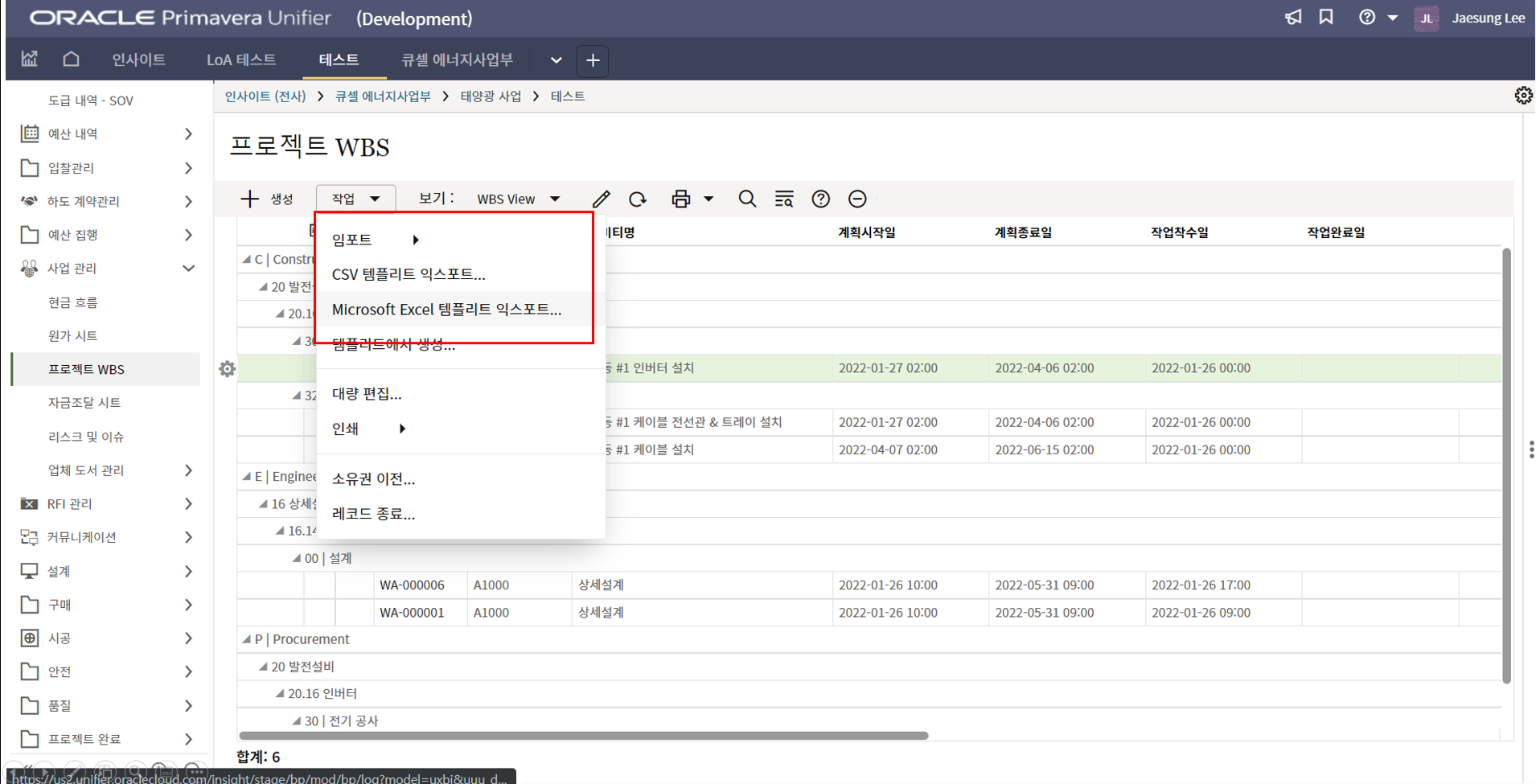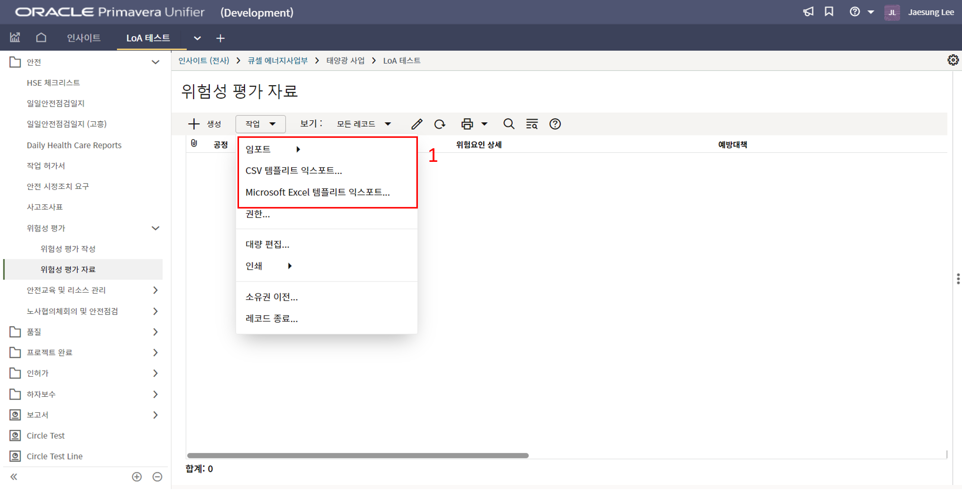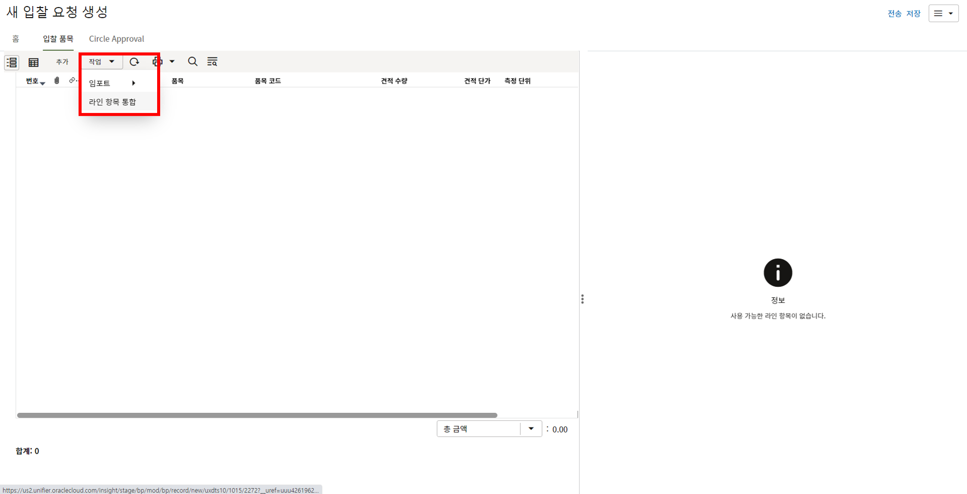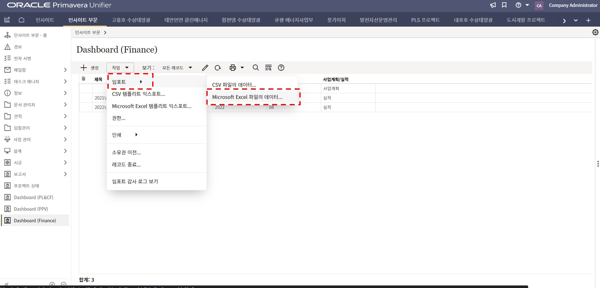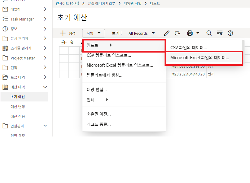 4. 입력이 완료되면, 다시 로그화면의 '작업'에서 임포트 버튼을 누릅니다.
