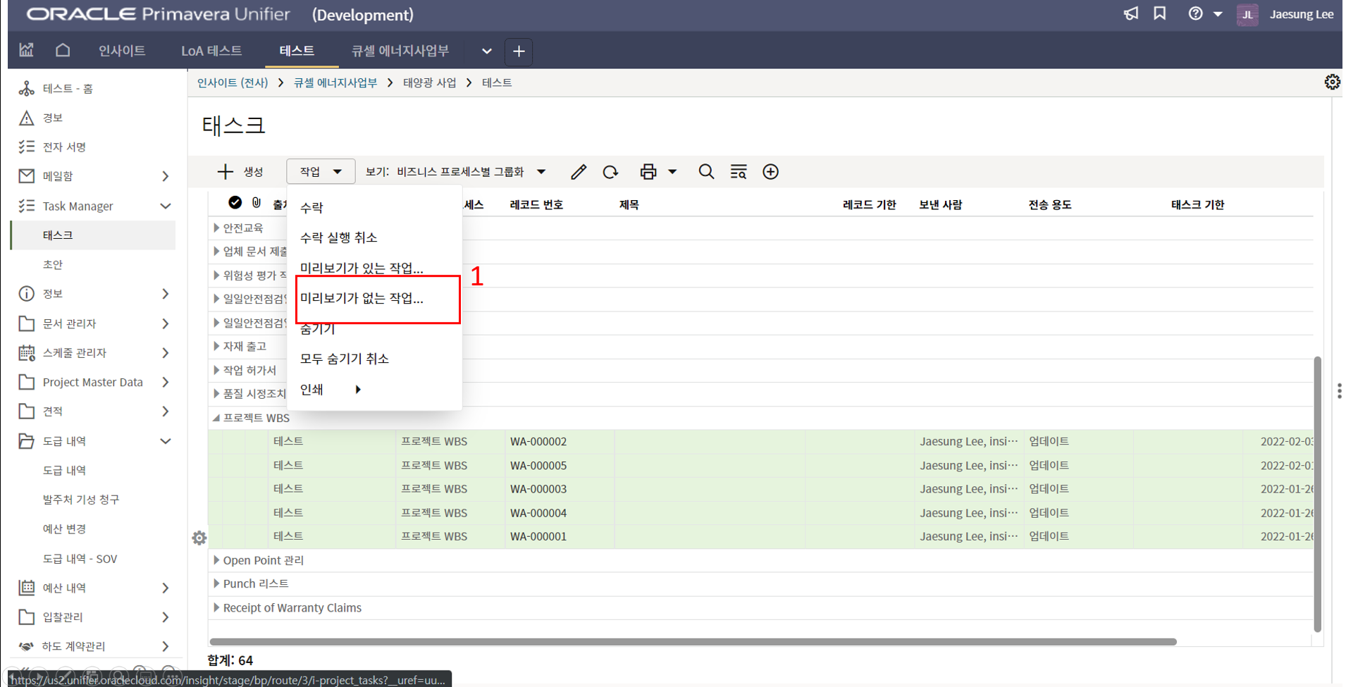 프로젝트 > Task Manager > 태스크로 이동합니다.