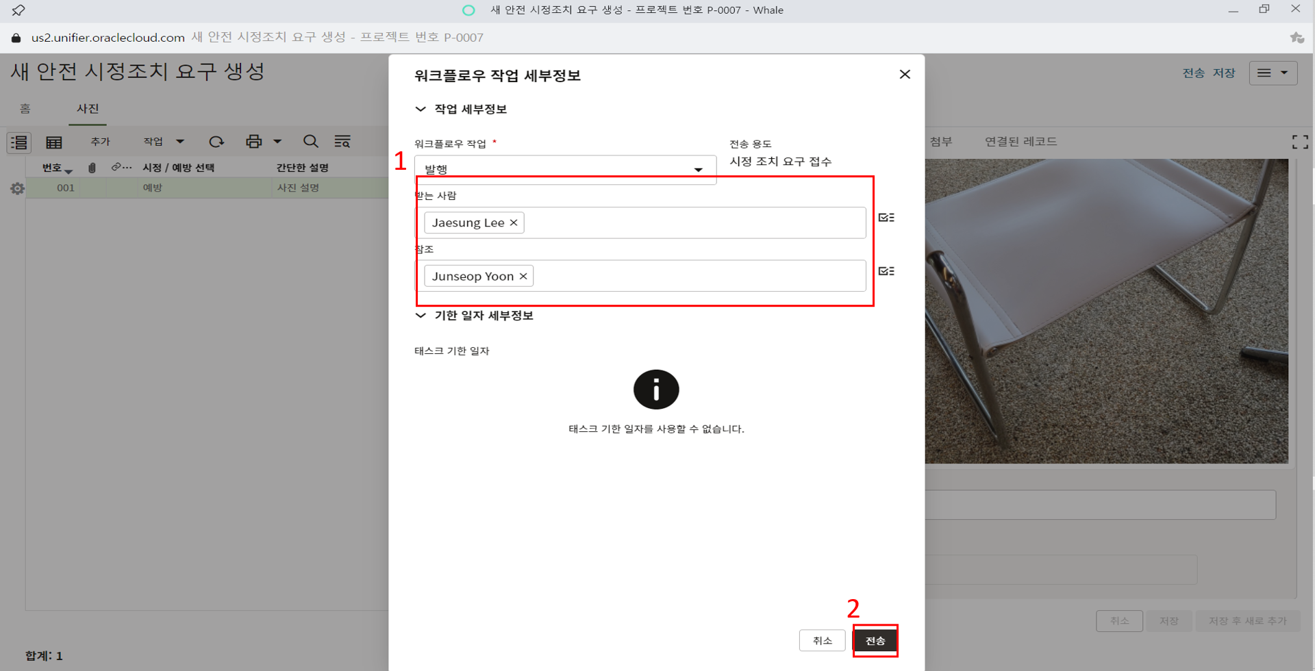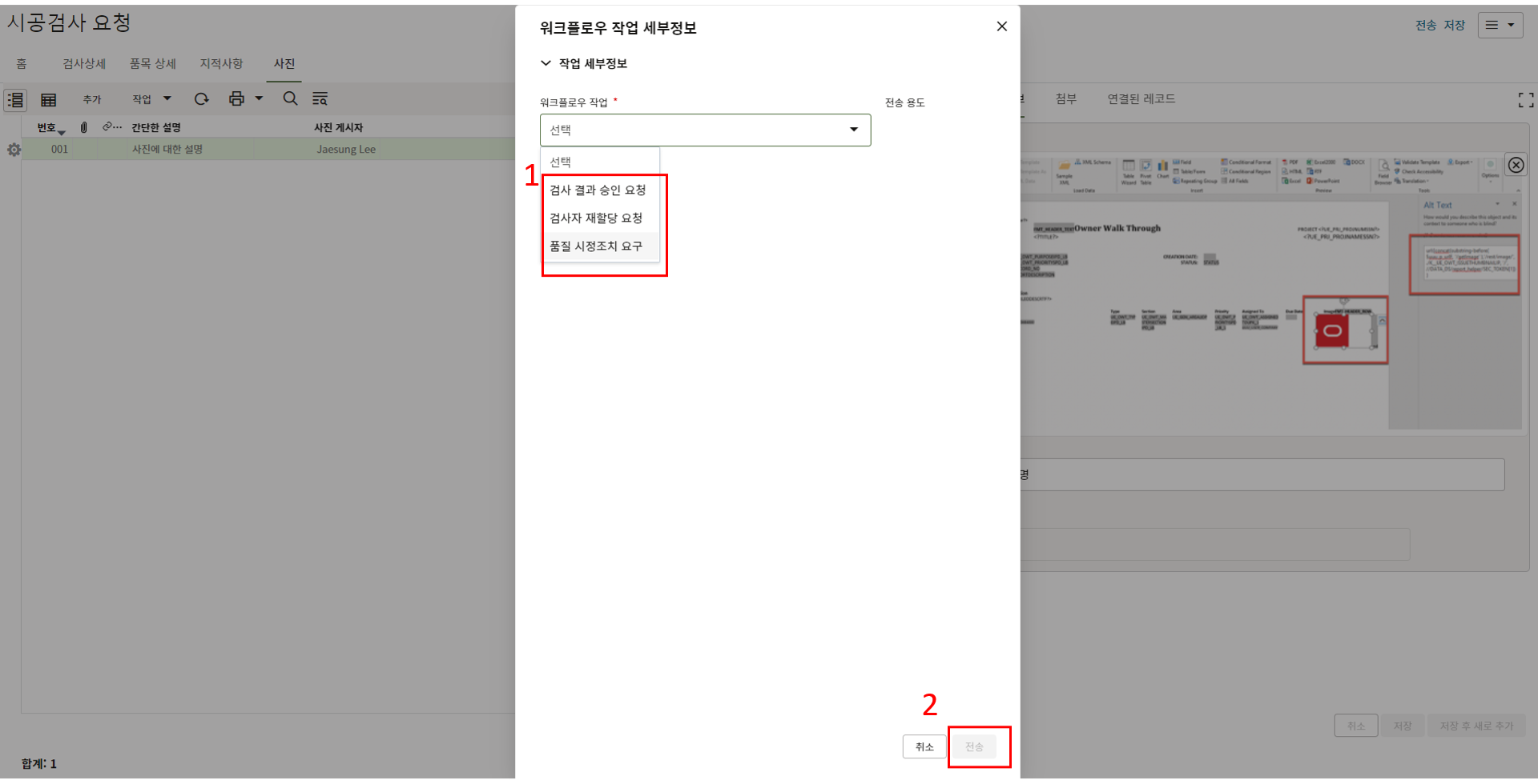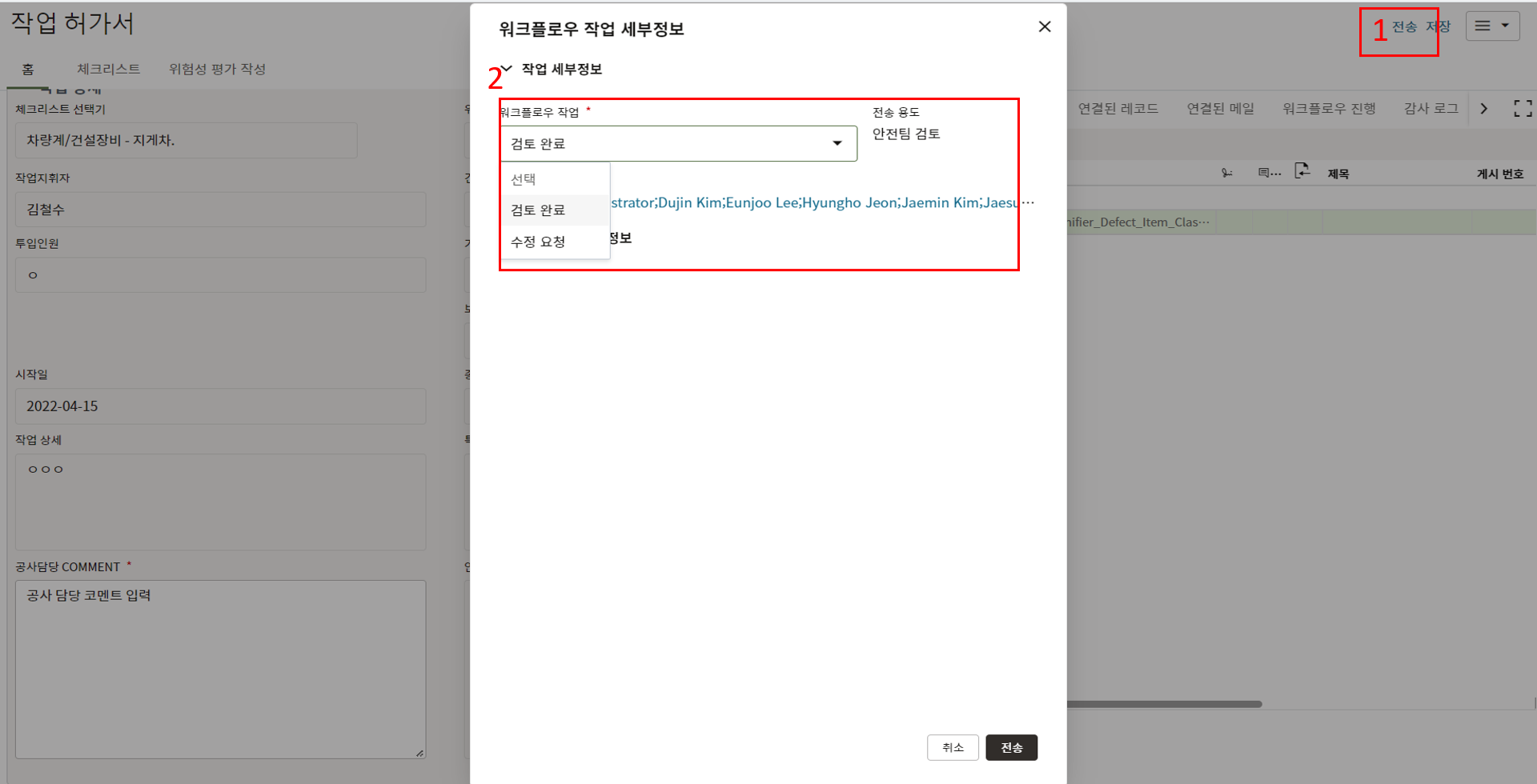 2.현장소장에게 할당된 태스크를 클릭하여 내용을 검토 후 전송버튼을 클릭합니다.