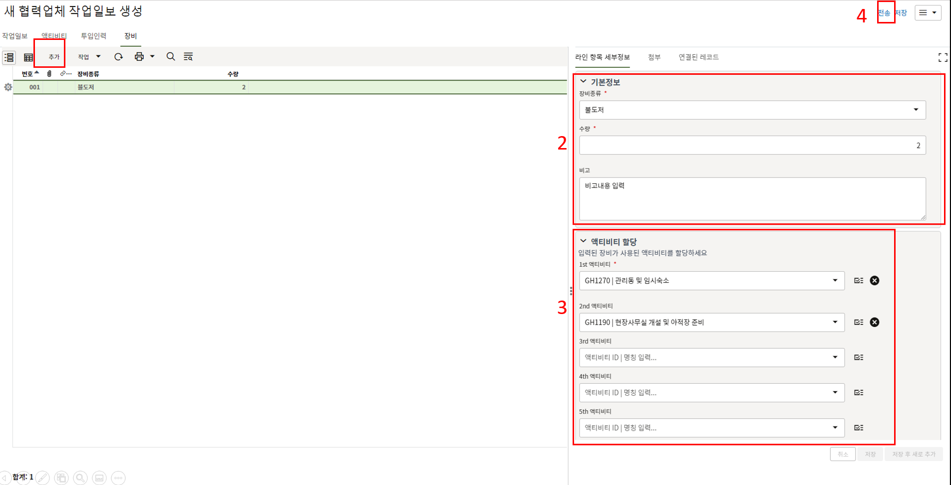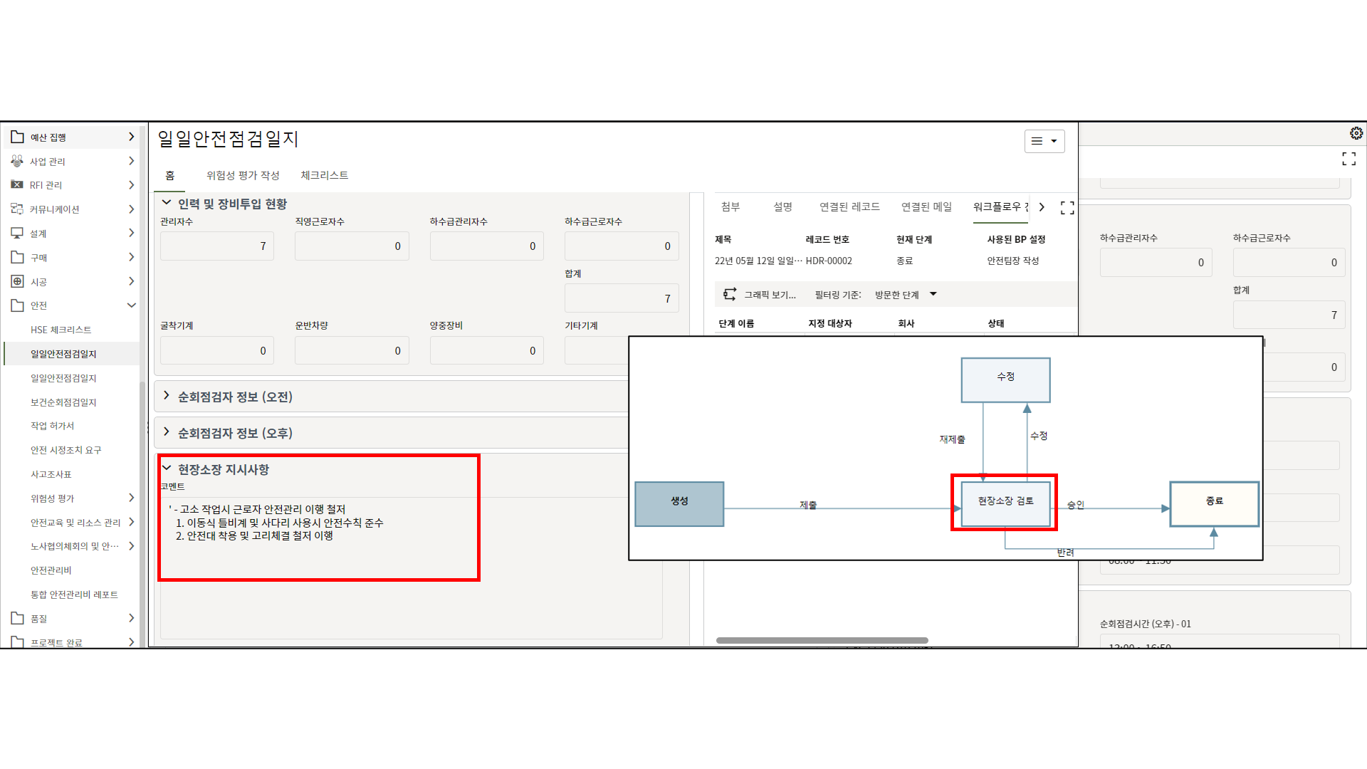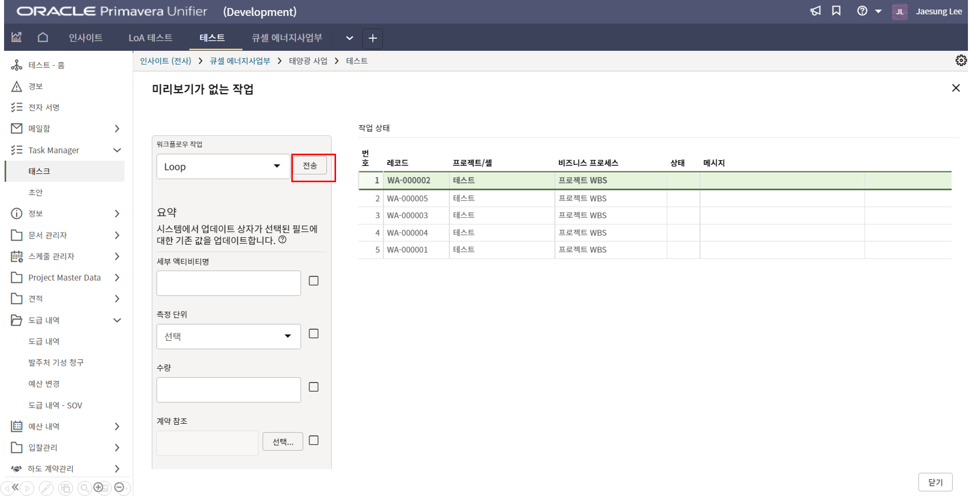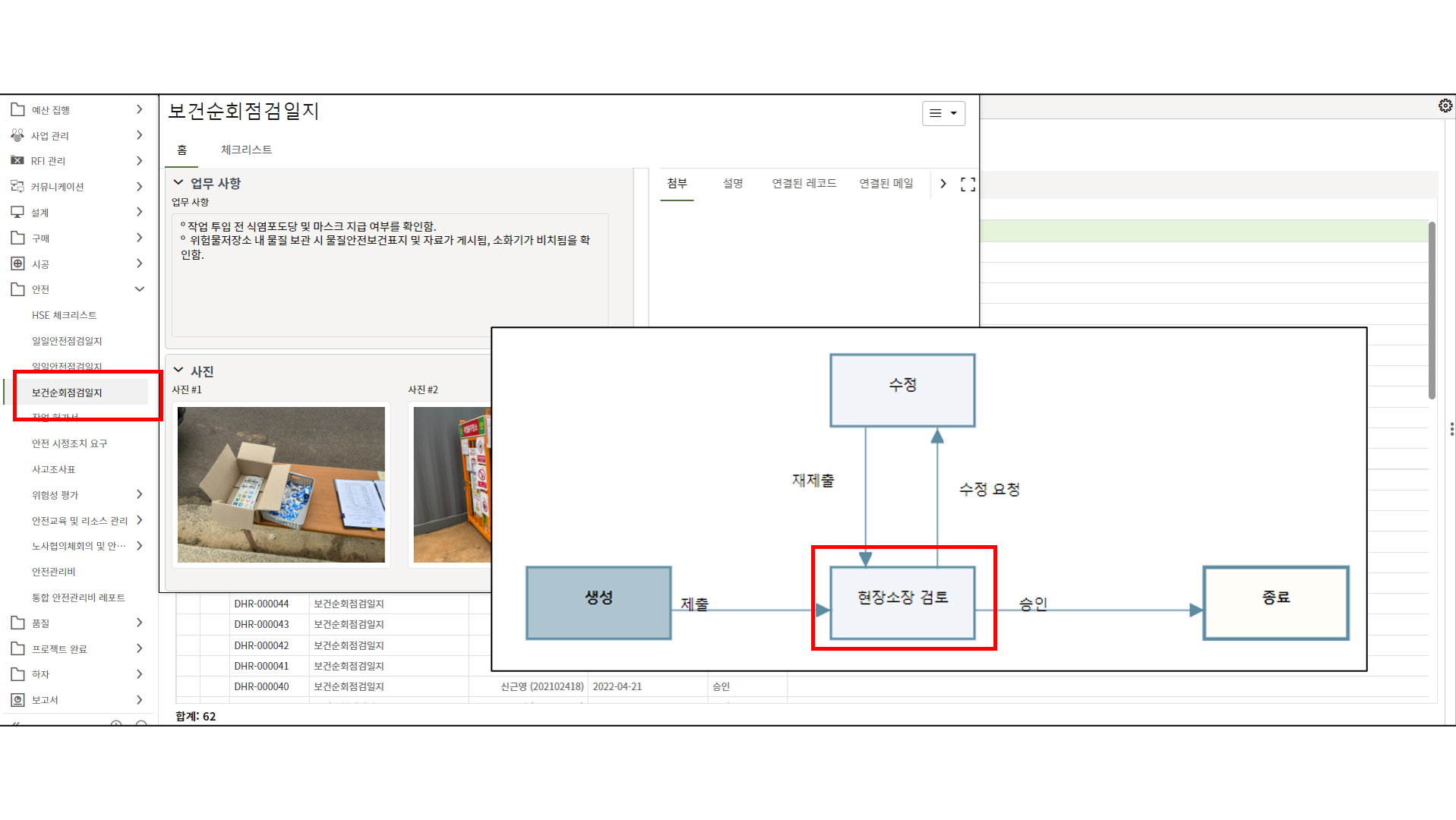 2.현장소장에게 할당된 태스크를 클릭하여 내용을 검토 후 전송버튼을 클릭합니다.