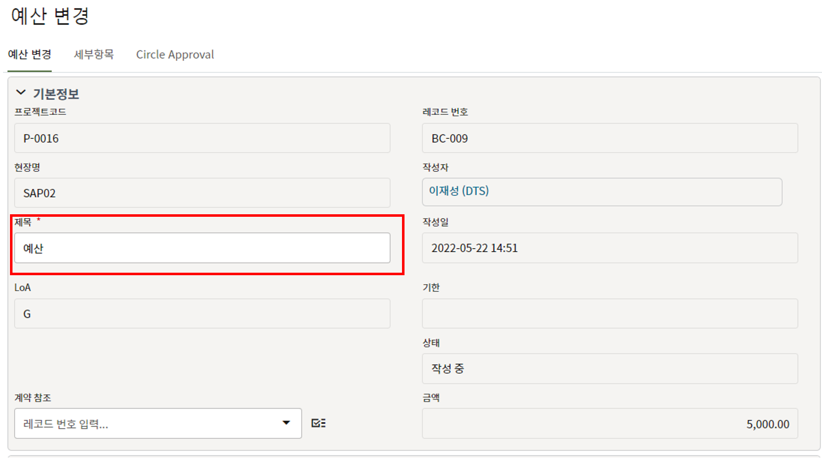 예시) 제목을 "예산변경 1차"로 한 경우 Circle 전자결재 품의서 제목 : "OOO 프로젝트 예산변경 1차"