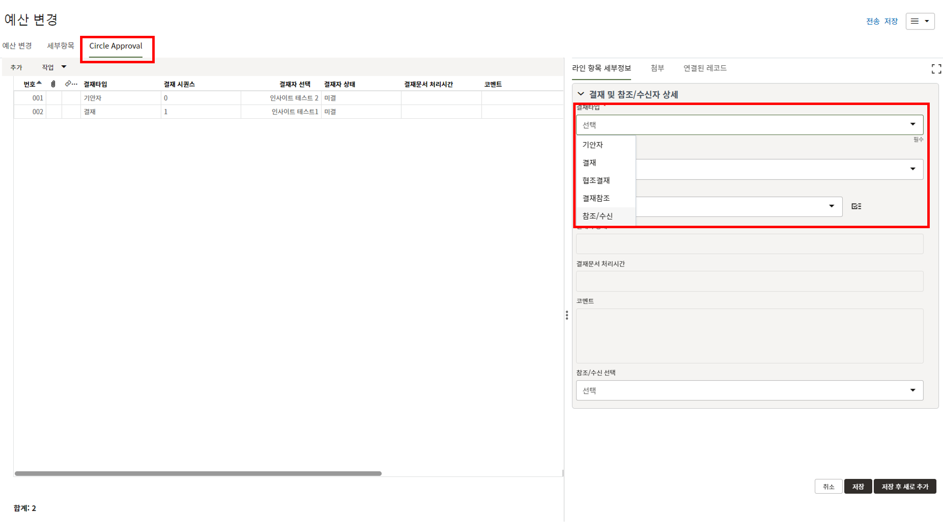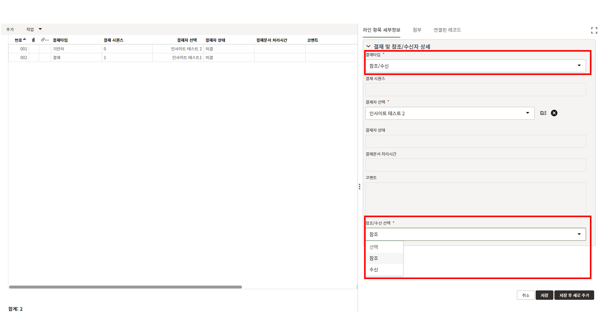 4. 참조/수신이 필요한 경우 결재타입을 참조/수신으로 선택한 뒤 참조/수신 선택에서 값을 선택합니다.