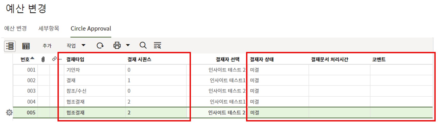 결재자 상태, 결재문서 처리시간, 코멘트 등을 Circle에서 결재가 진행되면서 업데이트 됩니다.