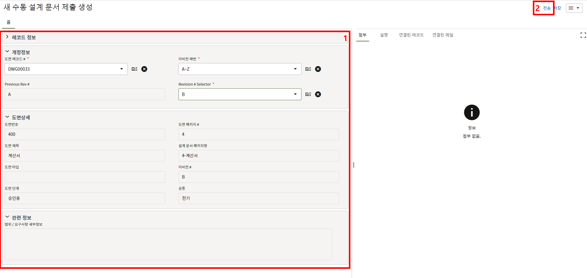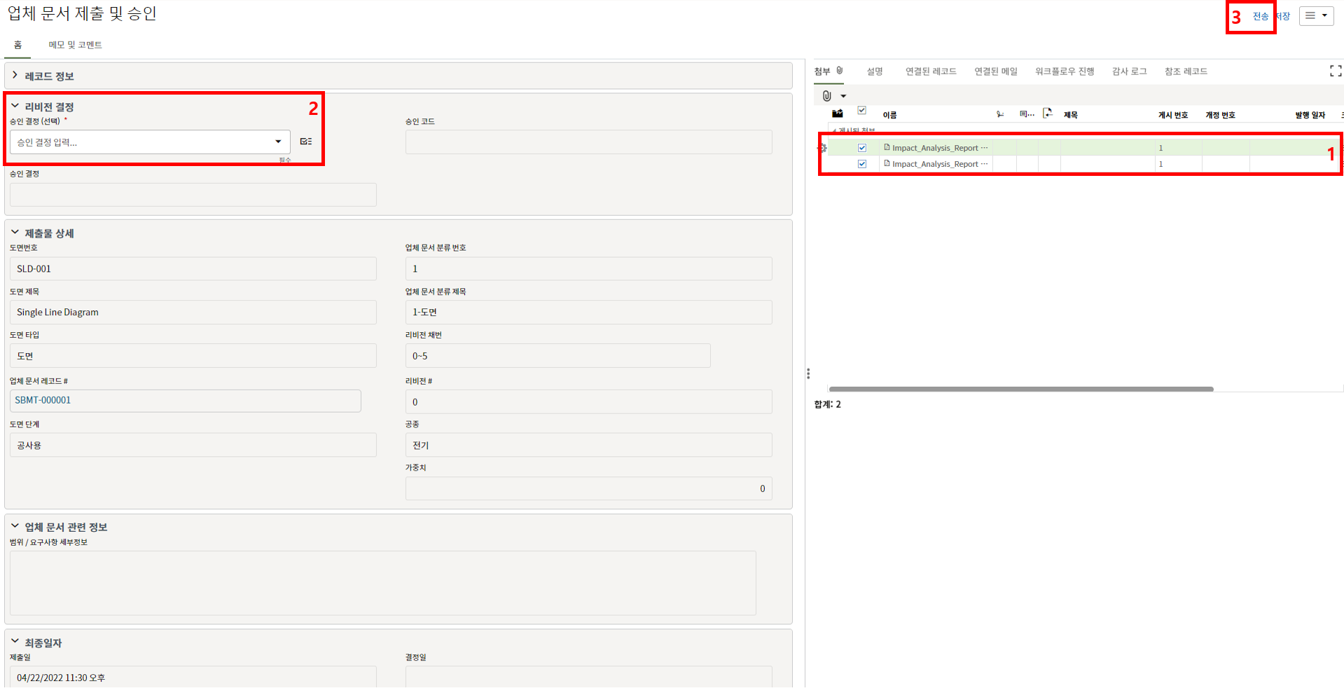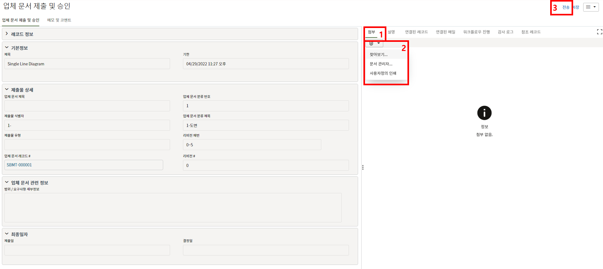3. 문서 정보를 확인한 후 제출할 문서를 첨부하고, "전송" 버튼을 눌러 한화솔루션 담당자(AE)에게 제출합니다.