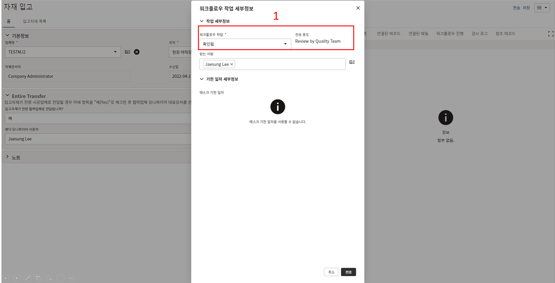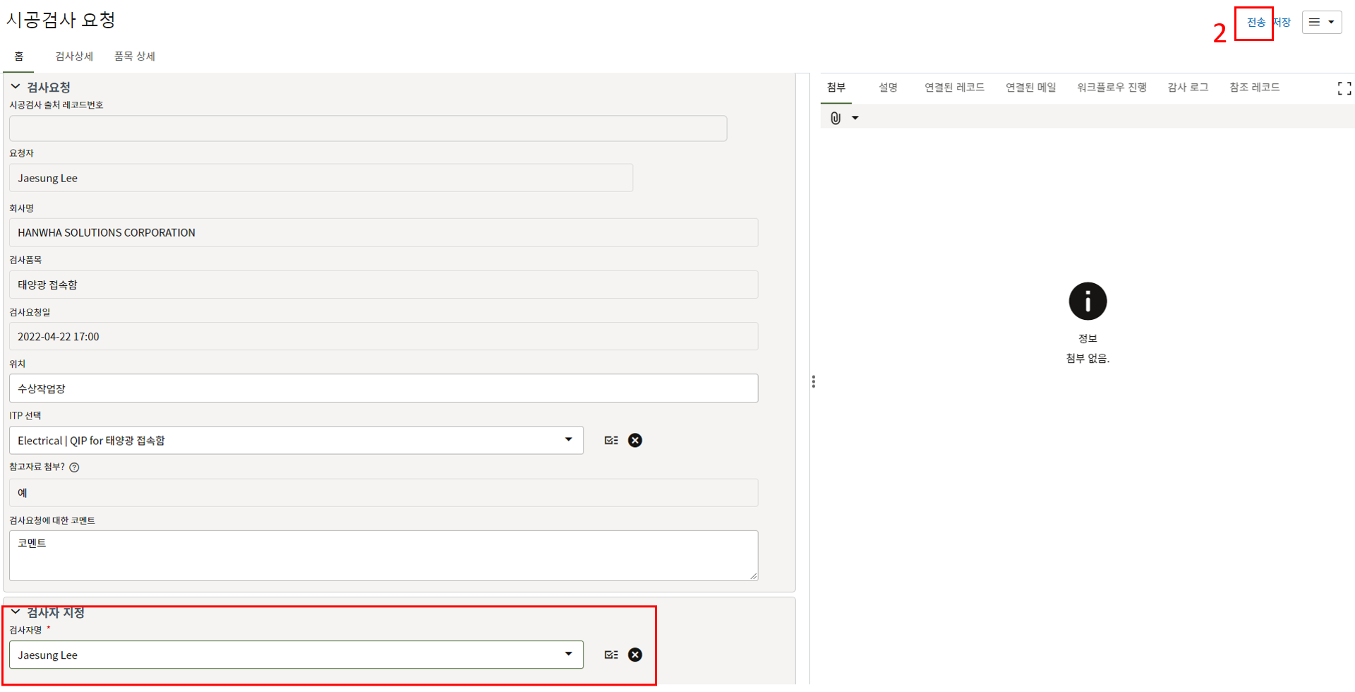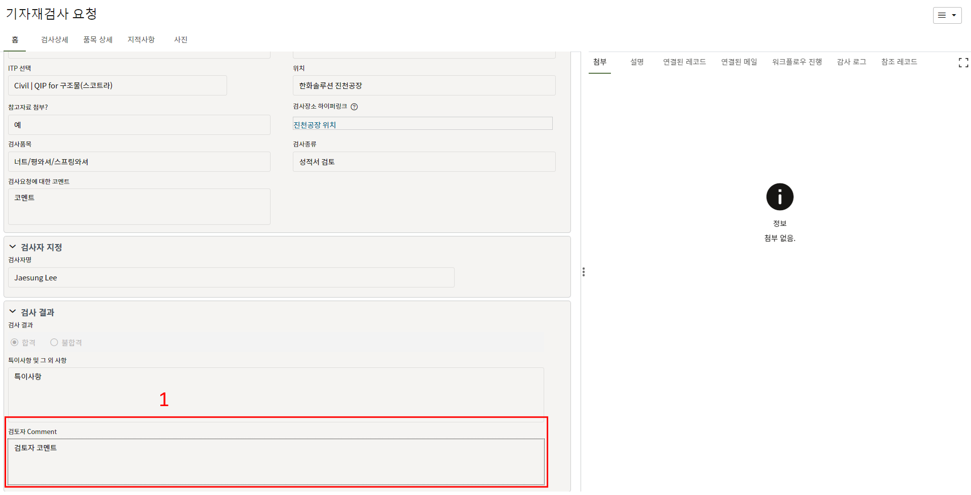 9. 검사요청을 받은 품질담당자는 첨부자료 확인, 코멘트 및 검사자를 지정하여 검사자에게 전송합니다.