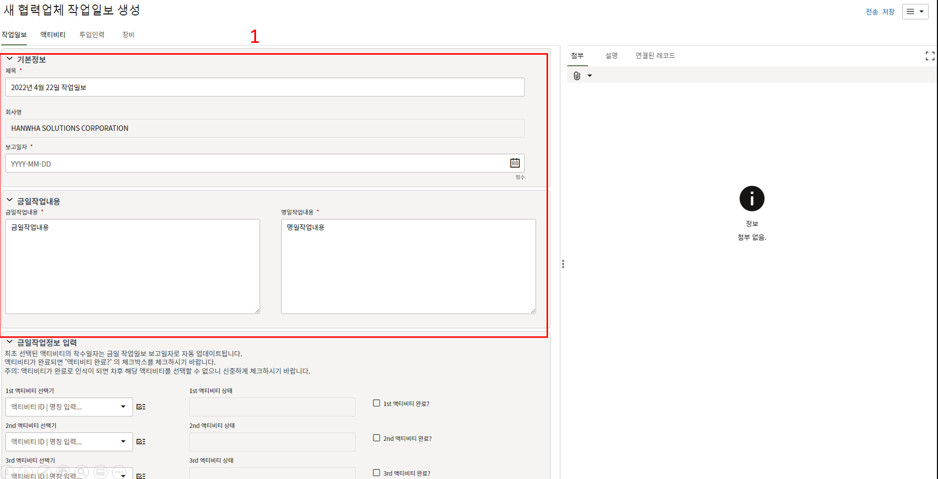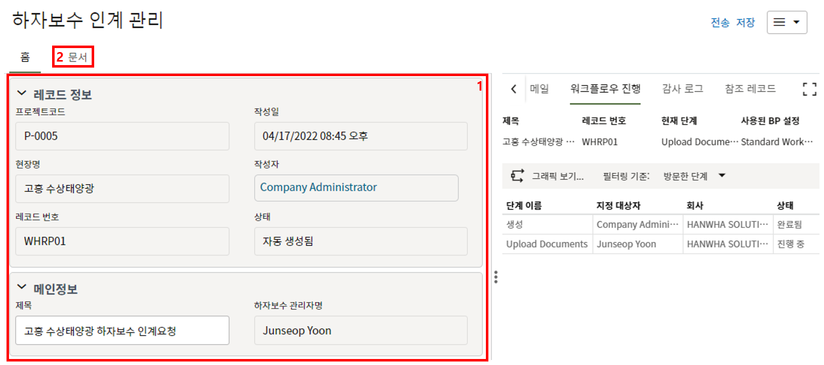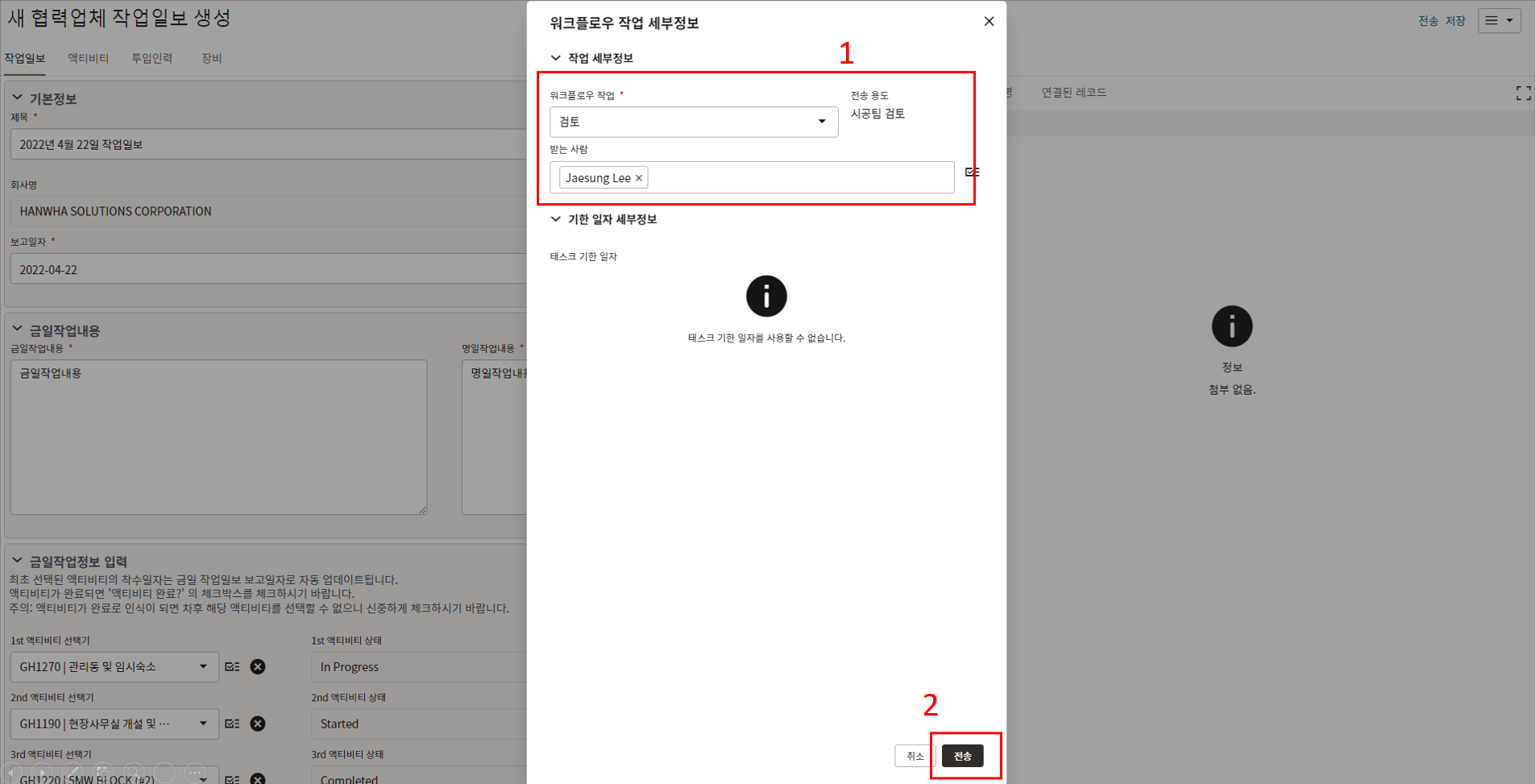 10. 작업일보 작성이 완료되면 검토/승인을 위해 한화솔루션 시공팀에게 전송합니다.