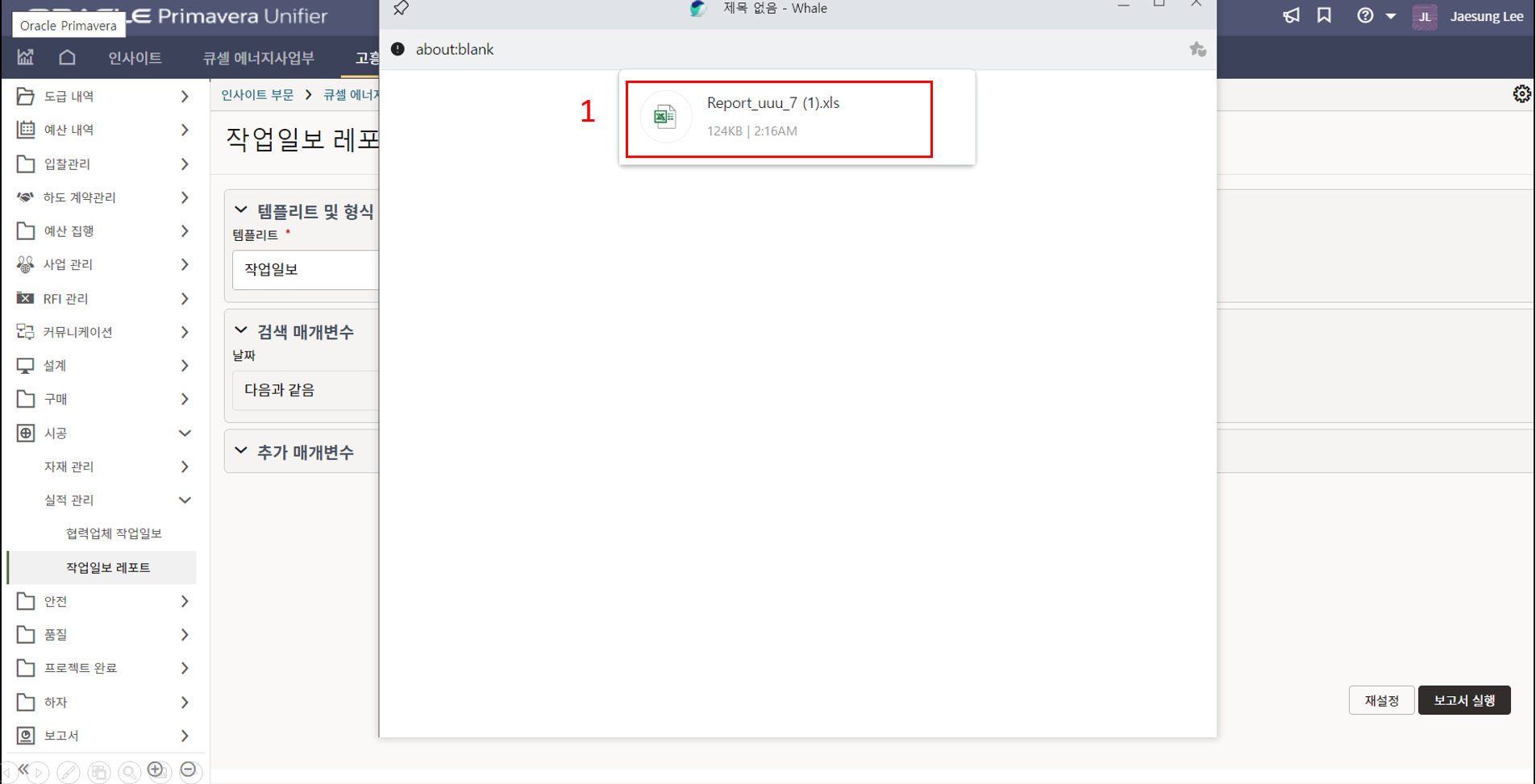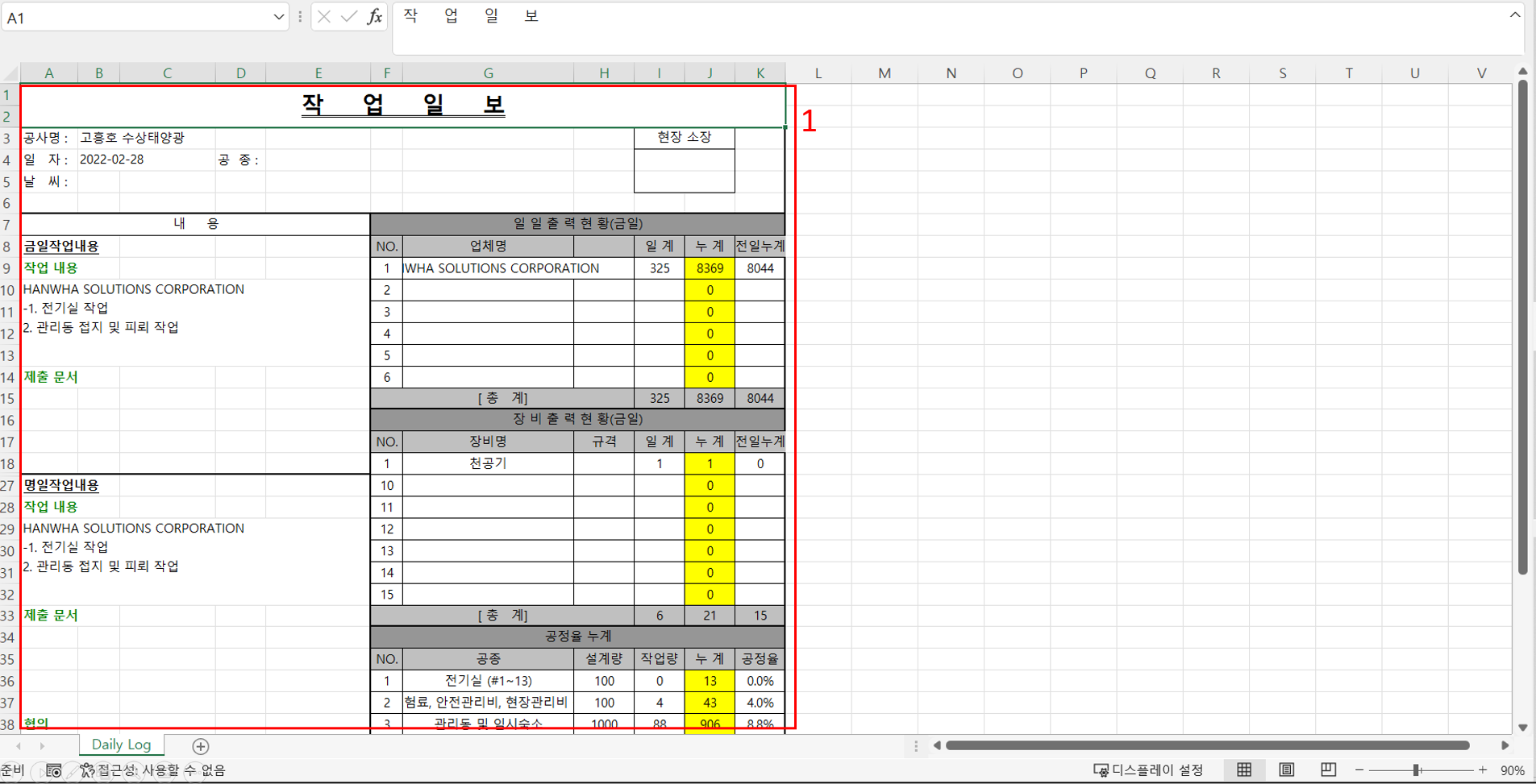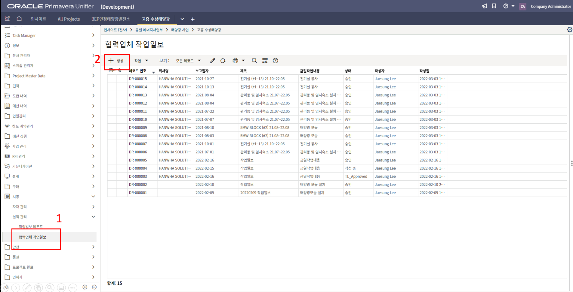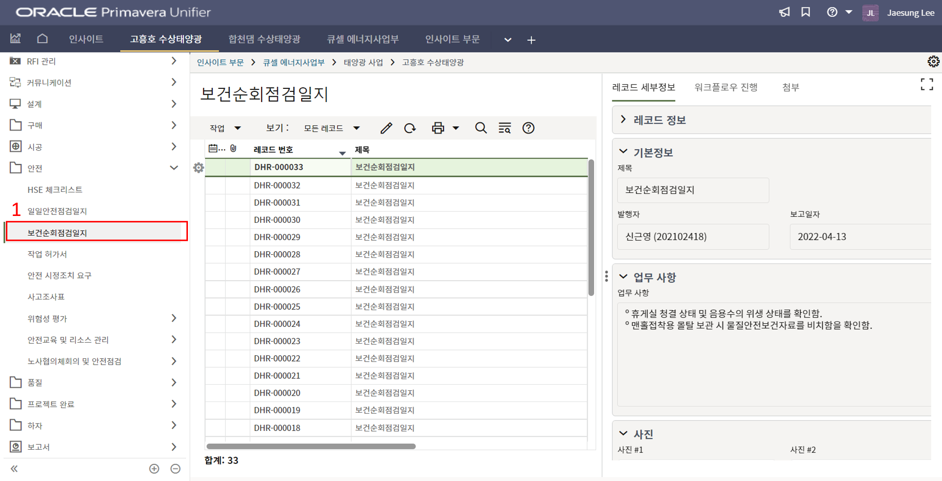 10. 작업일보 작성이 완료되면 검토/승인을 위해 한화솔루션 시공팀에게 전송합니다.