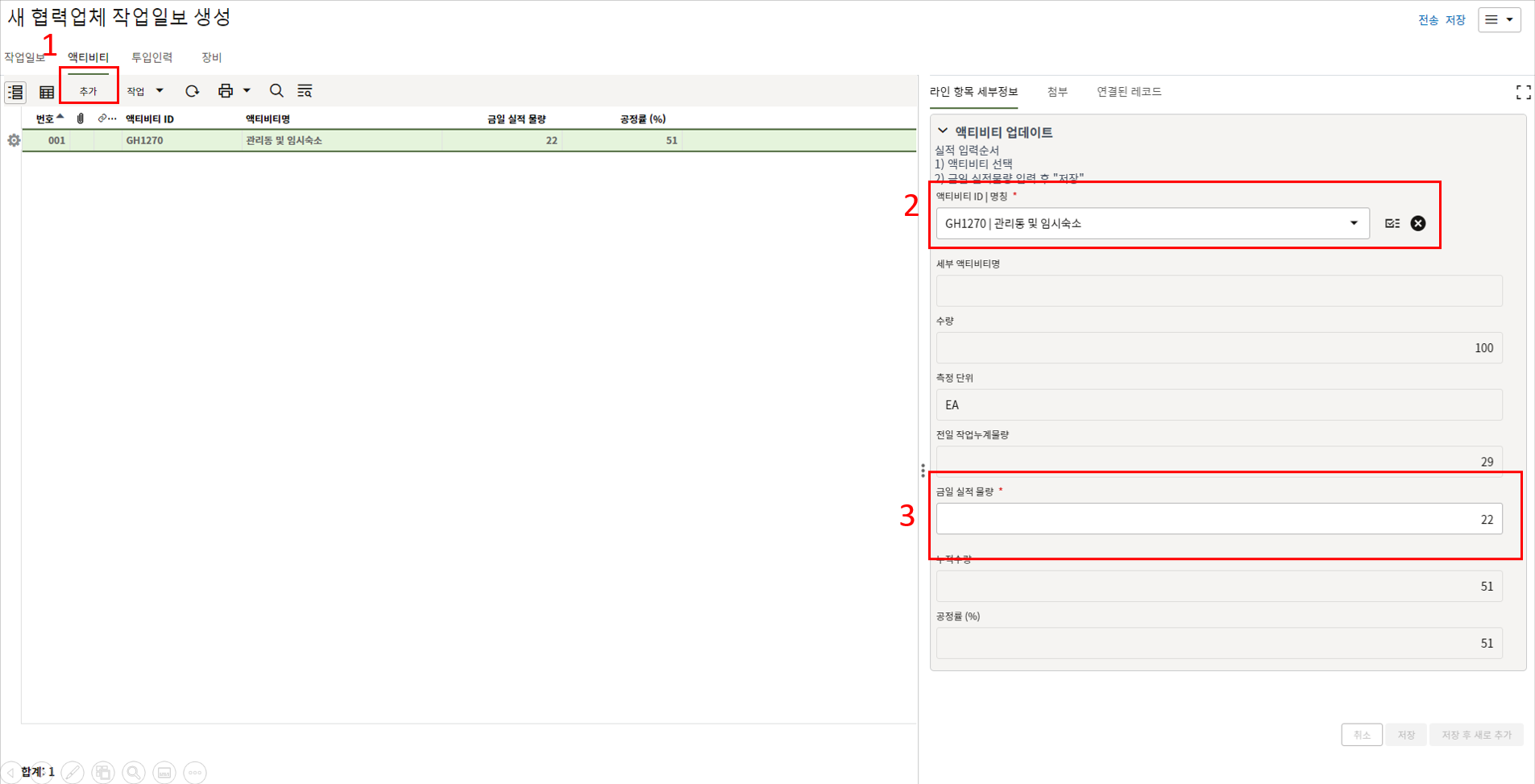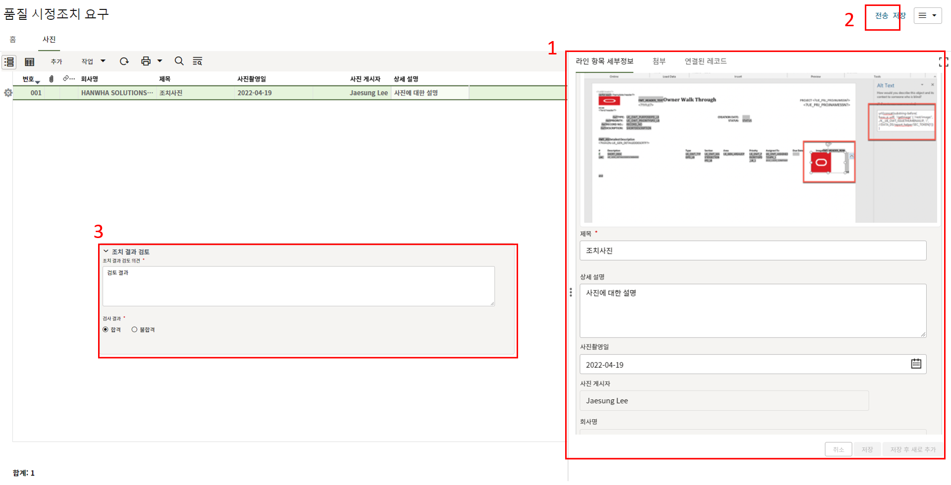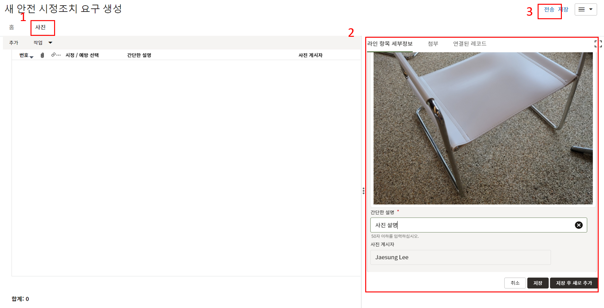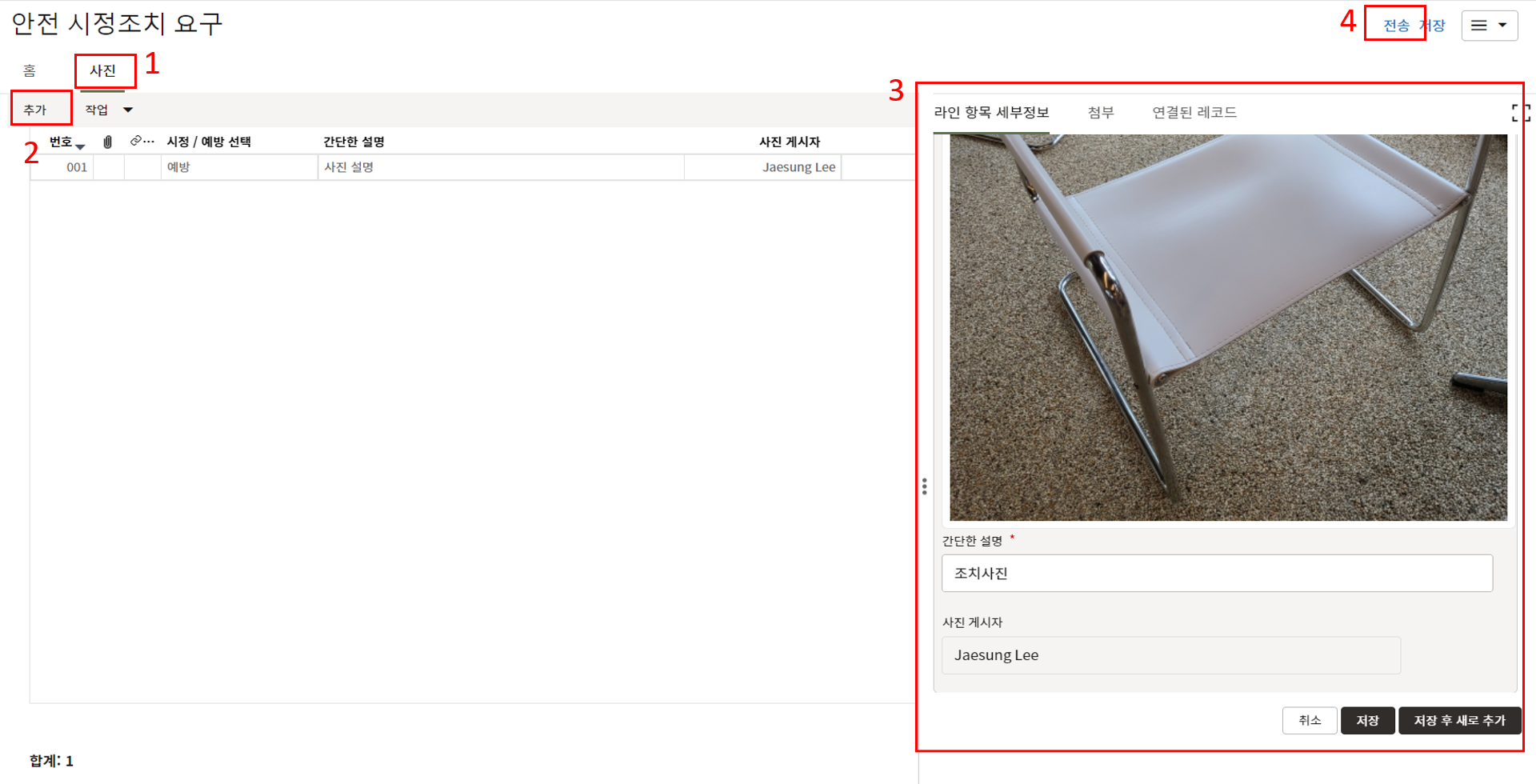 2. 해당 레코드의 1) "사진" 탭에서 2) "추가" 버튼을 클릭하여 3) 조치 사진을 업데이트를 하고