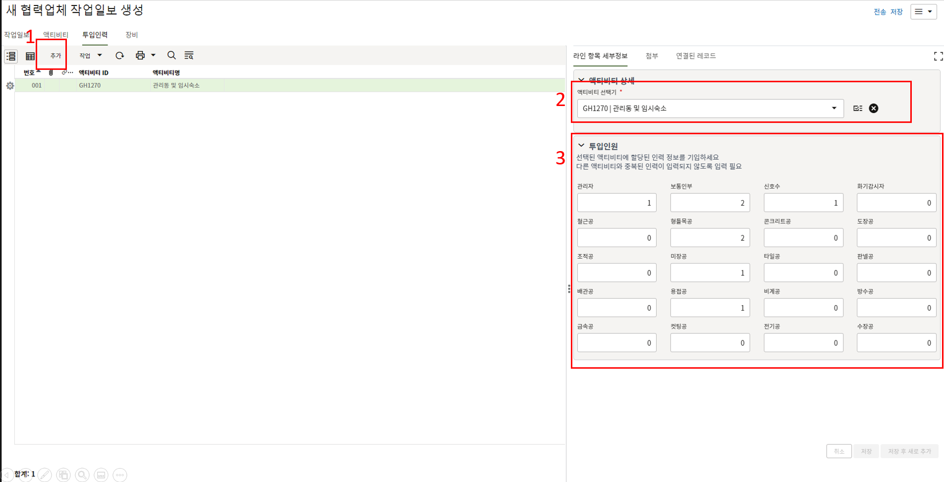 6. 이 화면은 "하위 입력폼" 화면입니다. (하위 입력폼 탭은 메뉴에 따라 여러개가 존재할 수 있습니다.)