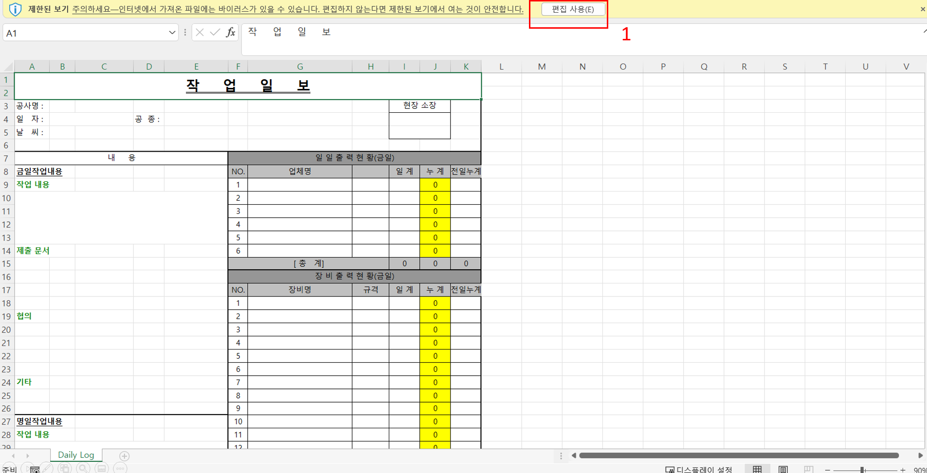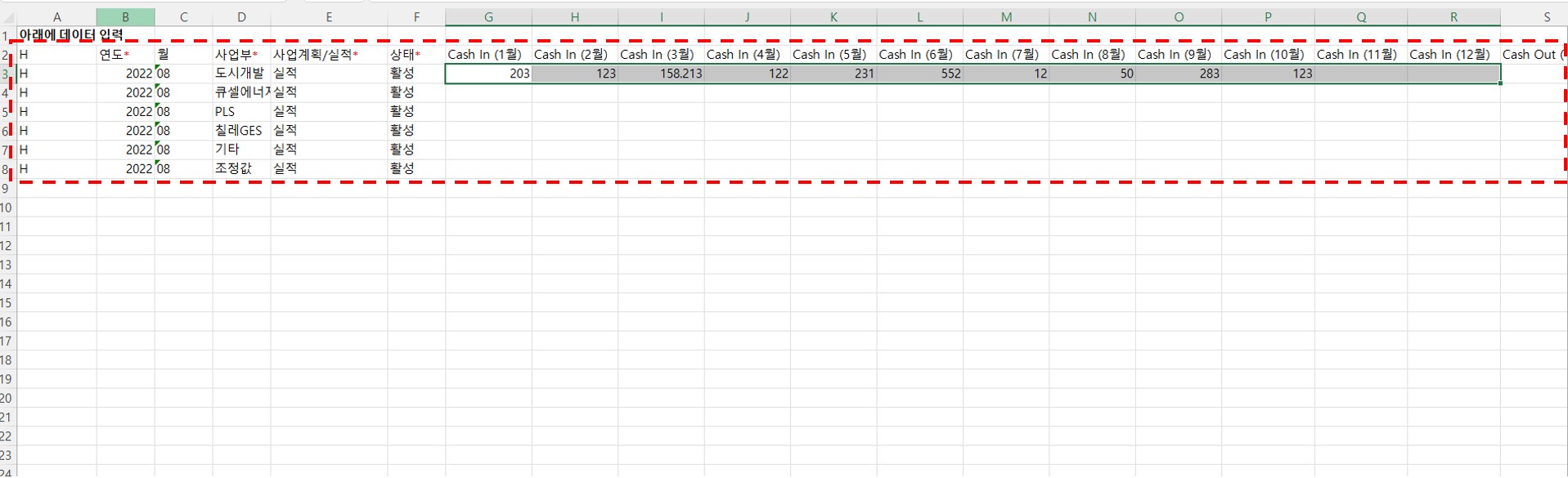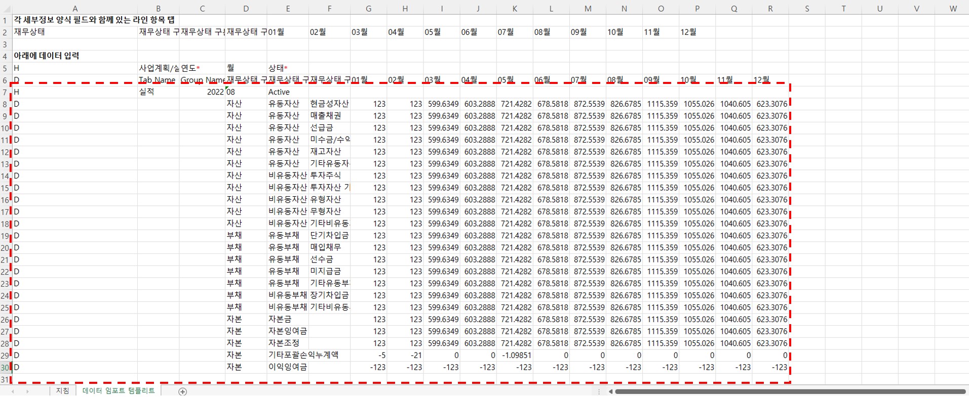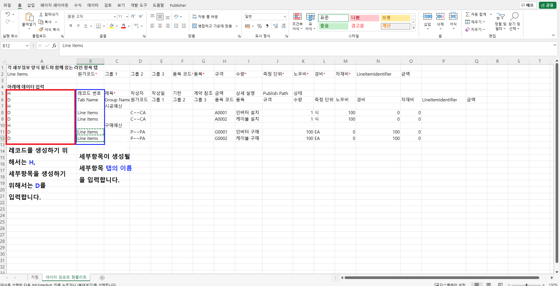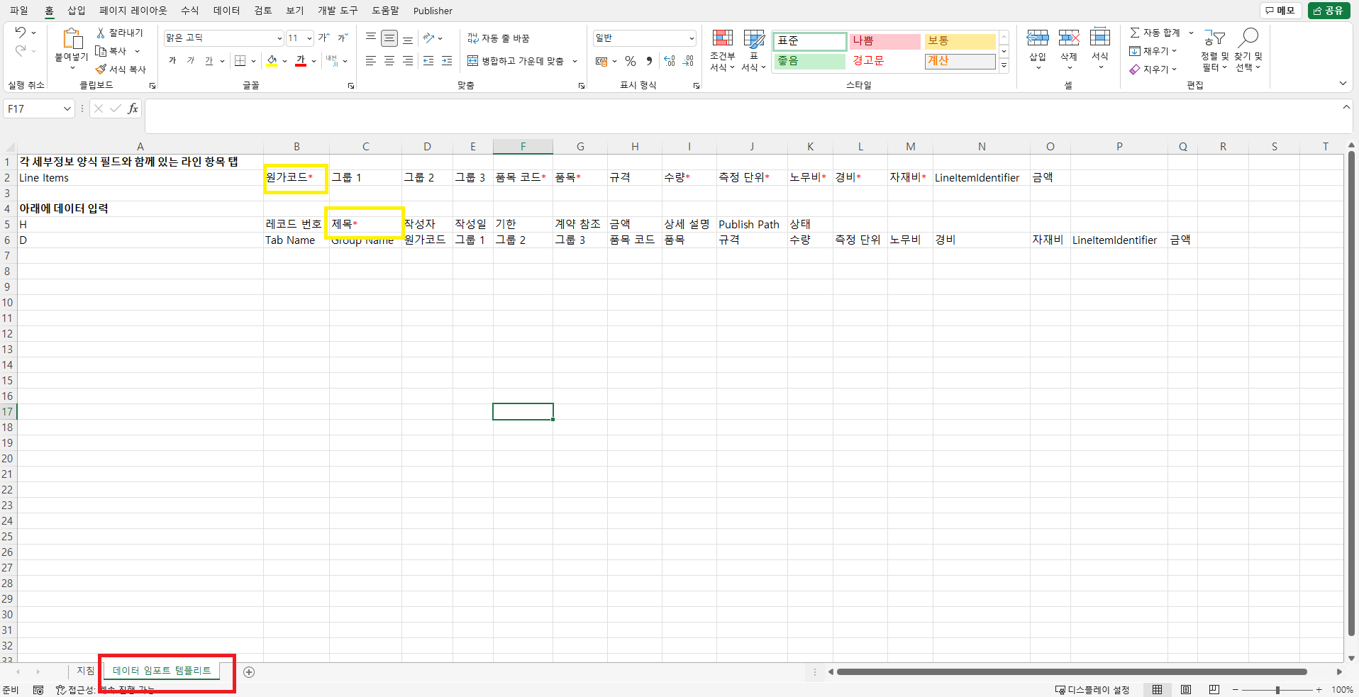 2. 엑셀을 열어 '데이터 임포트 템플리트' 시트로 들어갑니다.