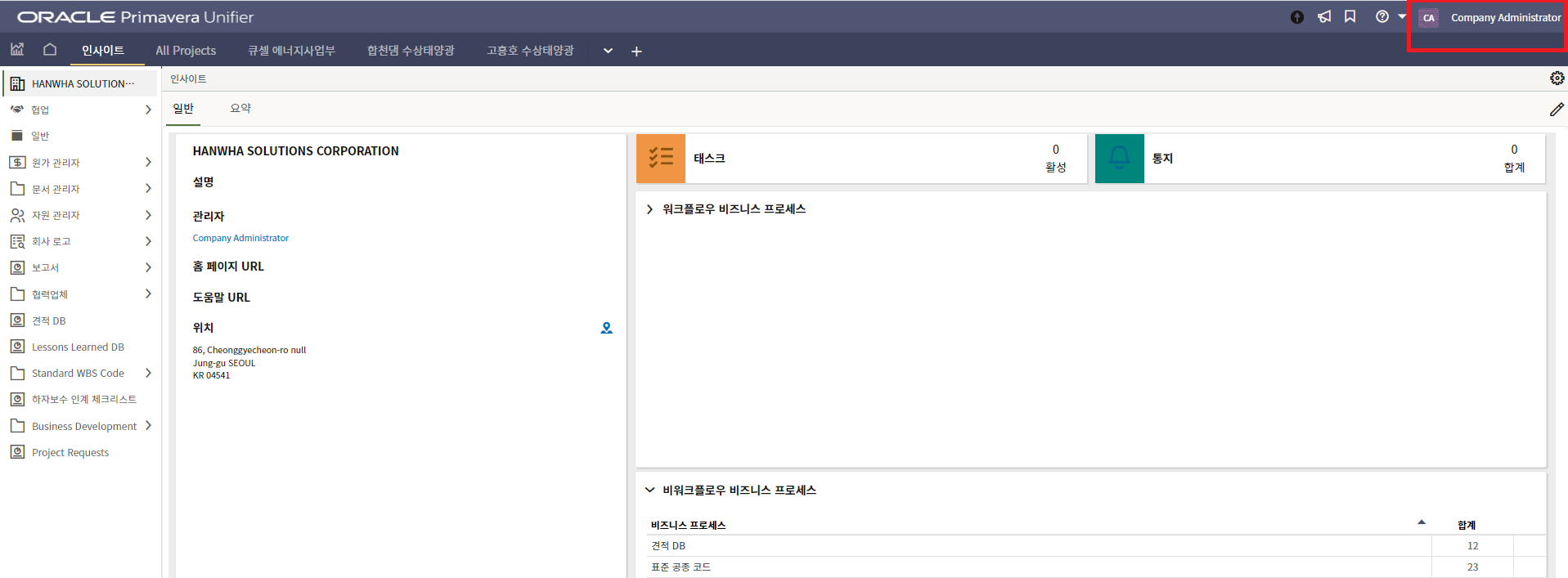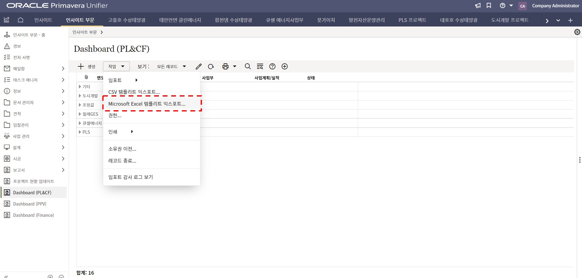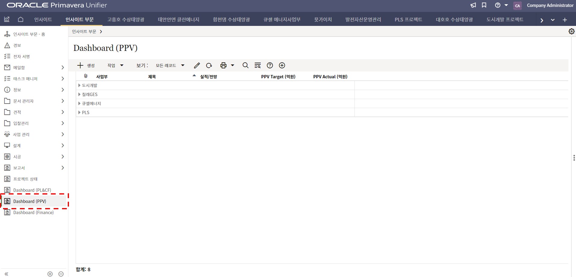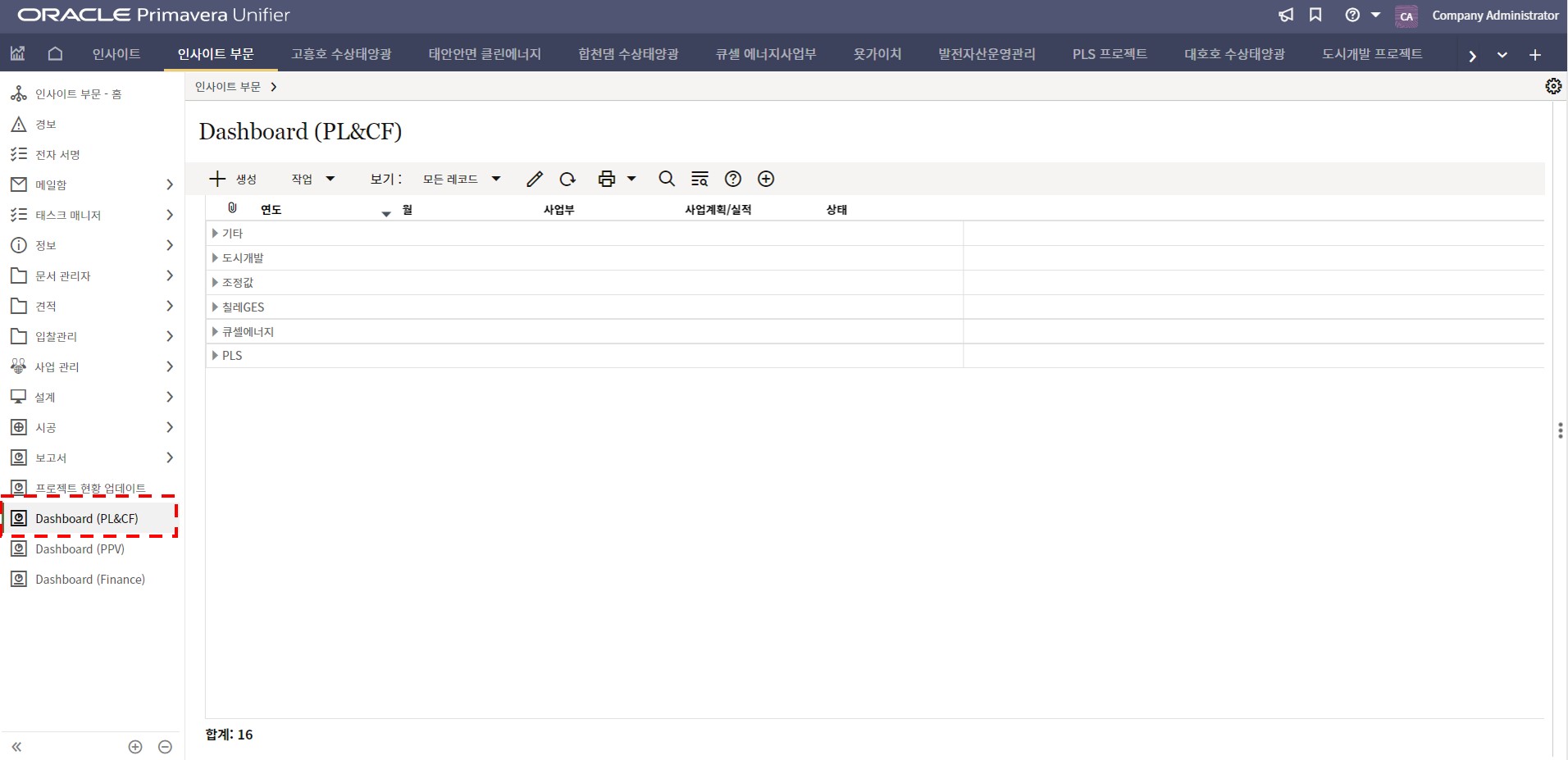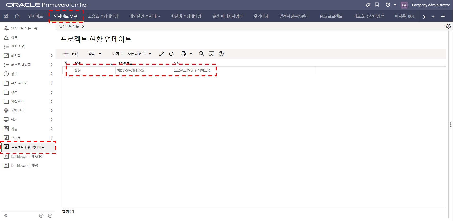 1. 인사이트 부문에서 프로젝트 현황 메뉴를 선택합니다.