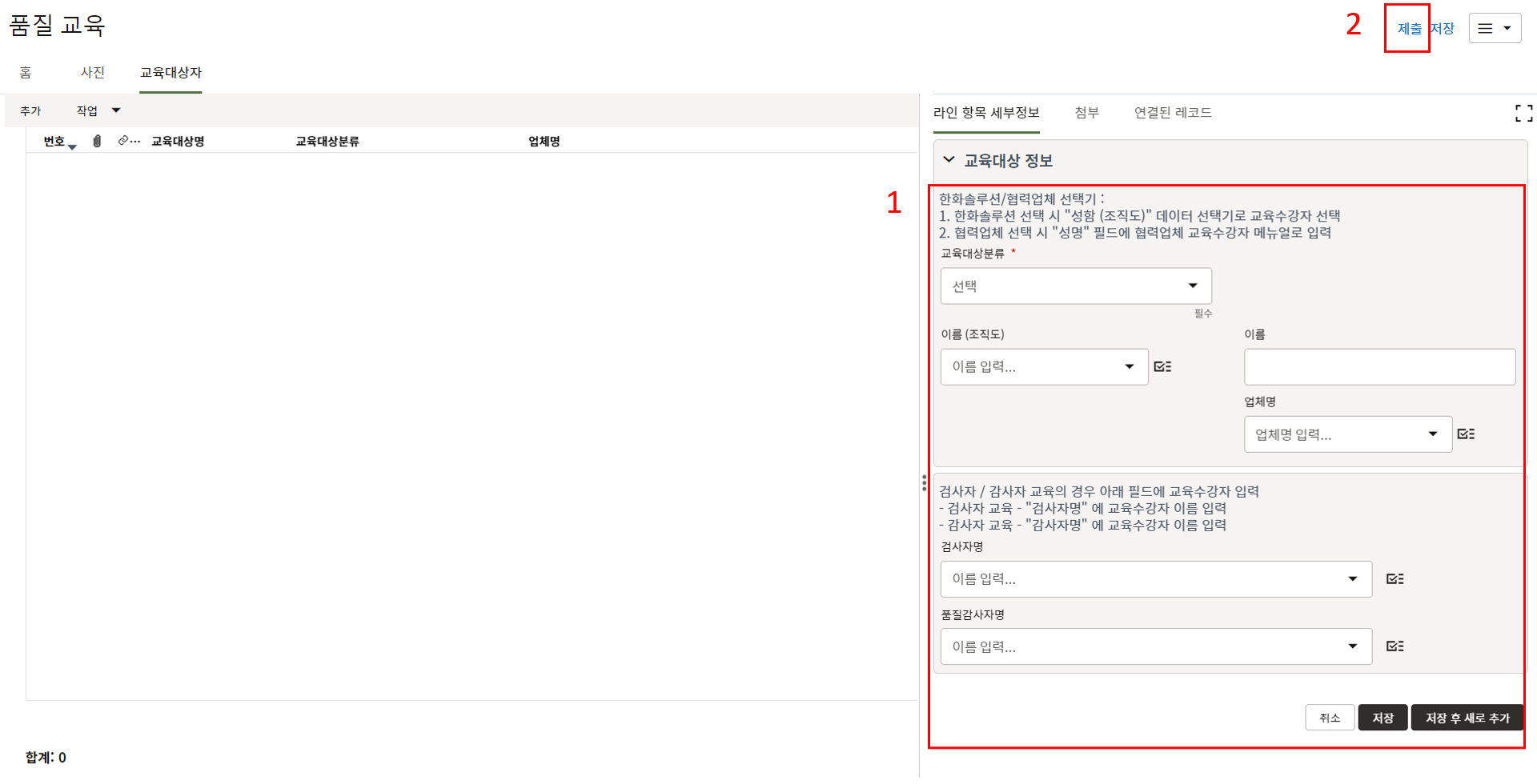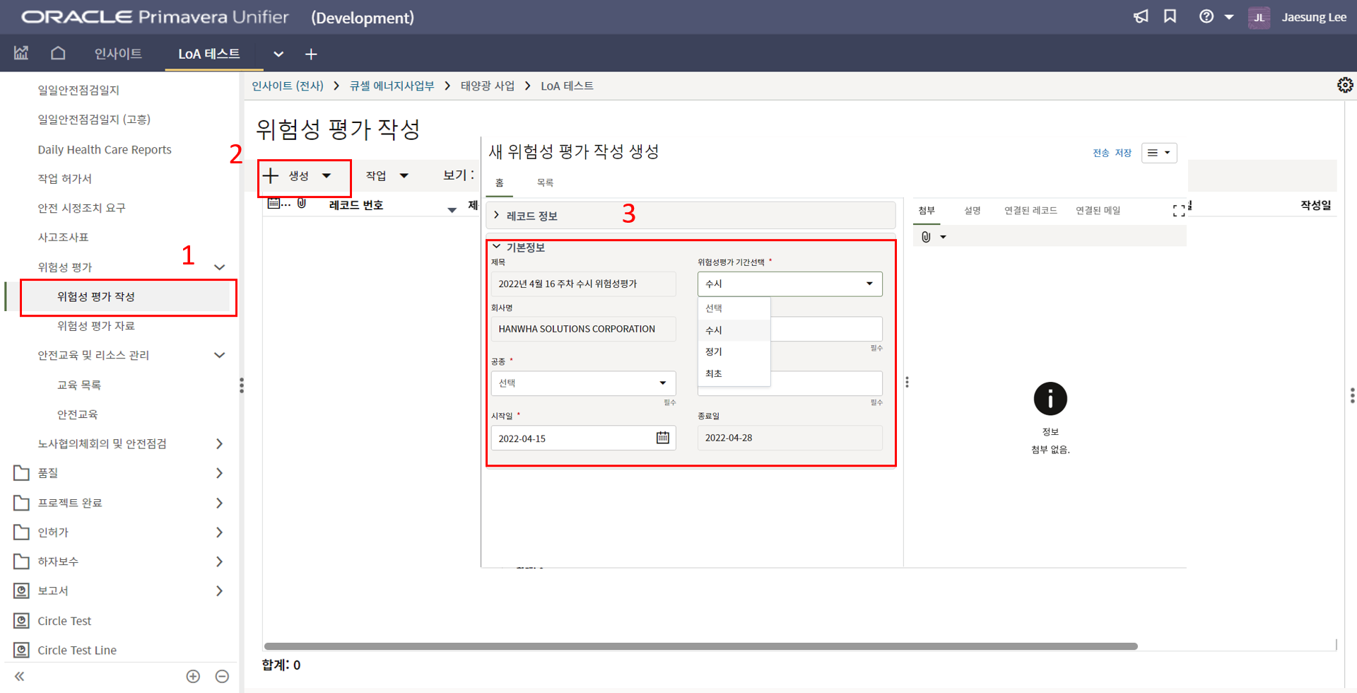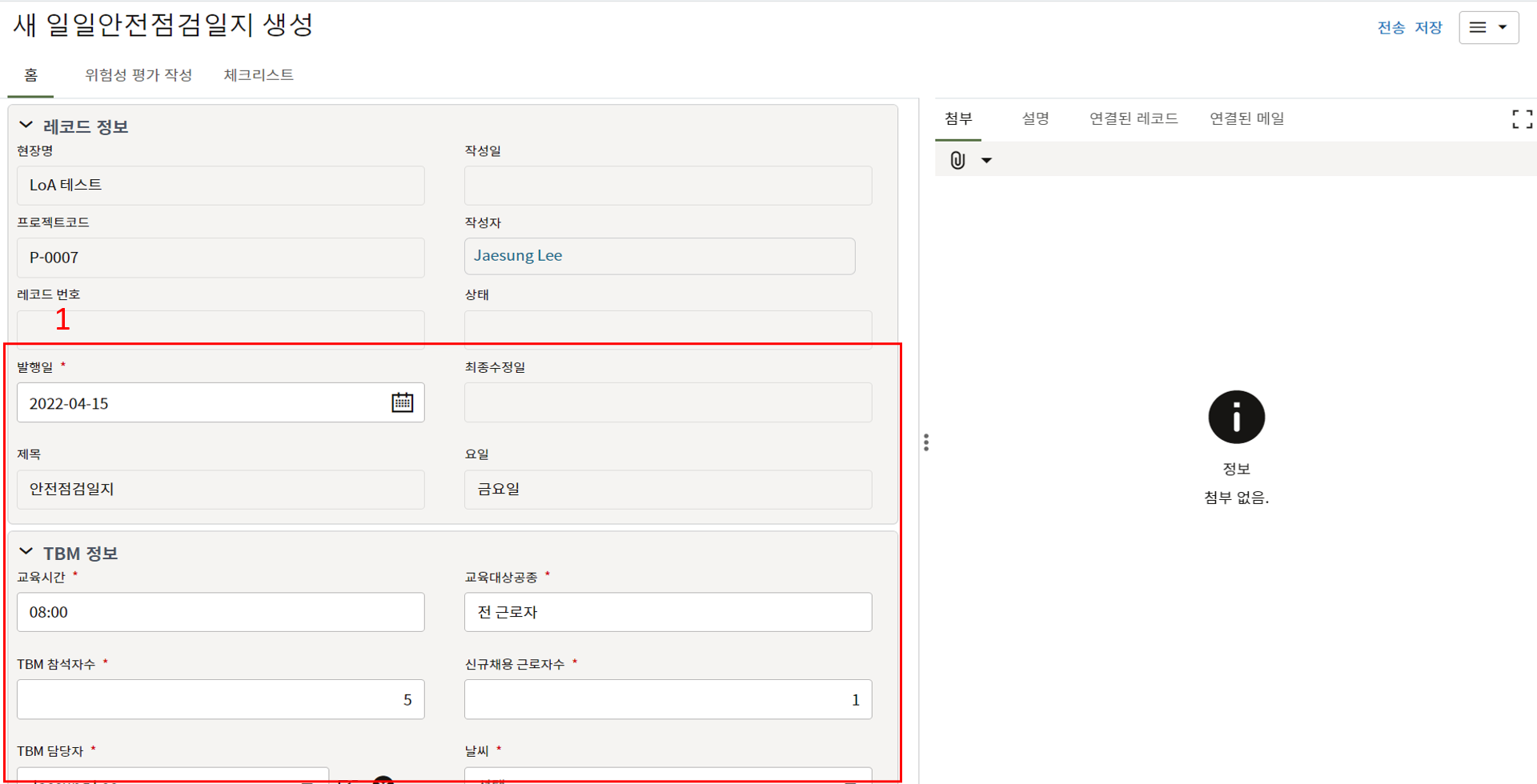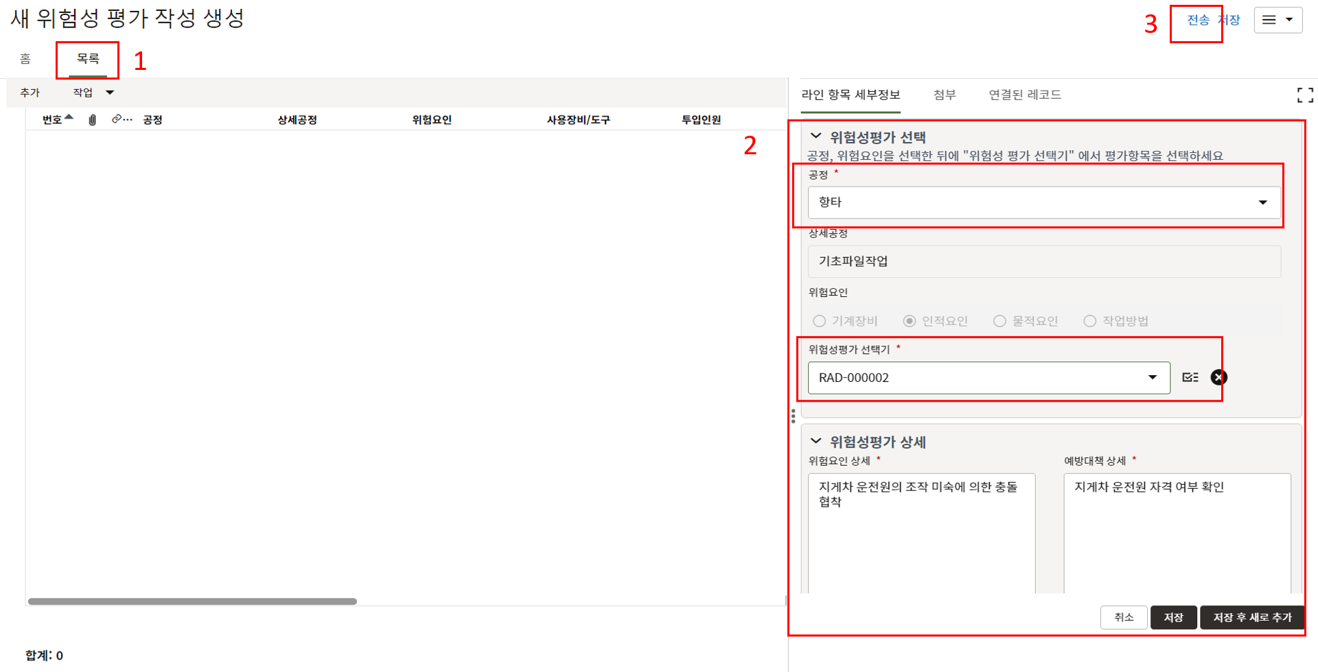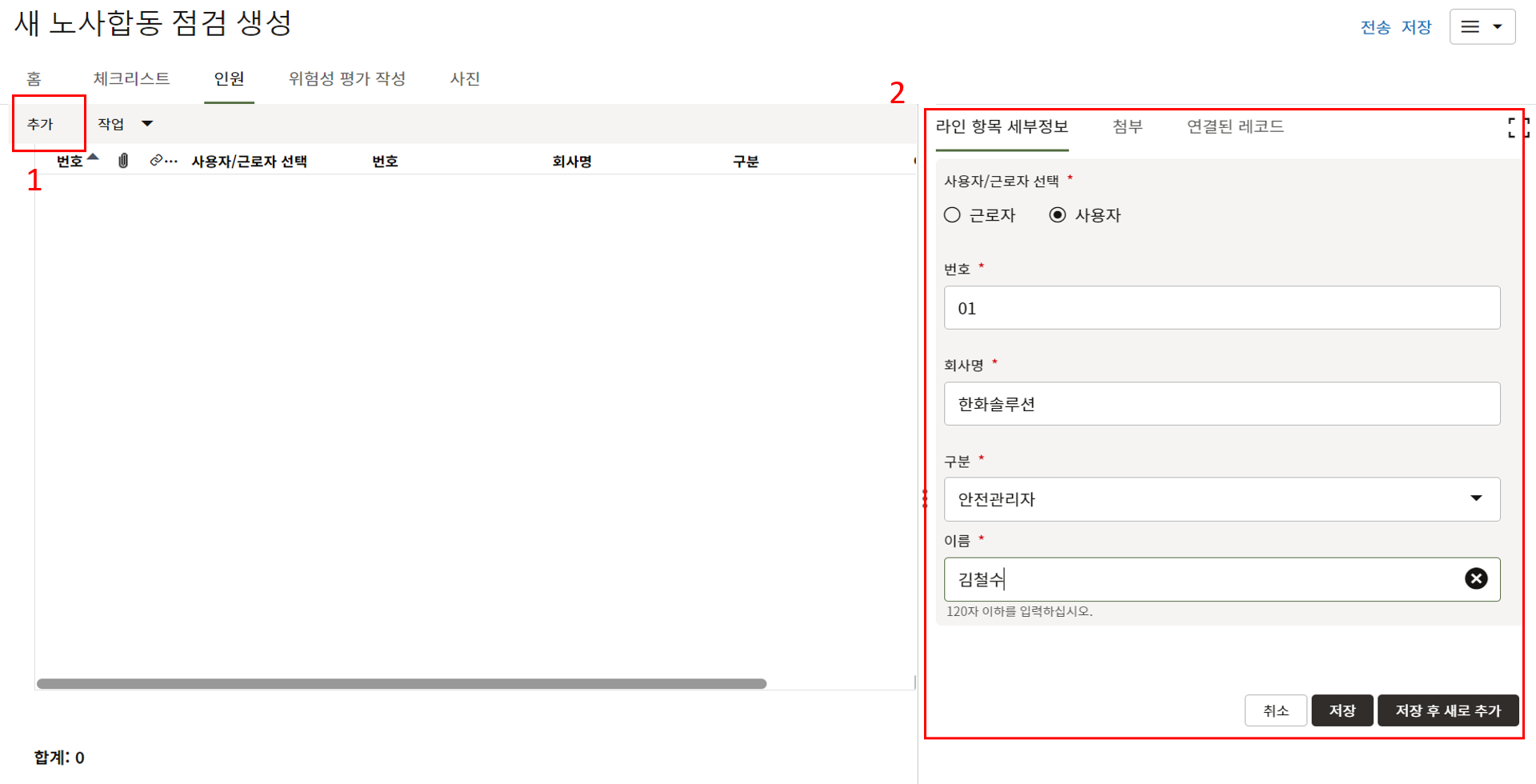 3. 상위 양식을 채운 후 한화솔루션 안전 팀장 검토를 위해 전송합니다.